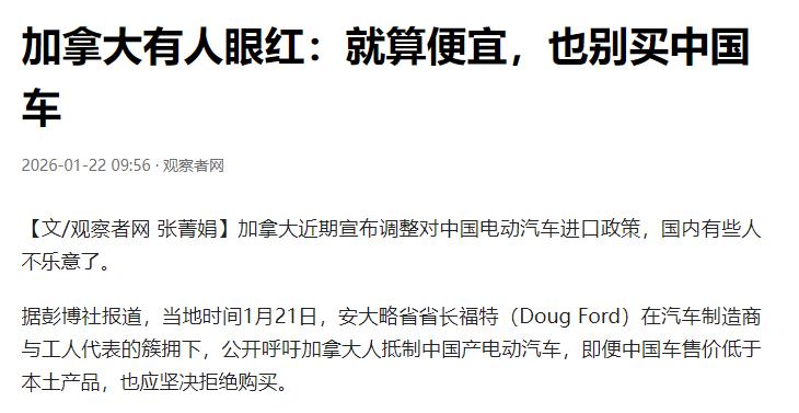 加拿大总理恐怕做梦也没想到,跟中国签完协议扭头回家,迎接他的不是掌声,而是全国最大省份的公开“宣战”!安大略省省长带头就要抵制中国车。 这事说起来真够魔幻的,2026年1月初,总理卡尼带着高规格代表团访华,这是加拿大总理八年来头一回访华。四天行程里,双方敲定了“电车换油菜籽”的合作协议,本来是件互利共赢的事。 协议内容很明确。中方把加拿大油菜籽进口关税从85%下调到约15%,解了加国农业的燃眉之急。加方则取消中国电动车100%的额外关税,改成每年4.9万辆的进口配额,配额内只收6.1%的正常关税,五年内配额还会涨到7万辆。 卡尼本以为这笔买卖能给自己攒足声望,毕竟既救了农业,又能带动汽车产业转型。可他刚落地回国,安大略省省长福特就直接跳出来拆台。 福特在记者会上公开呼吁加拿大人抵制中国产电动汽车,哪怕中国车卖得比本土车便宜,也坚决不能买。他还扯出荒唐理由,声称中国电动汽车会“监听安大略省居民通话”,用这种没根据的谣言抹黑中国车。 当场就有记者怼他,说他口袋里的苹果手机产自美国,怎么不担心被美国监听。福特被问得前言不搭后语,支支吾吾说不出一句像样的回应。明眼人都能看出来,所谓的“监听”就是借口,他根本没拿得出手的反对理由。 安大略省是加拿大的汽车心脏,集中了全国90%的汽车产业,9万多从业者的饭碗都和这个行业绑在一起。福特一直以“本土产业保护者”自居,这次跳出来抵制,表面上是怕中国车抢了本土车企的生意,实则另有算盘。 其一就是党派之争。卡尼领导的自由党靠这份对华合作协议声望上涨,福特所在的进步保守党作为在野党,眼看选举形势不利,只能靠制造“中国威胁论”转移焦点,收割政治资本。拿中国电车说事,既能讨好本地车企,又能煽动部分民众情绪,简直是典型的选举操弄。 其二是怕得罪美国。加拿大汽车业90%的产品都靠出口美国,现在特朗普政府对加拿大汽车产业态度极强硬,不仅加征乘用车关税,还施压车企把业务转移到美国。福特心里清楚,要是加拿大对中国电动车敞开大门,美国大概率会以《美墨加协定》为由报复,断了安大略省的财路。他不敢跟美国硬刚,就只能拿中国车当替罪羊。 还有个关键问题,加拿大本土汽车产业本身就烂泥扶不上墙。本土车企成本比中国车高18%,却始终不思进取,不搞技术升级,只想着靠政府补贴和贸易保护躲竞争。中国电动车不仅价格低40%以上,还针对加拿大严寒气候优化了续航,换电、智能驾驶这些技术更是本土车没有的。 就算没有中国车进来,加拿大汽车业也早已陷入困境。过去一年里,通用汽车关闭了安大略省的奥沙瓦老厂,732名工人失业。Stellantis公司原定在万锦市的混动生产线,直接改道美国田纳西州。工厂门口的“加拿大制造”铜牌,被工人用马克笔涂黑,看着都让人心酸。 更讽刺的是,福特嘴里喊着“保护本土产业”,却对本土车企的摆烂视而不见。加拿大汽车制造商协会主席金斯顿,跟着福特一起反对降关税,还声称中国车企有“政府大规模补贴”,却绝口不提本土车企靠政府补贴苟活的事实。 民意其实早就给出了答案。Nanos Research和CTV电视新闻网的联合民调显示,62%的加拿大受访者对“取消中国产汽车100%关税”持支持或倾向支持态度。老百姓心里门儿清,买中国车能省钱,还能用到更先进的技术,没必要为了所谓的“本土情怀”多花冤枉钱。 卡尼政府本来想靠和中国合作,让加拿大汽车业摆脱对美国的依赖,实现转型。毕竟加拿大2025年第三季度新注册零排放车辆份额还不到10%,纯电动汽车新车注册量降幅更是达到52.3%,再不找新出路,这个行业只会彻底垮掉。 可福特的抵制,直接打乱了整个计划。现在加拿大陷入两难境地,一边是民众对高性价比中国车的需求,一边是地方政客和落后车企的施压,还有美国虎视眈眈的报复威胁。 说到底,抵制中国车根本不是保护本土产业,而是帮着落后产能躲竞争。加拿大要是一直抱着美国的大腿,不敢直面自己的产业短板,就算挡住了中国电动车,也解决不了本土车企成本高、转型慢的问题,2035年禁售燃油车的目标只会更难实现。 中加这份合作协议,本来是给双方都递了台阶。中方能扩大海外市场,加方既能解决农业出口难题,又能借中国技术带动汽车产业升级。可偏偏有人想靠搞政治操弄、煽动对立谋私利,最后坑的还是加拿大普通民众和整个国家的发展。