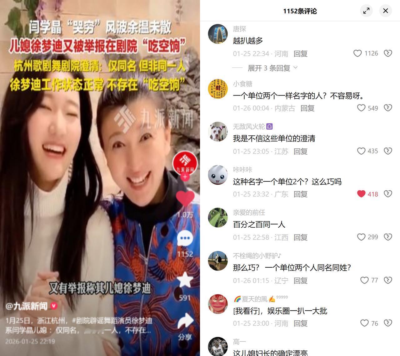 同名徐梦迪风波,暴露的何止是巧合质疑? 杭州歌剧舞剧院辟谣,院里的徐梦迪和闫学晶儿媳只是同名,不存在吃空饷。但大家几乎清一色:不信。 没人纠结同名概率,纠结的是心里那道坎。 过去曝光的吃空饷、萝卜坑事件,早把大家对事业单位的信任磨薄了,总有人借着关系占编制、拿福利,让埋头干活的人吃亏。 现在只要沾名人亲属、体制编制的边,质疑的本能就先冒出来。这种认知惯性,针对的并非某个人,更多是怕特权钻空子,怕公平被打折扣。 说到底,大家要的从来都不只揪谁的错,渴望的是:规则面前,真的人人平等。