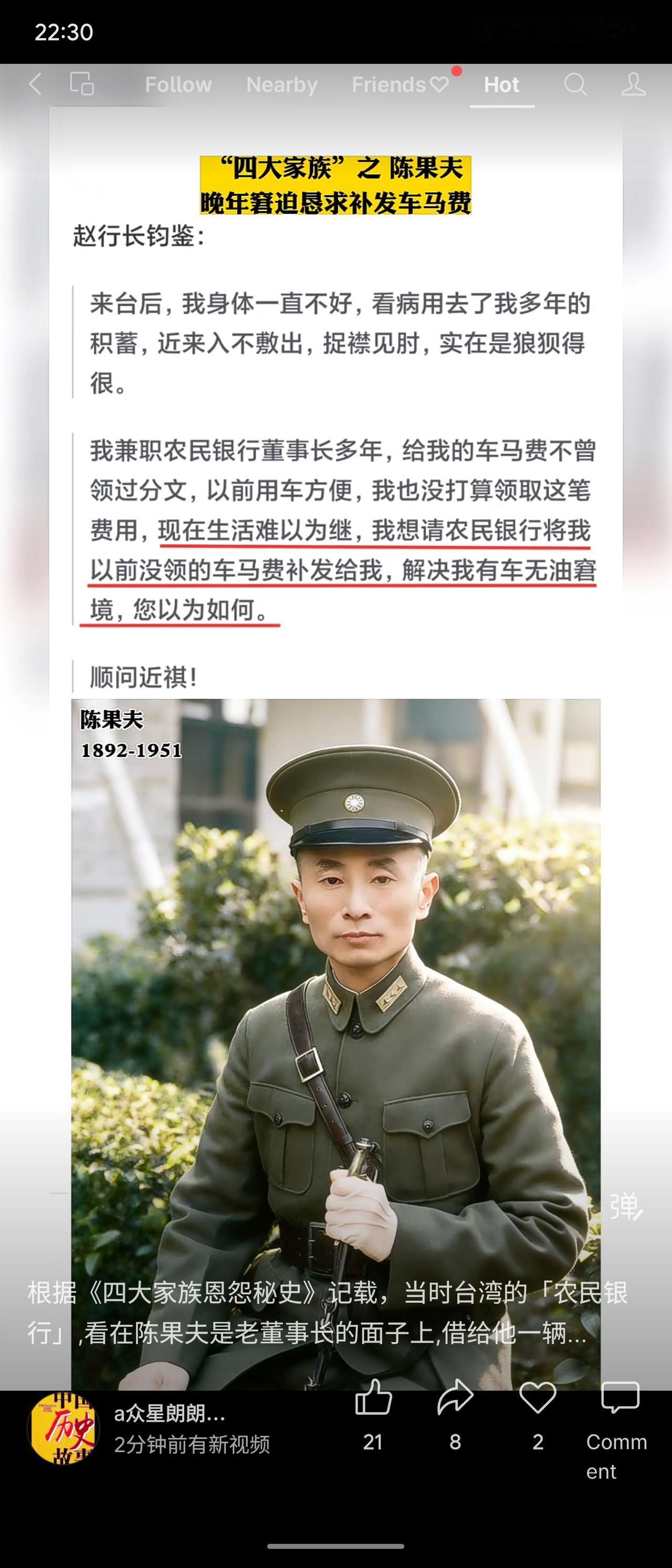 昔日政商大亨陈果夫晚年窘迫,致函农民银行,称以往用车便利未领车马费,现因生活困难,恳请补发该笔费用以解无油用车之困。