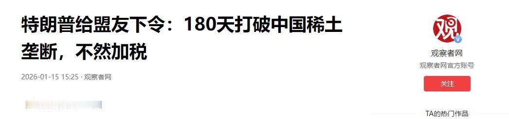 特朗普向全球发出通牒:180天内必须对中国动手,不帮忙就加税。 特朗普突然签署总统公告,直接给全球关键矿产供应方下达最后通牒,各国必须在今年7月13日前配合美国完成“去中国化”谈判,否则就要面临加税和配额限制惩罚。 这份公告不是空喊口号,特朗普在2026年1月14日正式签了字,文件依据的是美国贸易扩展法第232条,核心理由还是那套“国家安全”说辞。 美国商务部早就做过铺垫。从2025年4月22日开始,商务部就启动了关键矿产进口调查,直到当年10月24日才提交报告。报告里明说,美国对多种关键矿产完全依赖进口,更多矿种高度依赖外部供应,这种情况让供应链脆弱不堪,还面临价格大幅波动、本土生产能力不足等麻烦。 特朗普直接认可了这份报告的结论。他没选择立刻加税,而是把球踢给了盟友和贸易伙伴。公告明确要求,美国商务部长和贸易代表必须联合牵头,跟全球关键矿产供应国谈协议。 谈判内容很直白。就是要让这些国家承诺,给美国提供稳定的关键矿产供应,同时得帮着美国搭建脱离中国的供应链。具体要做的包括提升本土加工能力、给美国优先采购权、投资不涉及中国的生产设施,甚至可能要设置价格下限来对抗中国的市场优势。 7月13日这个期限不是随便定的。从公告签署日算起,刚好180天。特朗普在公告里放了狠话,要是过了期限谈判没结果,或者协议没法落实,美国就直接动手。 所谓的“动手”,就是加税和配额限制。公告没明说具体关税率,但暗示会根据情况设定百分比关税,或者直接限制进口数量。这种惩罚手段,特朗普在之前的贸易战里用过多次。 美国为啥非要盯着关键矿产跟中国较劲?答案很简单,中国在全球关键矿产供应链里的地位太稳了。国际能源署的数据显示,中国在铜、锂、钴、石墨及稀土等关键矿产的精炼环节,市场份额介于47%至87%之间。 尤其是稀土领域,中国的优势更明显。稀土高端精炼领域的市场占比超过90%,而这种矿产是军工、高科技产业的核心原料。美军的战机雷达、导弹制导系统,还有新能源汽车、太阳能电池板,都离不开稀土。 美国自己的短板太突出。美国虽是部分矿产的开采大国,比如锂、稀土都有本土储量,但加工环节严重缺位。很多时候,美国得把本土开采的原矿运到国外加工,再进口回来使用,等于全程被别人卡着脖子。 这次通牒,表面是针对全球供应方,实则是逼盟友选边站。特朗普很清楚,单靠美国自己,根本没法在短期内摆脱对中国的依赖。 盟友们早就慌了。澳大利亚的反应最直接,该国锂行业90%以上的原产品都运往中国加工,好几家大型锂矿还持有超25%的中国股份。美国的“去中国化”要求,等于要让澳大利亚重构整个产业链。 澳大利亚政府已经主动找美国要说法,希望美国澄清相关规则。澳方直言,就算有明确标准,私营企业要证明自己供应链里没有中国元素,也是件困难又麻烦的事。 韩国的处境也差不多。该国很多制造业企业,从电池生产到电子设备制造,都高度依赖中国加工的关键矿产。美国的惩罚威胁,让韩国企业陷入两难。 欧盟各国同样顾虑重重。欧盟正推进自己的关键矿产应急计划,但欧盟内部也承认,重构供应链需要巨额资金和长期技术积累,短期内根本找不到替代中国的方案。 中国的优势,不是靠短期操控形成的。庞大的市场需求、完整的产业链配套、先进的精炼技术,再加上多年持续的资金投入,才让中国在全球关键矿产领域占据主导地位。这是市场选择的结果,不是靠强制手段实现的。 特朗普的通牒,本质上还是霸权逻辑的延续。用加税和配额当威胁,强迫其他国家放弃与中国的正常合作,这种做法根本不符合全球经济相互依赖的现实。 国际问题专家早就点破了这一点。在全球高度互联的时代,执意追求供应链“绝对安全”,反而会让供应链更脆弱。与其拉帮结派搞“脱钩”,不如通过合作实现共同安全。 从现在到7月13日,这180天里,全球关键矿产领域的博弈会越来越激烈。盟友们的妥协程度、美国谈判的实际进展,都会影响后续全球供应链的格局。 但有一点可以肯定,特朗普想靠一纸通牒就把中国挤出全球关键矿产供应链,根本不现实。中国维护全球产业链稳定的立场没变,而多数国家也不会愿意为了迎合美国,牺牲自己的经济利益。