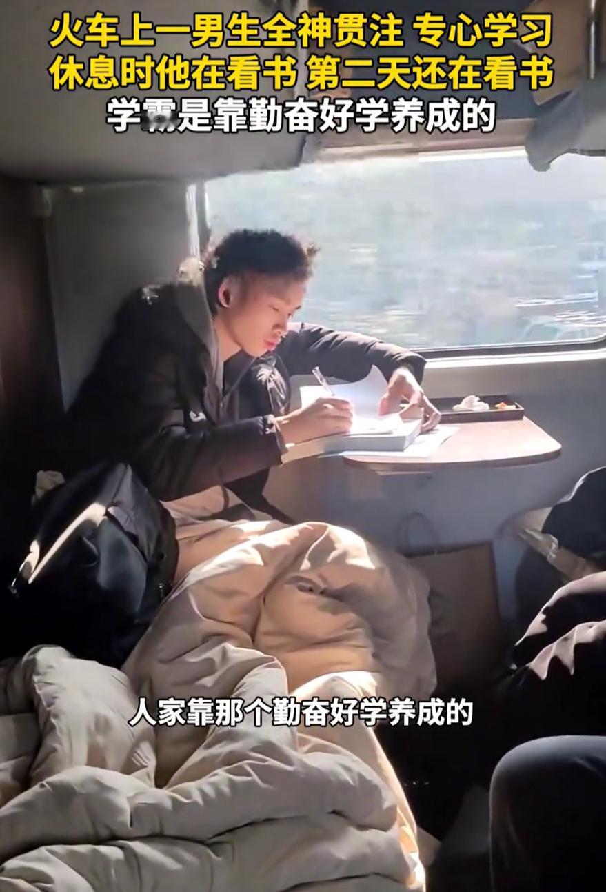 不愧是学霸!一男子坐卧铺回家,从上车时就看到一名男孩在看书,结果一觉醒来,发现对方仍然趴在火车桌板上学习,后来一问才知道,男孩是西北工业大学的,男子感叹:这就是名牌大学的学习氛围,校风确实没的说! 刘先生介绍,当时上卧铺休息时,就看到这个孩子在看书,不过当时也没在意,毕竟都是长途,每个人都有自己消耗时间的方式,谁知早上一觉醒来,发现男孩依旧坐在床边学习、写字,睡得晚,起得早,这让他由衷的佩服 后来刘先生好奇,就上前和男孩聊天,得知他是西北工业大学的,但却不意外,在刘先生看来,很多习惯都是要养成的,有因就有果,孩子这么努力,取得成绩也是理所当然 看到有网友说:在坐火车的时候应该多观察,而不是学习,因为火车上的风景和人以及一路所发生的具体事物,比你死读书更有价值多了 这话听起来好像挺有道理,但我觉得,有点太想当然了 不是每个人坐火车都是为了看风景。有人为了回家,有人为了上学,有人只是从一个地方到另一个地方。而把时间用在自己认为有价值的事情上,本就是对自己负责 这男孩未必是书呆子,他也可能看过很多次沿途的风景,也可能会在中途和邻座聊上几句。但对他来说,眼下更重要的是手头的功课。这是一种选择,也是一种自律 真正厉害的人,不是随时随地都在学习,而是能在嘈杂的环境中,依然守住自己的节奏