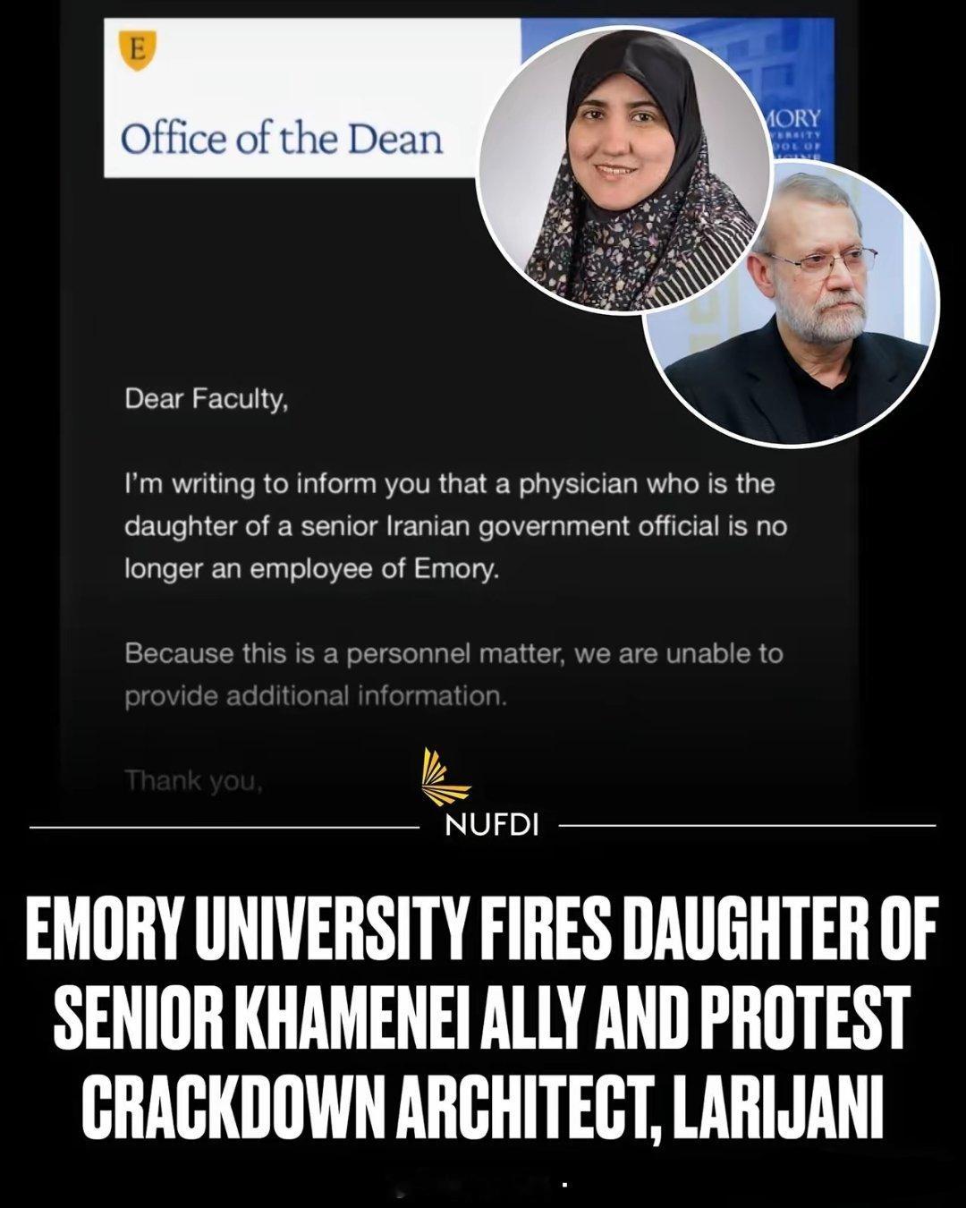 伊朗国家安全委员会的高级官员之一、极度反美的拉里贾尼竟然把他的女儿送到美国留学和工作!她曾是埃默里大学的医生,现在被解雇了。埃默里大学已证实解雇了伊朗高级官员阿里·拉里贾尼 的女儿法特梅赫·阿德希尔-拉里贾尼 。法特梅赫·阿德希尔-拉里贾尼是一名在美国工作的肿瘤科医生,同时是埃默里大学温希普癌症研究所的助理教授。她的父亲阿里·拉里贾尼是伊朗最高国家安全委员会秘书,被视为伊朗最高领袖的亲密盟友。伊朗裔美国人民主联盟 (NUFDI) 等组织发起抗议和请愿活动,呼吁将她从大学解雇并撤销其美国签证,理由是她的父亲在伊朗镇压抗议活动中扮演了重要角色,并曾公开发表反美言论。大学回应: 乔治亚州众议员巴迪·卡特 (Buddy Carter) 致信埃默里大学,要求立即解雇她。随后,埃默里大学院长办公室发布了一份内部通知,证实该医生已不再是埃默里大学的员工,但表示由于涉及人事事宜,无法提供更多信息。
