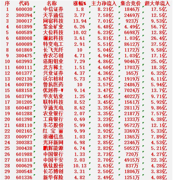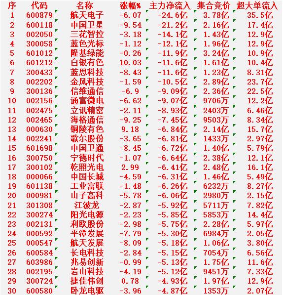 1月26日上午盘,主力趁低位,大幅买入的30名单: 中信证券:涨幅 +1.80%,净流入 8.21亿元 天孚通信:涨幅 +3.77%,净流入 7.58亿元 网宿科技:涨幅 +13.94%,净流入 7.01亿元 紫金矿业:涨幅 +6.26%,净流入 6.48亿元 大位科技:涨幅 +10.02%(涨停),净流入 6.23亿元 1月26日中午收盘,主力资金“大幅卖出 ”的30名单: 航天电子:跌幅 -6.07%,净流出 24.6亿元 中国卫星:跌幅 -9.54%,净流出 21.2亿元 三花智控:跌幅 -3.18%,净流出 14.1亿元 蓝色光标:跌幅 -1.12%,净流出 12.1亿元 隆基绿能:跌幅 -0.26%,净流出 11.9亿元 白银有色:涨幅 +10.03%(涨停),净流出 11.6亿元