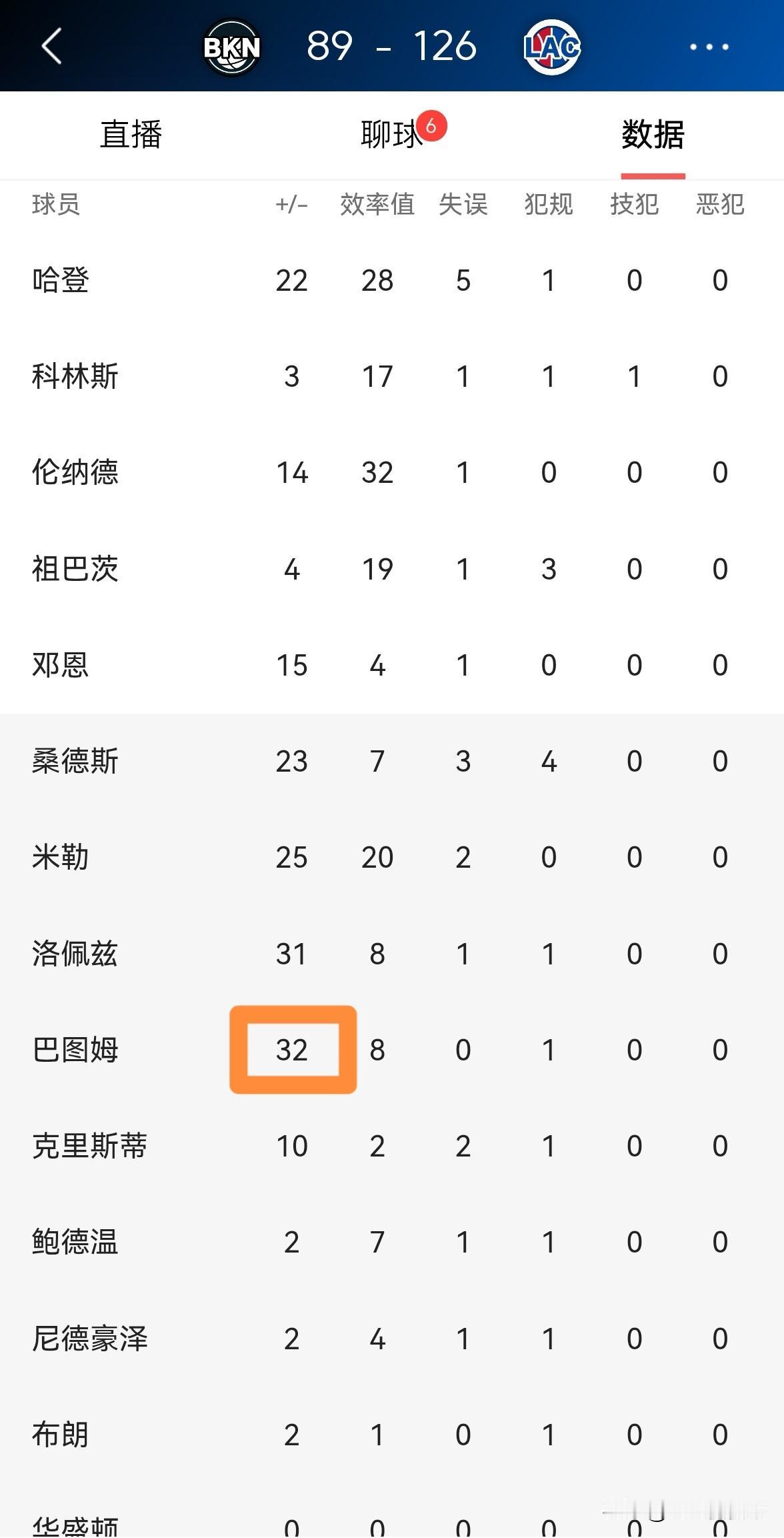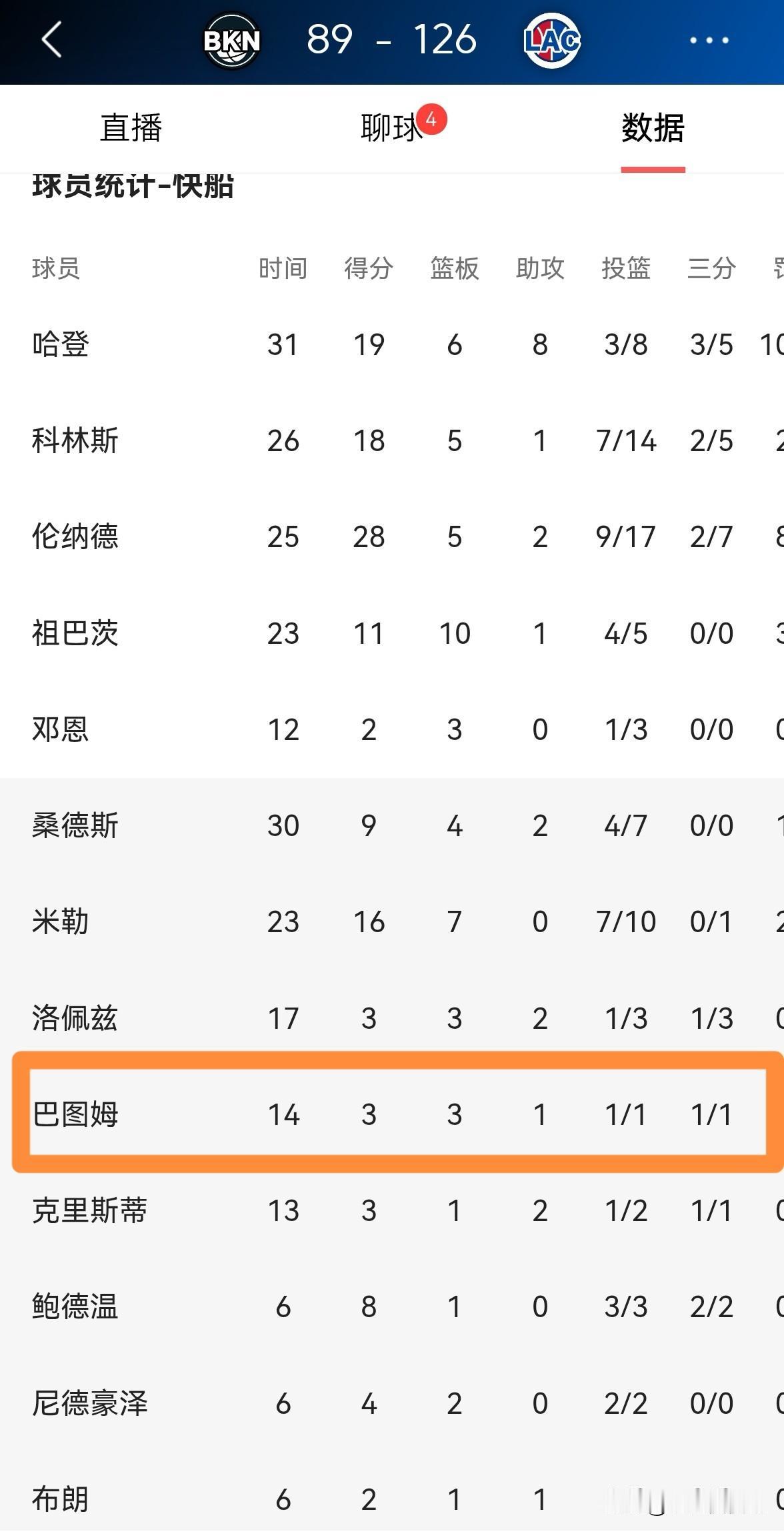 我实在忍不住要怒赞快船老将巴图姆!在今天快船主场以126:89大胜篮网的比赛中,巴图姆替补出战14分钟,三分球1中1得到3分3篮板1助攻1抢断1盖帽,没有出现任何的失误,他的场上正负值为全队最高的+32。 俗话说家有一老,如有一宝。实事求是的说,巴图姆就是快船的宝,巴图姆总是能够在攻防两端给球队提供非常大的帮助。