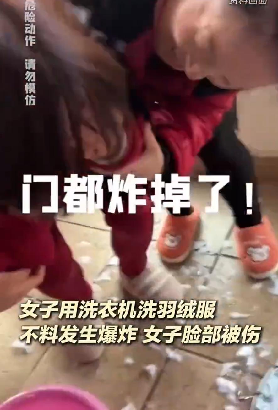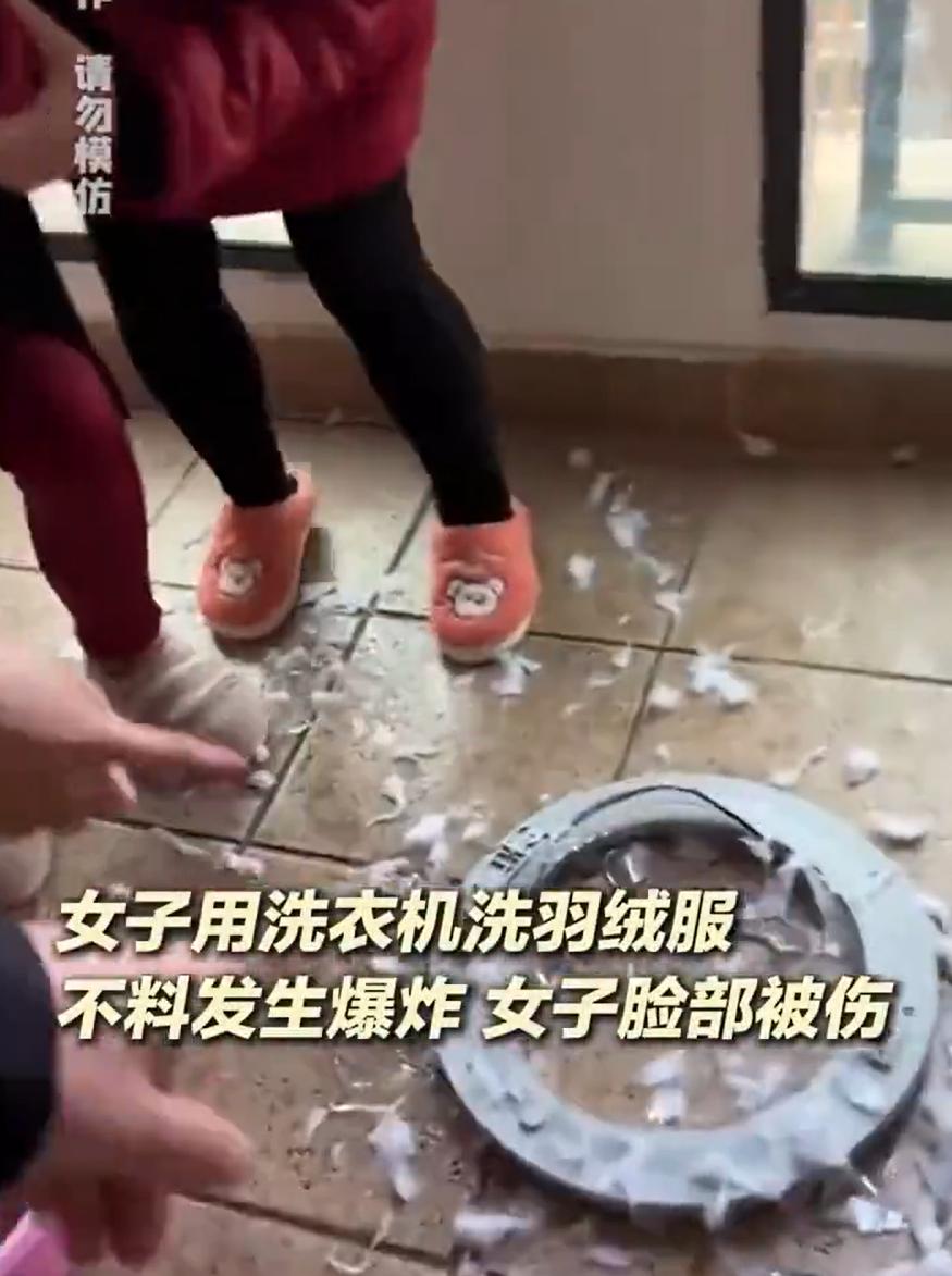 好吓人!一女子觉得羽绒服有点脏,又懒得动手洗,就放进洗衣机里面,没成想,刚当进去没多久就突然发生爆炸,不仅洗衣机的门破掉,女子的脸部也因此受伤。网友:送洗啊! 从家人拍摄的视频来看,现场可谓一片狼藉,满地都是羽绒服的绒毛,而洗衣机的门都直接炸了,掉在地上,如果只是机器坏掉,衣服被毁也就算了,关键女子当时就在洗衣机旁边,脸部也因此受伤,家人也是急得不行 对此,大伙儿看法挺不一样。有人觉得羽绒服压根儿不用常洗,表面擦擦就行;也有人纳闷:洗衣机洗个衣服,咋还能洗出爆炸来? 其实,这已经不是第一次听说洗衣机洗羽绒服出事了。羽绒服面料一般比较密实,透气性差,湿了的羽绒容易结团,在洗衣机里高速旋转时,羽绒团之间、羽绒和桶壁之间不断摩擦挤压,会产生大量空气却排不出去 洗衣机内筒空间有限,气体越聚越多,压力越来越大,再加上洗衣机转动带来的冲击,就可能引起类似“爆炸”的情况,其实更接近鼓胀爆开。尤其是老式双缸波轮洗衣机,甩干桶空间狭小,风险更高 这事儿除了提醒咱们用洗衣机洗羽绒服要当心,也引出了另一个话题:冬天这些厚衣服到底该怎么打理?很多人可能和这位女士一样,嫌麻烦,直接扔洗衣机。送洗固然省事,但花费不小,也未必那么及时。自己手洗吧,厚衣服浸了水特别沉,拧干累人,晾晒也慢 我觉得,家里洗羽绒服,如果洗衣机有“羽绒服”专用模式,可以谨慎使用。那个模式一般转速较慢,能减少风险。没有专用模式的话,最好手洗,用中性洗涤剂,重点搓搓领口袖口就行,洗后别拧麻花,顺着往下挤挤水,然后挂着阴干,多拍打拍打让羽绒蓬松。现在市面上也有羽绒服专用清洁湿巾,擦擦局部污渍,也是一种办法
