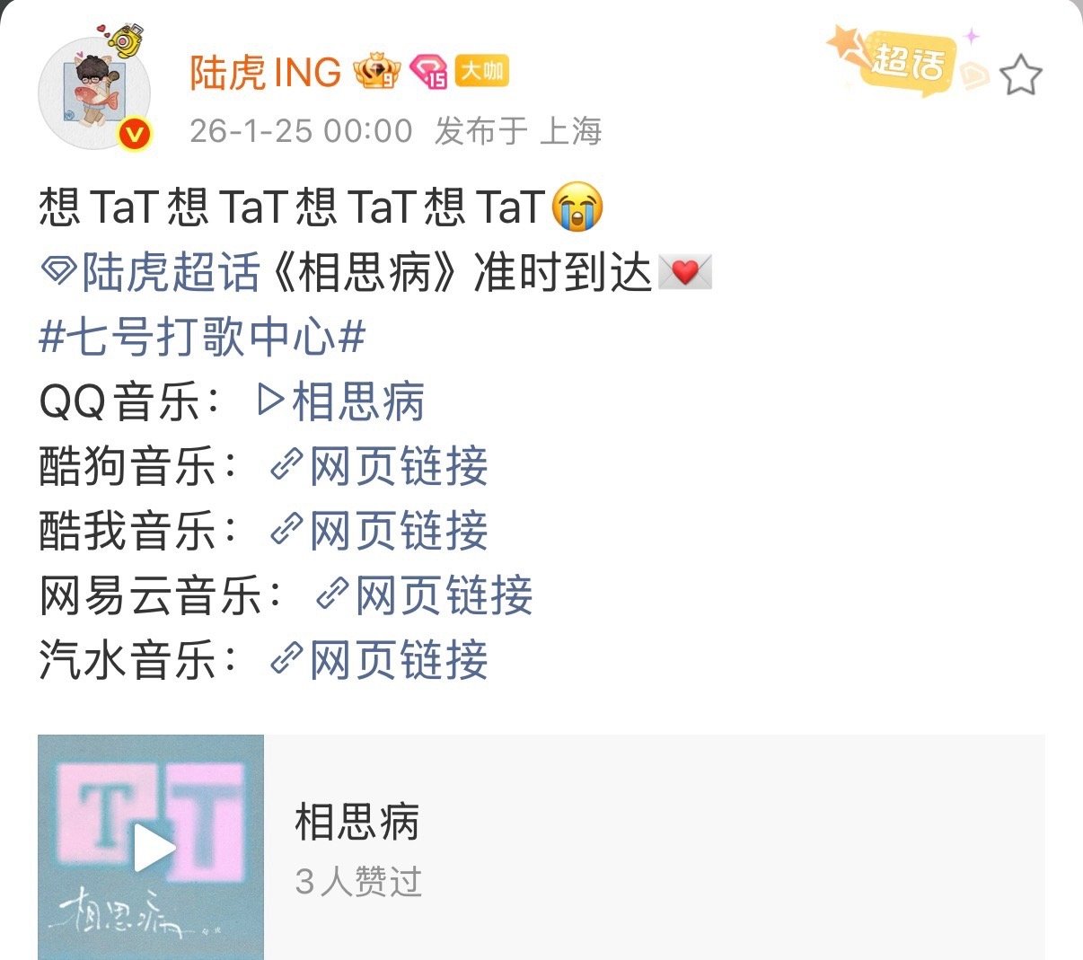 陆虎我们不说浪漫我们说TaT 陆虎的浪漫藏在细节里!新歌封面“TaT”的巧思,左边Ta是男生,右边Ta是女生,更是台上台下的深情对望。一曲《相思病》,不需说爱,已满是心动的形状。