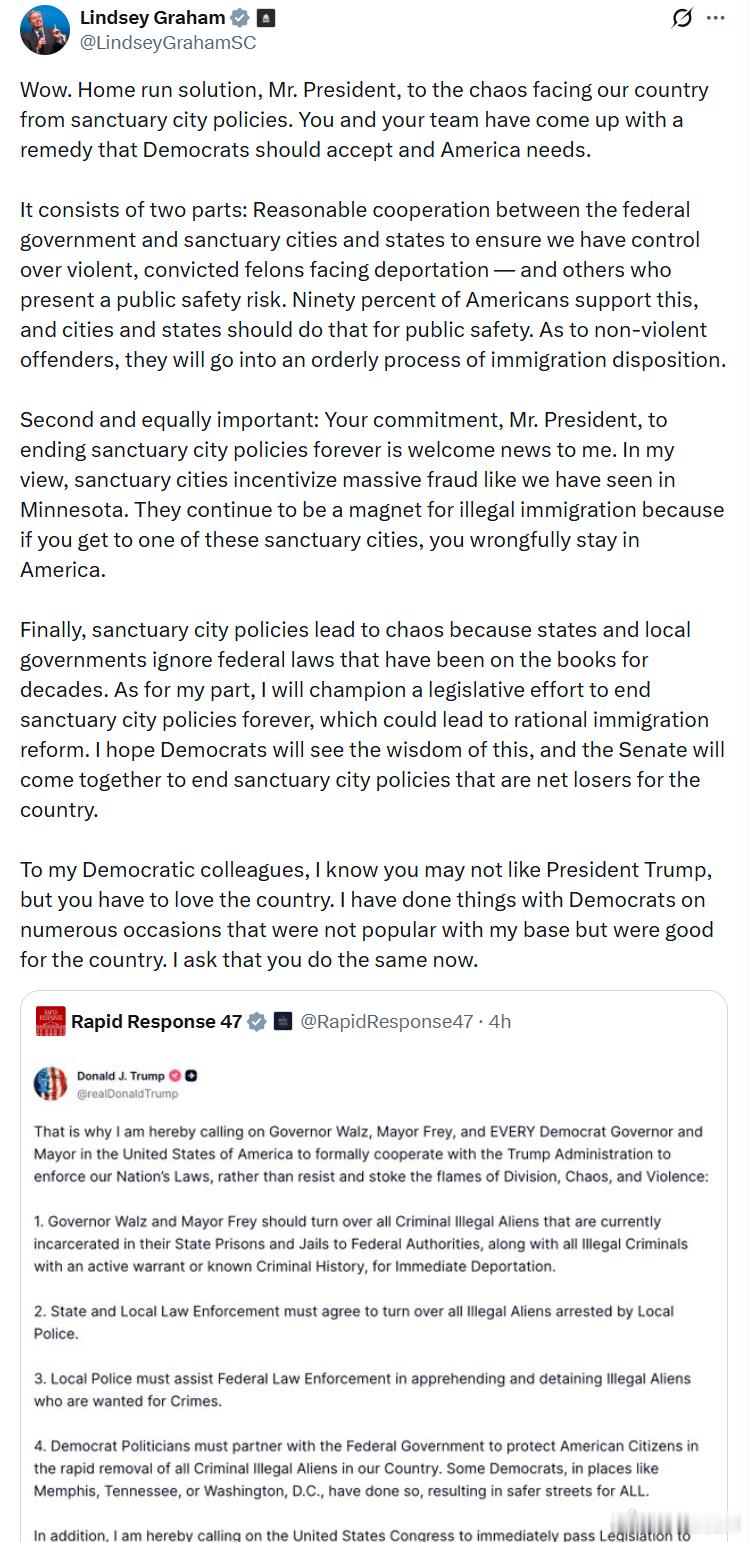 参议员林赛·格雷厄姆:我的民左党同事们,我知道你们可能不喜欢特朗普总统,但你们必须爱这个国家。“哇,总统先生,这真是针对庇护城市政策给我国带来的混乱的完美解决方案。您和您的团队提出了一个民左党应当接受、美国迫切需要的办法。这个方案分为两部分:第一部分:联邦政府与庇护城市和州之间进行合理合作,以确保我们能够掌控面临遣返的暴力、已定罪的重罪犯——以及其他对公共安全构成威胁的人。90%的美国人支持这一做法,城市和州应该为了公共安全而配合。至于非暴力罪犯,他们将进入有序的移民处理程序。第二部分,同样重要:总统先生,您承诺彻底终止庇护城市政策的消息对我来说无比振奋。在我看来,庇护城市助长了像明尼苏达州那样的大规模欺诈。它们继续成为非法移民的磁石,因为一旦进入这些庇护城市,就可以非法滞留美国。最后,庇护城市政策导致混乱,因为各州和地方政府无视已有数十年的联邦法律。就我而言,我将推动一项立法,永久终止庇护城市政策,这可能为合理的移民改革铺平道路。我希望民左党能够看到其中的智慧,参议院也能团结一致,结束那些对国家整体不利的庇护城市政策。对我的民左党同事们,我知道你们可能不喜欢特朗普总统,但你们必须爱这个国家。我过去曾与民左党合作,做过许多对我的选民不受欢迎,但对国家有益的事情。我请求你们现在也能这样做。”