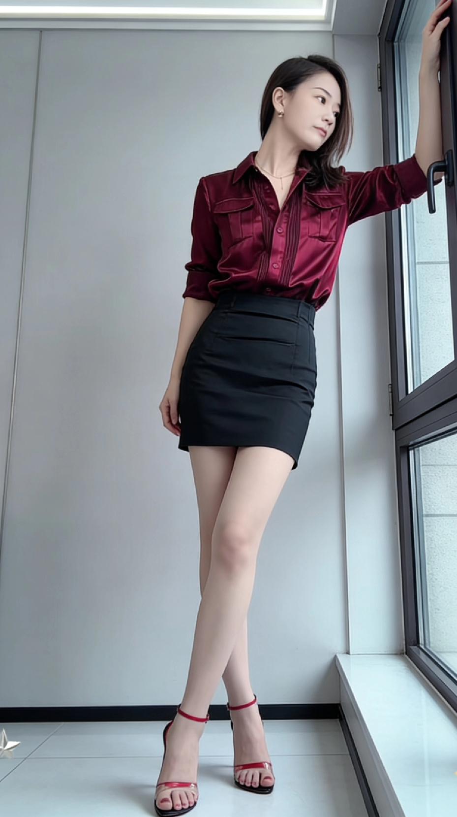 优雅红衣搭配黑色短裙,尽显都市女性魅力!
