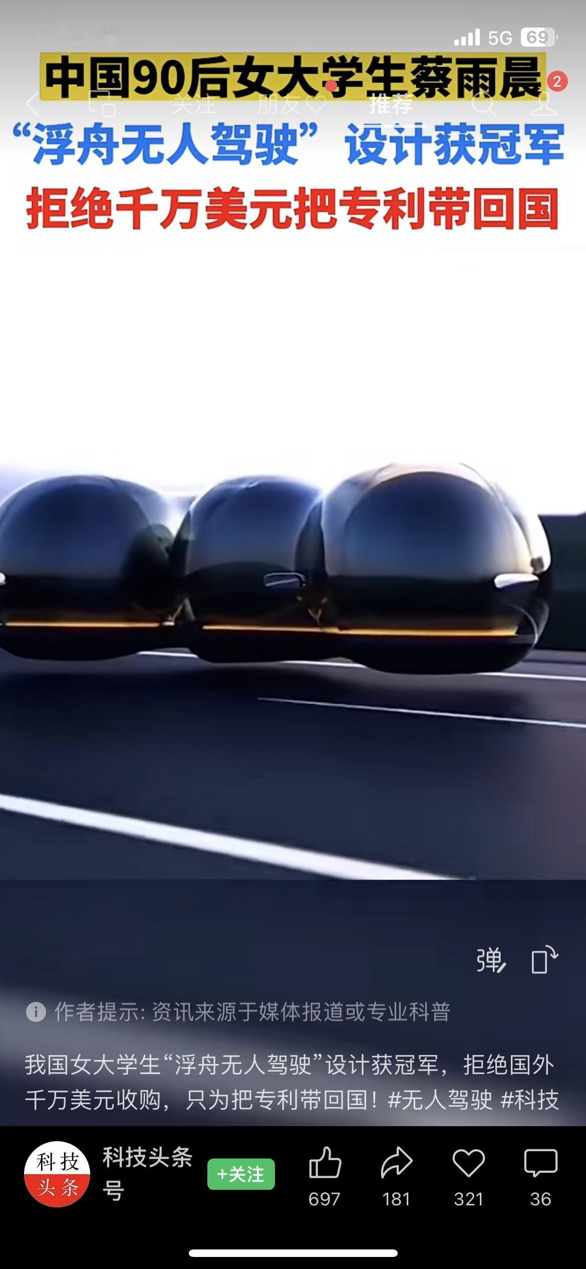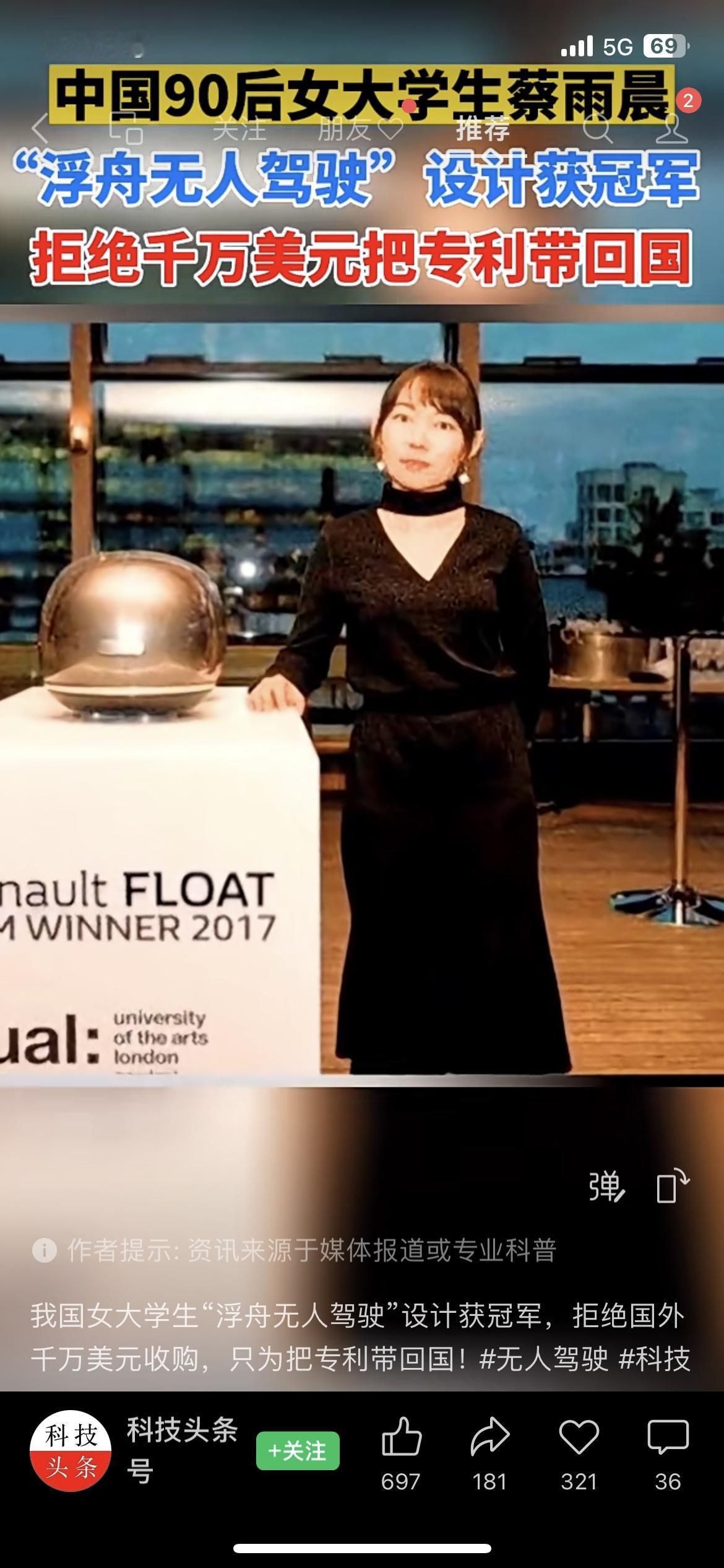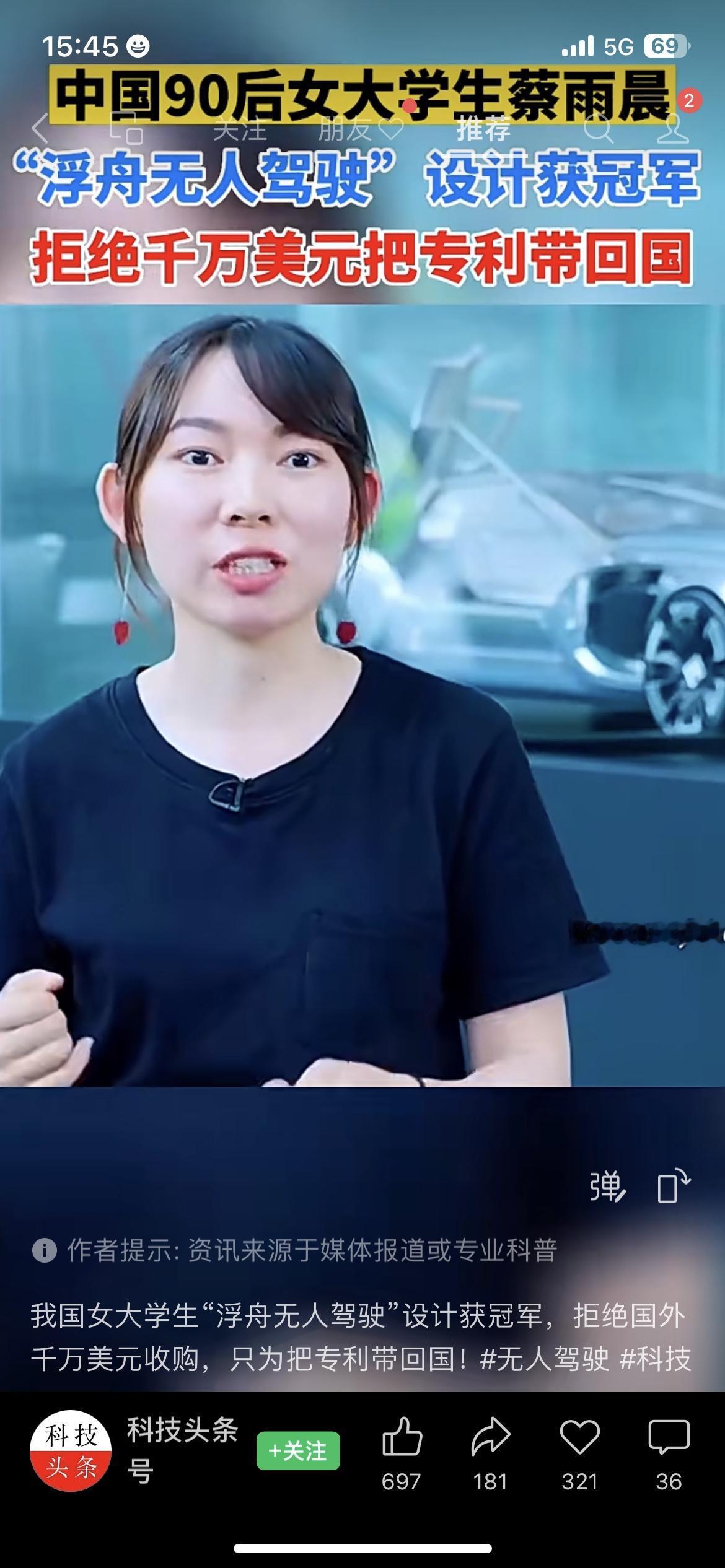 🇨🇳太飒了!90后女大学生蔡雨晨火了! 她的“浮舟无人驾驶”设计拿了国际冠军,拒绝国外千万美元收购,硬把专利带回祖国。 这才是咱们年轻人该追的星,真正的硬核,是把核心技术留给自己人! 你觉得这波是爱国情怀还是理性选择? 蔡雨晨 浮舟无人驾驶