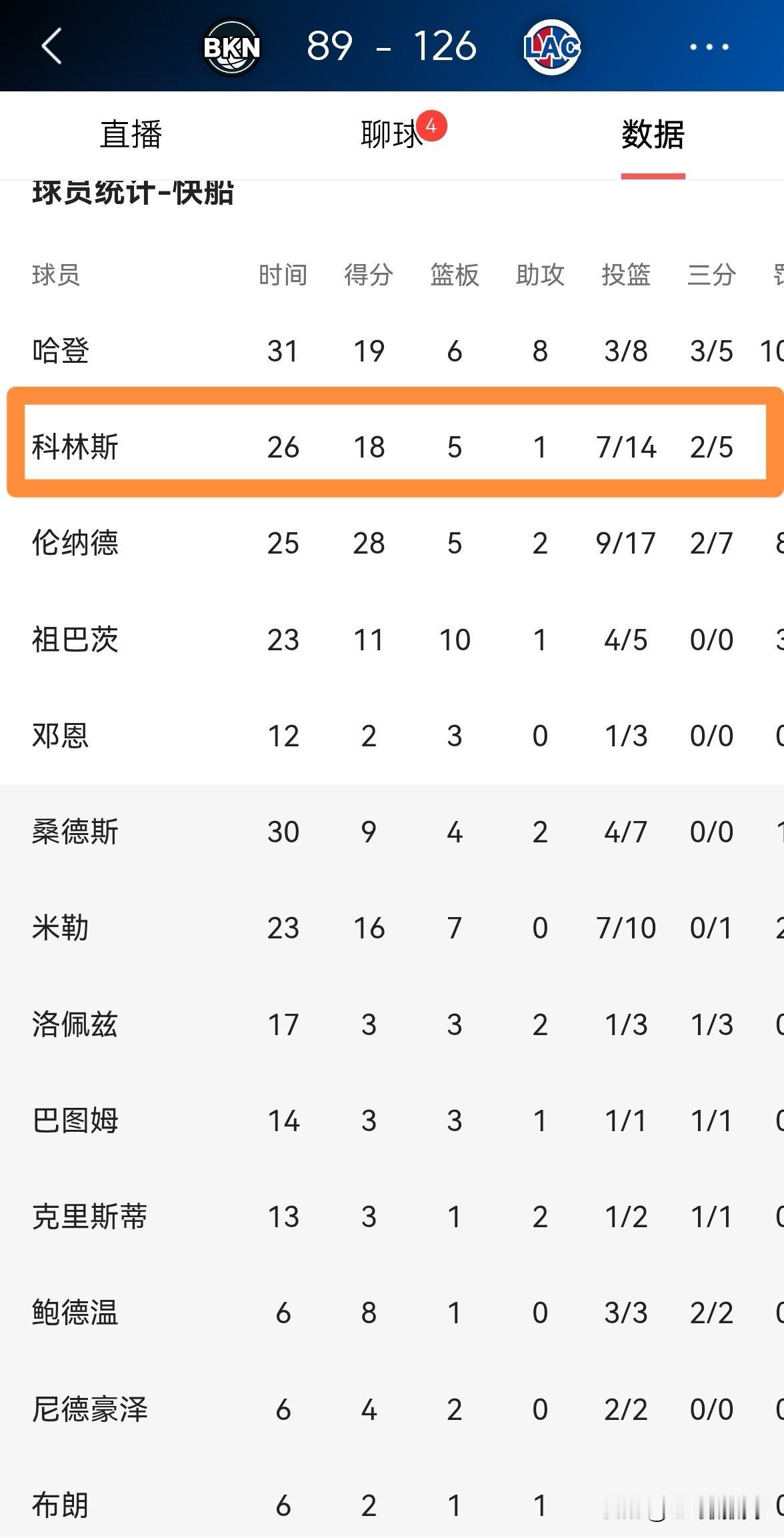 快船大将科林斯真是渐入佳境!在今天快船主场以126:89击败篮网的比赛中,科林斯又一次在攻防两端打出了非常棒的表现,他在首发出战的26分钟里,投篮14中7,其中三分球5中2、罚球2中2非常高效的得到18分,还有5篮板3抢断。 毫不夸张的说,快船在最近一段时期取得了非常出色的战绩,这和科林斯的状态回暖有着重要的关系,因为科林斯是快船在攻防两端的重要球员之一,他的表现会在很大程度上影响比赛的胜负。