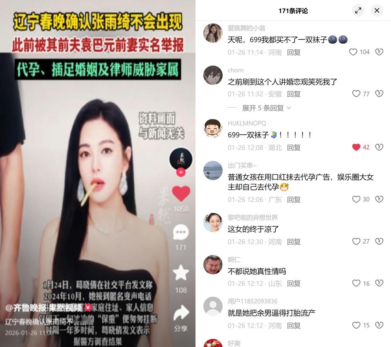 699元买不了袜子的瓜,终于波及到春晚了! 辽宁春晚官宣取消张雨绮节目,背后是代孕传闻、律师非法获取隐私威胁他人的举报。 这事儿闹得沸沸扬扬,早已超越了某个人的对错,实际上是三件刺痛社会神经的事叠在了一起。 一是代孕的行业灰色地带,把生育当成可操作的生意,明知违法还铤而走险,这类圈子里的潜规则,早该被摆上台面晒晒。 二是律师知法犯法的乱象,本该守护法治底线的人,反而用专业技能查隐私、放狠话,这比普通人越界更寒心,砸的是整个行业的公信力。 三是攒了太久的阶级积怨,699买不了袜子这种话,早把精英层的特权思维摆出来了,大家如此愤怒不仅仅是针对明星,更多的是恨规则双标的不公。 什么时候规则能真的一碗水端平?这才是大家越吵越上头的根本原因。
