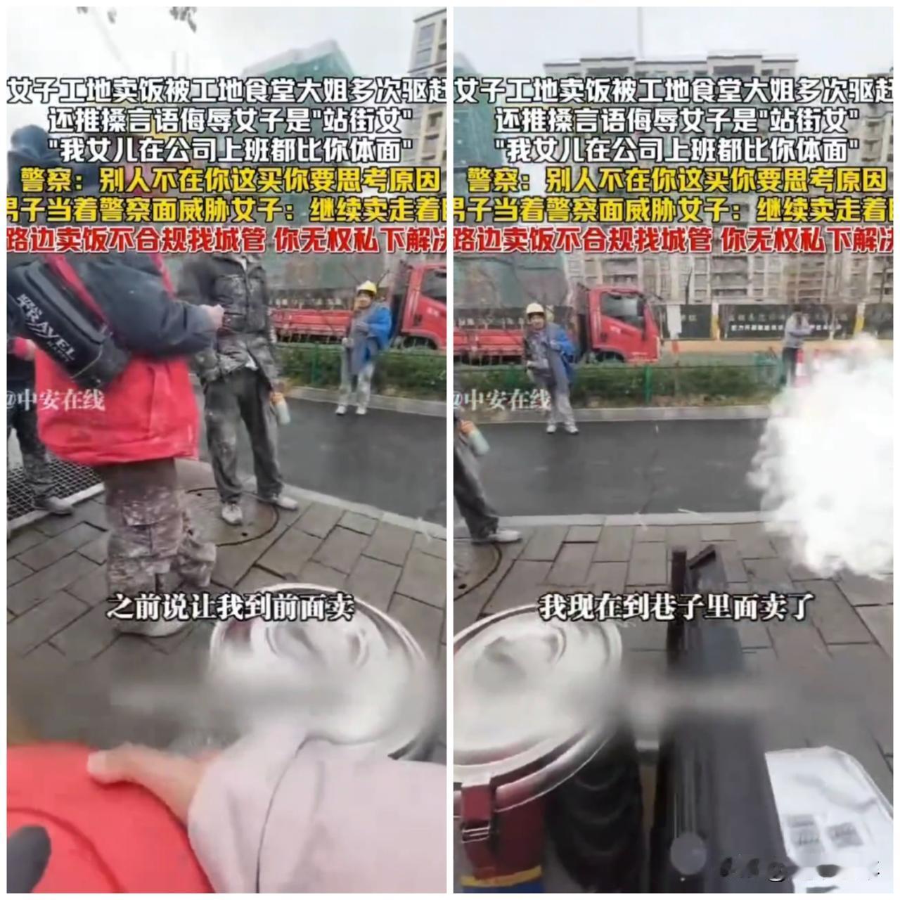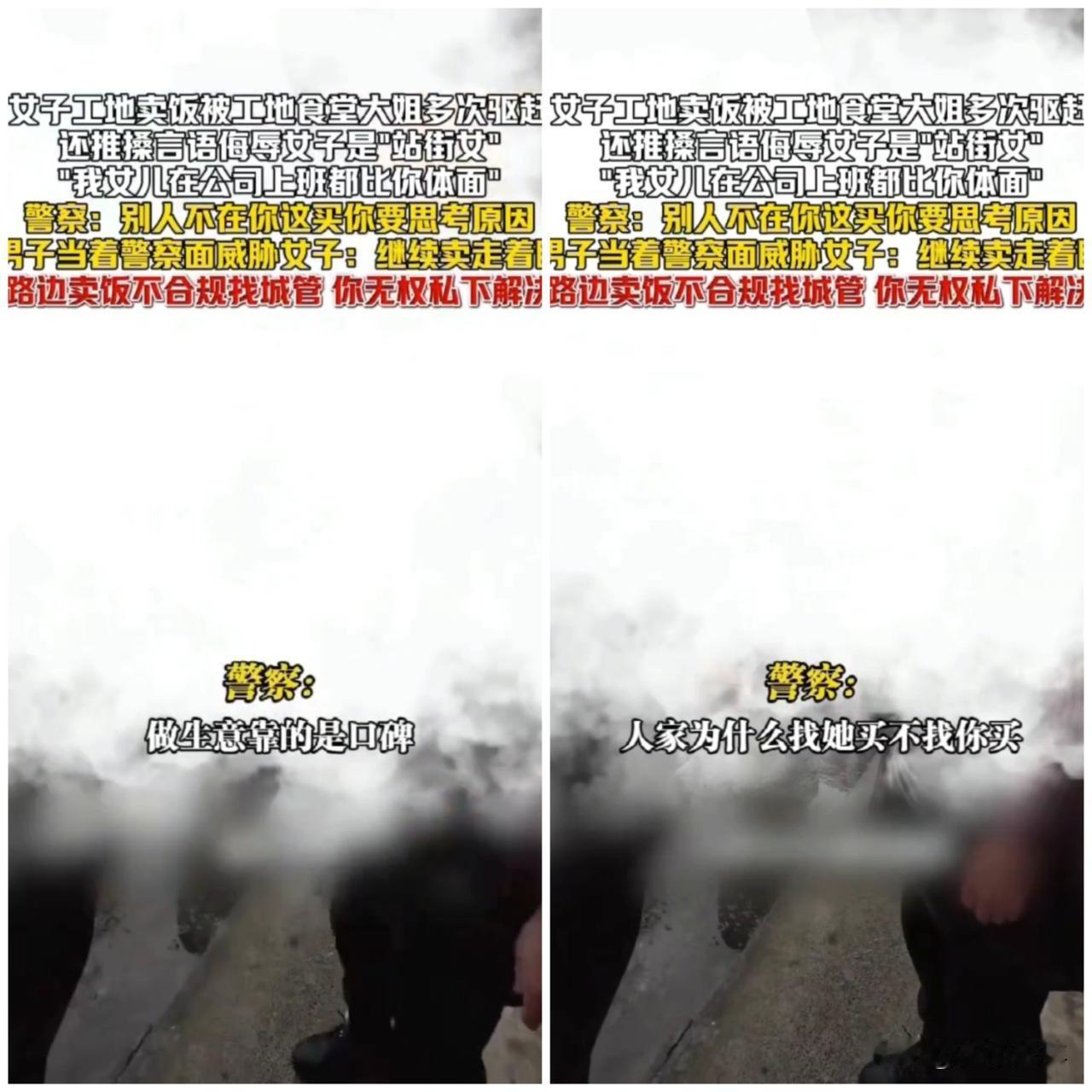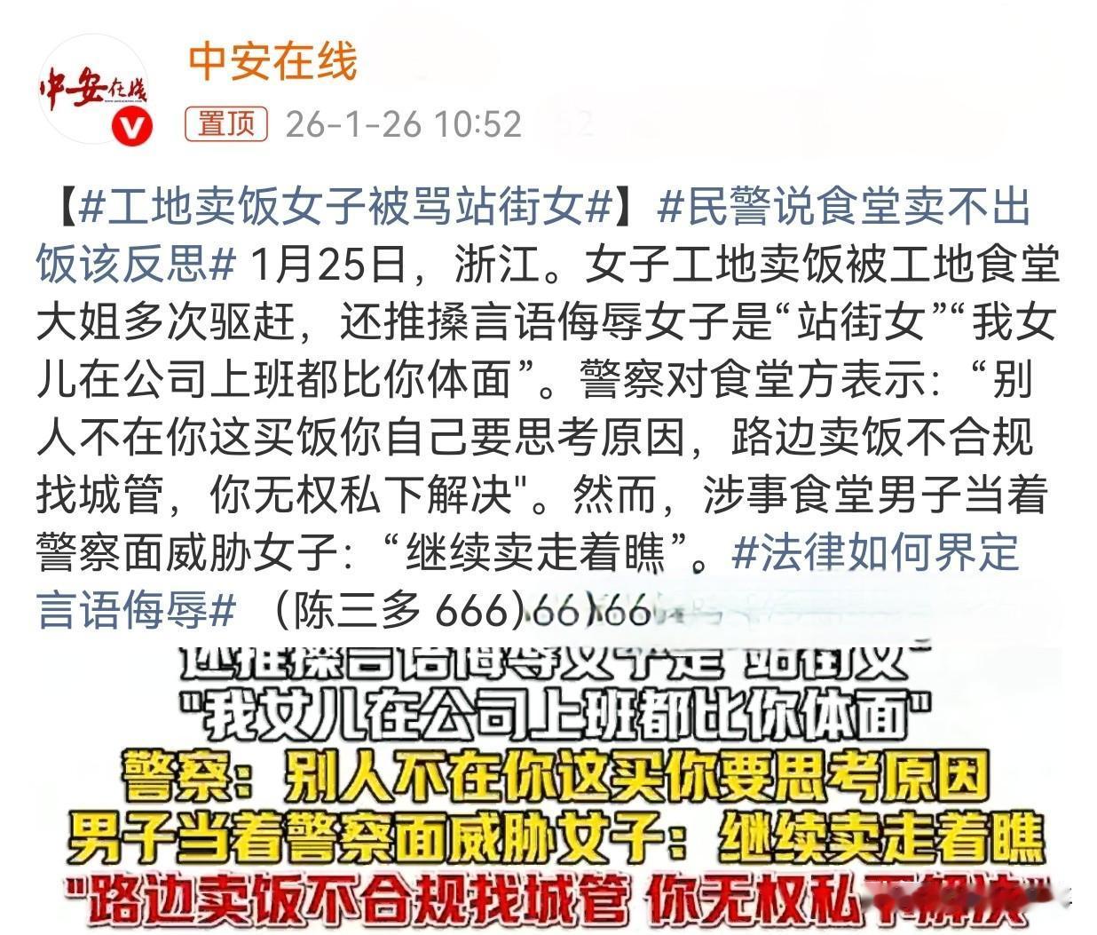 浙江工地食堂方辱骂在外卖盒饭的人是“站街女”,警方出面维权太解气。 26年1月25日,浙江一名在工地附近卖饭的女子遭工地食堂工作人员多次驱赶。食堂方一名女性工作人员不仅推搡驱赶该女子,更以“站街女”“我女儿在公司上班都比你体面”等言论进行人格侮辱,并嘲讽其职业低贱。 可以理解工地食堂因为是承包经营的,工人就餐流量少会影响他们的收入。是何原因造成的问题,赶来解决纠纷的警察叔叔发出来了灵魂拷问。市场行为需反思自身问题民警指出工人选择购买路边摊饭食是因“口味、价格、口碑”更优,食堂生意差应自我检讨而非驱逐竞争者。若认为路边摊违规应联系城管处理,食堂方无权私力驱逐。尽管民警介入,涉事食堂一男子仍公然威胁卖饭女子“继续卖走着瞧”,暴露经营食堂者的法律意识淡泊。 在现场围观群众认同民警“市场自由竞争”的逻辑,强调食堂若想赢得客户需提升服务质量,而非通过辱骂、威胁等恶性手段打压对手。而卖盒饭女子一句回应“杭州天气冷,人心是热的”更是获得大家的共情,凸显争执双方的情商高低。 部分工地食堂依托场地垄断地位排斥外部竞争者,却忽视工人对实惠餐食的需求。民警虽指出食堂方无权驱赶摊贩,但对“站街女”等侮辱性言论未当场定性处罚。最近多起辱骂事件(薅羊毛的媒体记者)因视频曝光推动当事人道歉、辞职甚至法律追责,体现社会对言语暴力的零容忍。 竞争应该回归市场本质,食堂需以优化服务而非打压他人赢得生存。言语暴力治理需法律细化,对职场、公共场所的侮辱性言论加强处罚力度。盒饭摊贩