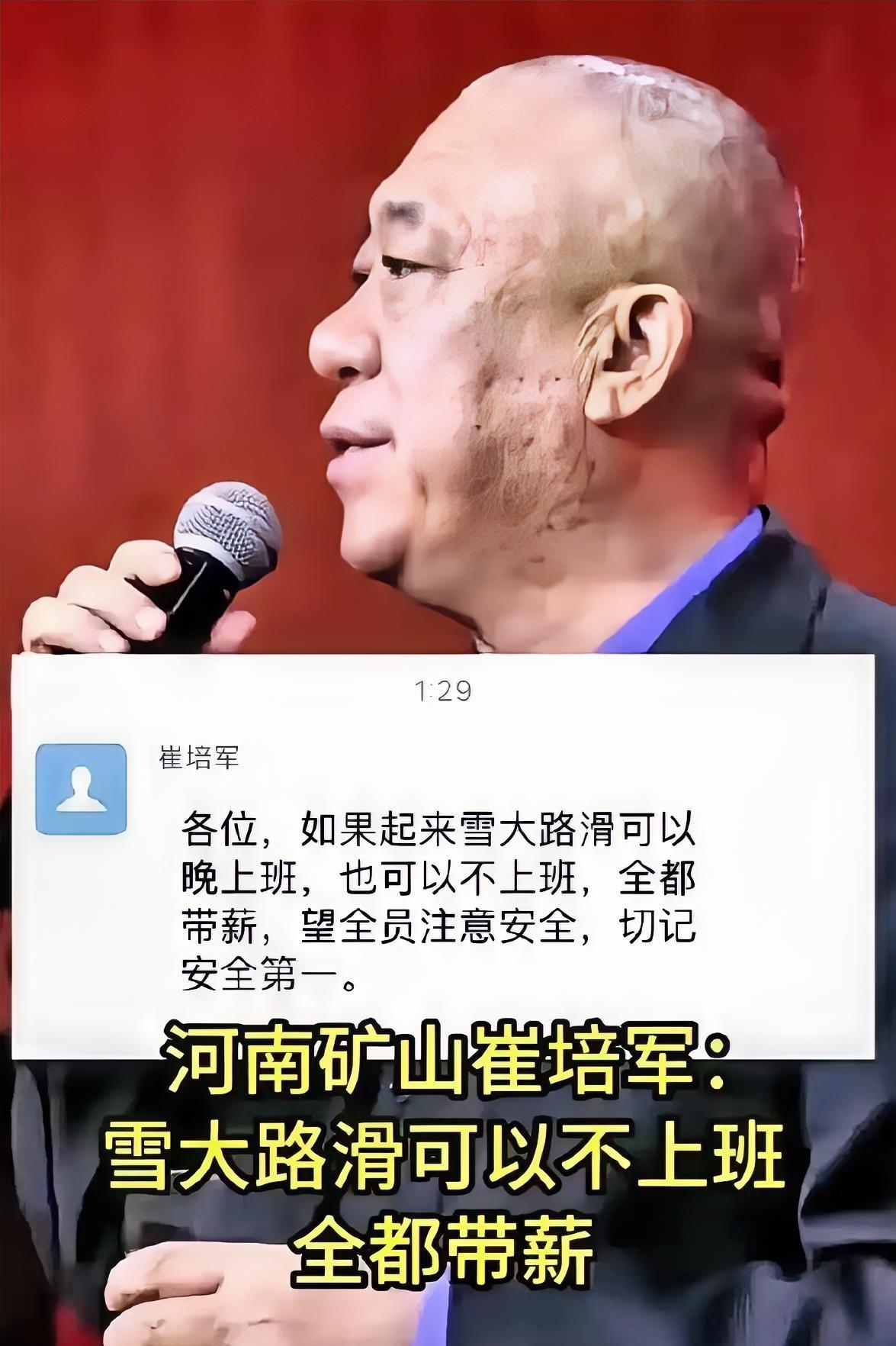 怪不得人家能发财!天气预报说河南下大雪,矿山老总崔培军提前一天发通知:“各位!如果起来雪大路滑,可以晚来上班,也可以不上班,全都带薪!”网友:没有对比没有伤害!我老板发的通知是年底赶工,不许迟到,谁迟到扣100块钱! 这次河南下雪,崔培军的暖心通知,又狠狠火了一把! 可能有人觉得这只是一次“网红操作”,但了解崔培军的人都知道,这份暖心从不是临时起意。这位60岁的老板,14岁就因为家里穷辍了学,揣着35块钱外出闯荡,下过矿井当采煤工,扛过40多公斤的重物,那些冻得缩脖子、累得直不起腰的日子,他记了一辈子。正因为淋过雨,所以他总想给别人撑把伞,如今公司取名“矿山”,虽主营起重机制造与矿产无关,却始终带着底层打拼时的同理心。 这次河南的雪来得有多猛?全省平均降雪量9毫米,中东部部分地区积雪深达12到18厘米,降温幅度最高超25℃,部分路段结冰厚度达3厘米,连气象部门都启动了暴雪三级应急响应。崔培军盯着天气预报,连夜让办公室发了通知,他在管理层会议上说:“员工路上出点事,赚再多钱都没用。”这话不是空话,他车间里的焊接机器人,就是十年前专门引进的——以前女员工也要搬几十公斤的零件,长期下来容易得腰椎病,他看着心疼,花大价钱升级设备,就为了让员工“舒舒服服挣钱”。 崔培军对员工的好,从来不是单点爆发。2003年,一个考上郑州大学的姑娘来公司找工作,说家里穷交不起学费,他当场拍板每年资助5000元,直到姑娘毕业。这件事之后,他成立了助学基金会,21年里资助了4800多名贫困生,发出去的助学金超3500万元。对员工更不用说,2024年公司纯利润2.6亿元,他直接拿出1.7亿元分给员工,年会时把几千万现金堆在长桌上,让员工数多少拿多少;中秋办千桌宴席,请员工和父母吃饭,每人发600元红包;就连收小麦的季节,都要给员工发1000元收割机补贴。 有网友吐槽自己老板“雪天迟到扣100”,其实暴露了很多企业的通病:只算经济账,不算人心账。极端天气下,强制到岗不仅可能引发安全事故,还会让员工心生抵触,反而影响效率。河南矿山从不打卡,员工有事打个电话就能请假,可公司产值却连年增长,2024年达到103亿元,合作客户全是宝武、中铁这样的央企。这背后的逻辑很简单:你把员工当家人,员工就把企业当家业。有员工说,自己母亲生病住院,崔培军知道后不仅批了长假,还亲自去医院探望,这样的老板,没人愿意辜负。 反观一些企业,把“压榨式管理”当成成本控制,迟到扣钱、加班无薪成了常态。他们忘了,崔培军的“豪横”背后,是企业无贷款、无负债的硬实力,而这份实力,恰恰是员工用忠诚度和战斗力拼出来的。他常说:“老板就像家长,孩子需要钱你能不给吗?”这种朴素的认知,戳中了很多打工人的痛点——不是想要多少福利,而是想要被尊重、被看见。 崔培军的走红,从来不是因为“发钱”这个行为本身,而是他让大家看到了一种可能:企业和员工可以不是对立关系,而是共赢伙伴。极端天气里的带薪休假,看似“少赚了一天钱”,实则赚足了人心。当越来越多企业开始效仿这种人性化管理,职场生态才能真正变好。各位读者你们怎么看?欢迎在评论区讨论。