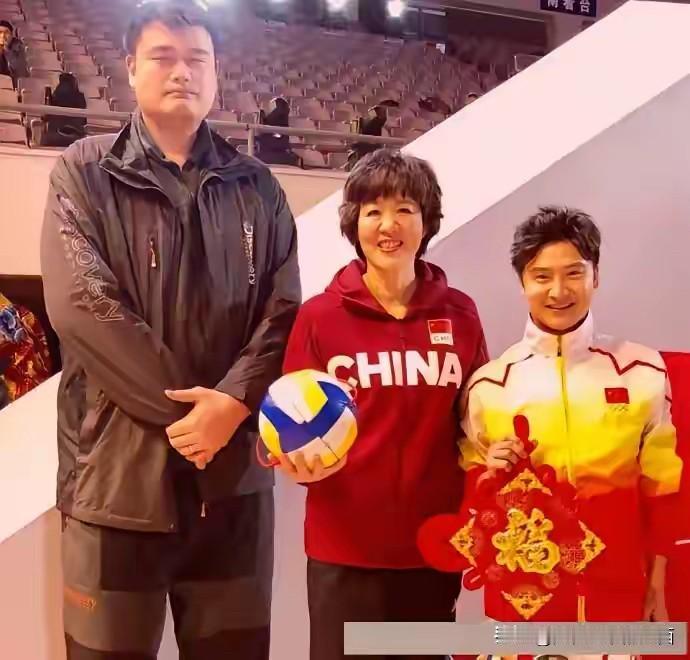 三个不同时代的运动员同框合影,左边的两位应该绝大部分人都可以认出是姚明和郎平,看来郎平的身高还挺高的,站在姚明旁边也比较有气质。 另外一个身高稍微矮一点,穿运动服的帅哥是谁,颜值不输娱乐圈的男明星。