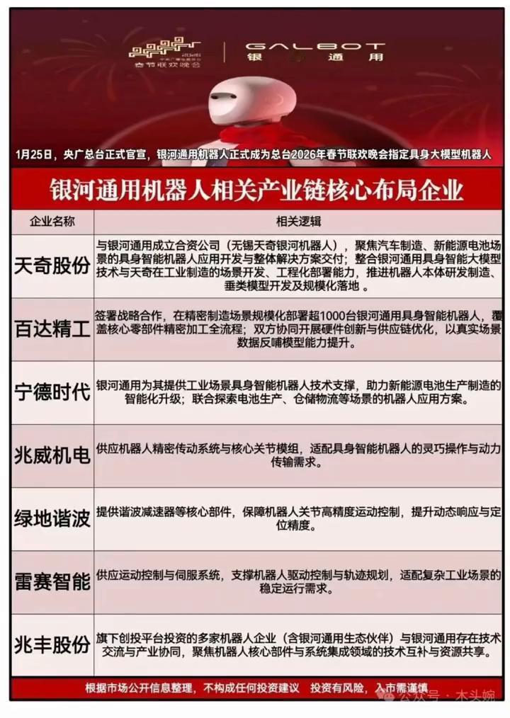银河通用机器人相关产业链核心布局企业。 ·嘉美包装实控人旗下难科技为魔法原子的孵化主体,双方存在深度服权关联,共享供应随心。通过参股华晚资本,闻接参与魔法原子2025年战略融资,华映资本为该轮融资财团提供工业级金属3D打印设备及材料供应商。 ·超捷股份为中科宇航提供机天级票图件及体构件,包含段、尾及、整流著等产品,双感器、柔性电子器件,应用于MagkBot的触觉反馈与环境感知系统。 ·胜宏科技魔法原子提供机器人专用CB版、应用于其控制系统、驱动系统及传感器块。 ·航天宏图与魔法原子在机器人视觉导航、环境感知算法领城展开技术合作,为其提供卫星。 ·汇川技术为魔法原子提供代服系统、控制器等核心零部件,应用于人形机器人的关节驱动与控制系统。 ·兆易创新为魔法原子提供存储芯片产品,应用于机器人数据存储、算法模型运行及控制系统。 ·全志科技其智能处理器芯片应用于魔法原子机器人的边缘计算模块,支持实时数据处理与人。 ·南凌科技魔法原子提供工业互联风解决方案,保障机器人在工厂场景中的数据传输与远程。 ·中科宇航相关产业链核心布局企业。 ·联航空中科产品订单,为其产时相关金形式。 ·航宇科技中科宇航的商业火提供涡轮盘、泵,壳体、法兰等各类环件、模件配套产品。 ·其天领城相关产品应用于火全及控制系统,发动机等场景,为中科宇航提供工业级金属3D打印设备及材料供应商。