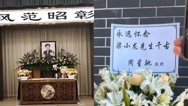周星驰送梁小龙花牌 据港媒,26日,梁小龙出殡仪式在深圳举行,周星驰送上花牌,并写道:“永远怀念 梁小龙先生千古,敬挽”,好友陈惠敏撑着拐杖前来送别。