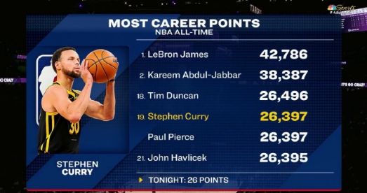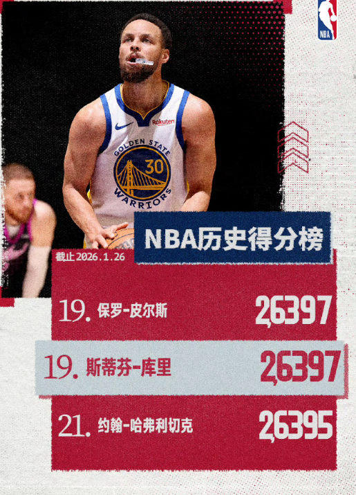 里程碑!库里今日得到26分,生涯总得分来到26397分,超过哈弗利切克,与保罗-皮尔斯并列历史得分榜第19位。