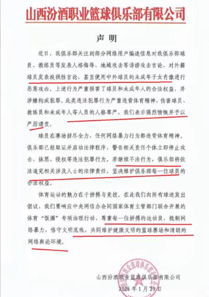 忍无可忍!深夜11点,山西队发布了严正声明! CBA常规赛,山西队和广东队的比赛刚落下帷幕,场内外的风波接连不断。赛后的舆论焦点并没有围绕比分,而是集中到了迪亚洛这一名外援的身上。全场比赛,迪亚洛的几次动作让广东队多名球员受伤,甚至在气头上,他还公然对现场观众做出了挑衅性举动。赛后,关于迪亚洛的讨论没停过。 其实,比赛刚开始还没多久,迪亚洛的行为就有点过分,根据CBA官方后来调取的录像,当时距离第一节结束还有4分多钟的样子,迪亚洛突然冲着看台上的观众做出带有侮辱性的手势,这种举动在赛场上绝对不能被放过。 联盟这次处理得很快,直接开出了罚单。迪亚洛因为这一系列失控动作,被罚了三万元,而球队的主教练潘江也因为管得不严,被连带追究责任,追加了两万元的罚款,五万元的处罚下来,让山西队内外都不敢轻视这个问题。 有了处罚,原本以为事情能够画个句号,但网络上的讨论和争吵更加激烈。广东队的球迷对迪亚洛的不满,在网络上持续发酵。 最初只是质疑他的球风问题,慢慢却演变成了对他个人的各种嘲讽,甚至还出现了针对出身和肤色的言语攻击,在网上,这种情绪很快失控,局势变得越来越难以控制,已经超出了对比赛和球技的正常讨论。 面对这种局面,山西俱乐部选择在深夜发布公告,无非是想保护自己的球员不受舆论矛头伤害,毕竟外援是球队重金请来的“帮手”,球场上被挖苦,网络上还被攻击,球迷的愤怒一旦上升到人身攻击,球员自身的状态不可避免会受到影响。 山西队的声明很直接,俱乐部不会容忍对球员的侮辱或带有歧视的言论,并且明确表示,涉及诽谤的话一定会回击到底,甚至要动用法律手段。 迪亚洛这次的表现确实不符合一名职业球员该有的素养,他在关键时间点没能稳住情绪,反倒成了焦点。罚款算是给他的一个警示,球队内部后续肯定得严肃处理,避免类似的事情再次发生。 不过,如果站在球迷角度,大家支持自己的队伍无可厚非,但一旦开始拿出带有偏见的词语去攻击球员本身,这就超出了底线,这样的话不仅仅会毁了球员的自信,更会影响整个CBA联赛的舆论环境。 其实,体育比赛的确需要激情,需要紧张的情绪,但无论场上还是场下,都应该有最基本的规则和底线,少了底线,再热闹的比赛也可能变味,球迷间的讨论一旦演变为网络暴力,球队、球员都会受到牵连。 从联盟到俱乐部再到球迷,每个人都应该更理性一些,不管是谁,情绪失控总要付出代价,迪亚洛这样的球员要记住,要用球技说话,而不是用情绪发泄。球迷在网络上的言论也应该守牢界限,不因一场球闹得不可收拾。 经过这次事件,其实也给整个联赛提了个醒。球员控制不住动作比赛要受罚,球迷说话拿捏不准同样会惹来麻烦。 所有人都应该明白一点,只有大家都保持克制和理性,CBA才能越来越好,要说,面对球员的挑衅,如何回应才是既合理又不过激的方式,确实值得大家思考。 你觉得赛场上的冲突该怎么处理才真正合适?