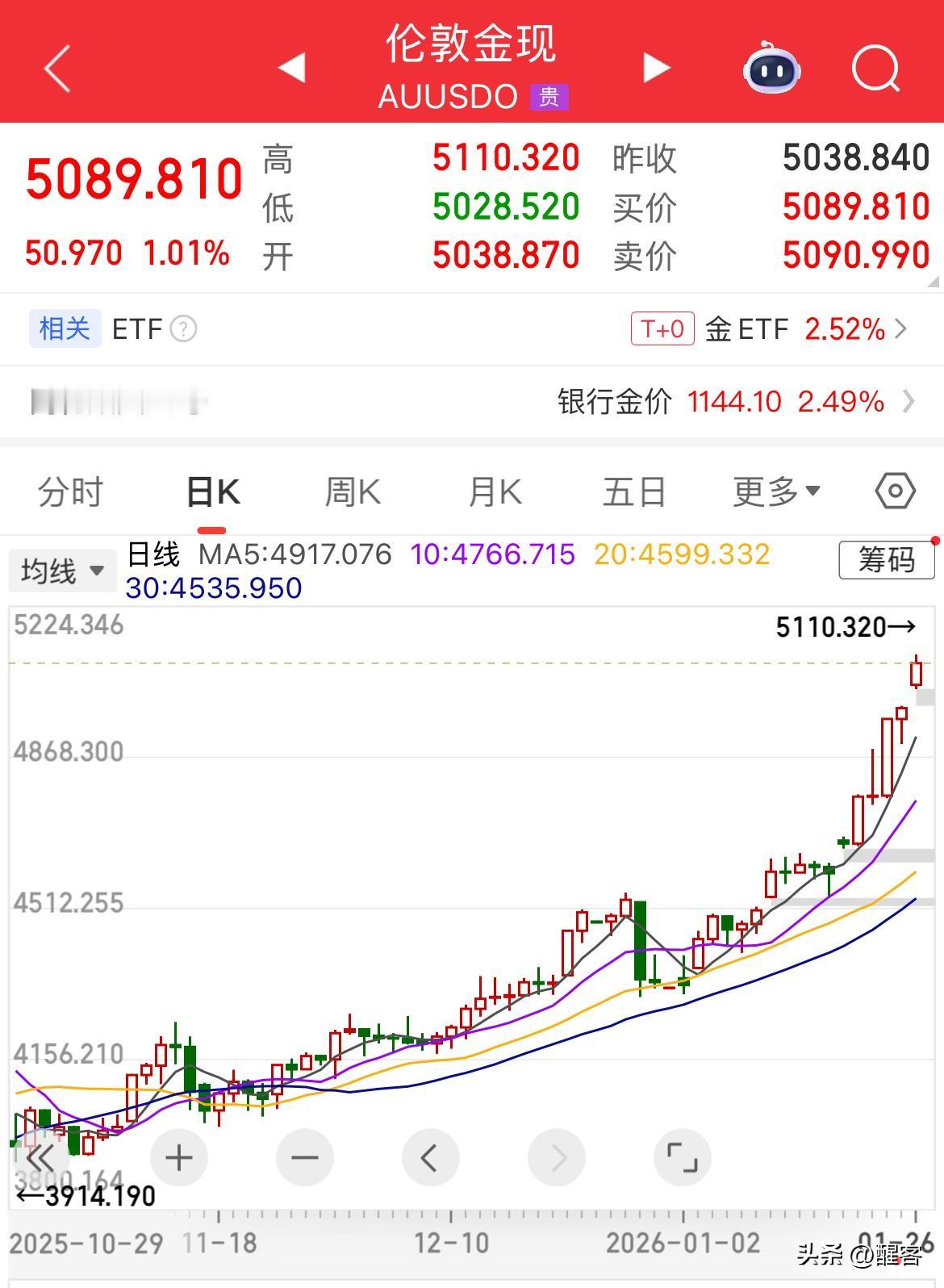 一张图明白黄金持续上涨的重要原因。 今日黄金现货价格从5000美元跳到5100美元大关仅仅两个小时,除了各国央行不断增持黄金储备,美元走弱趋势,国际形势动荡不稳定也是重要原因。 但是与之前黄金走强不同的是此轮黄金强股市也强。