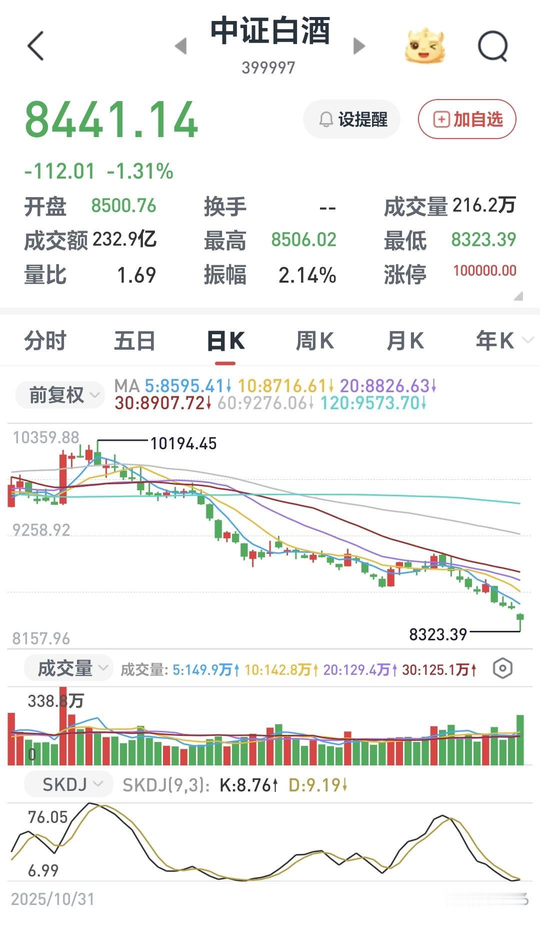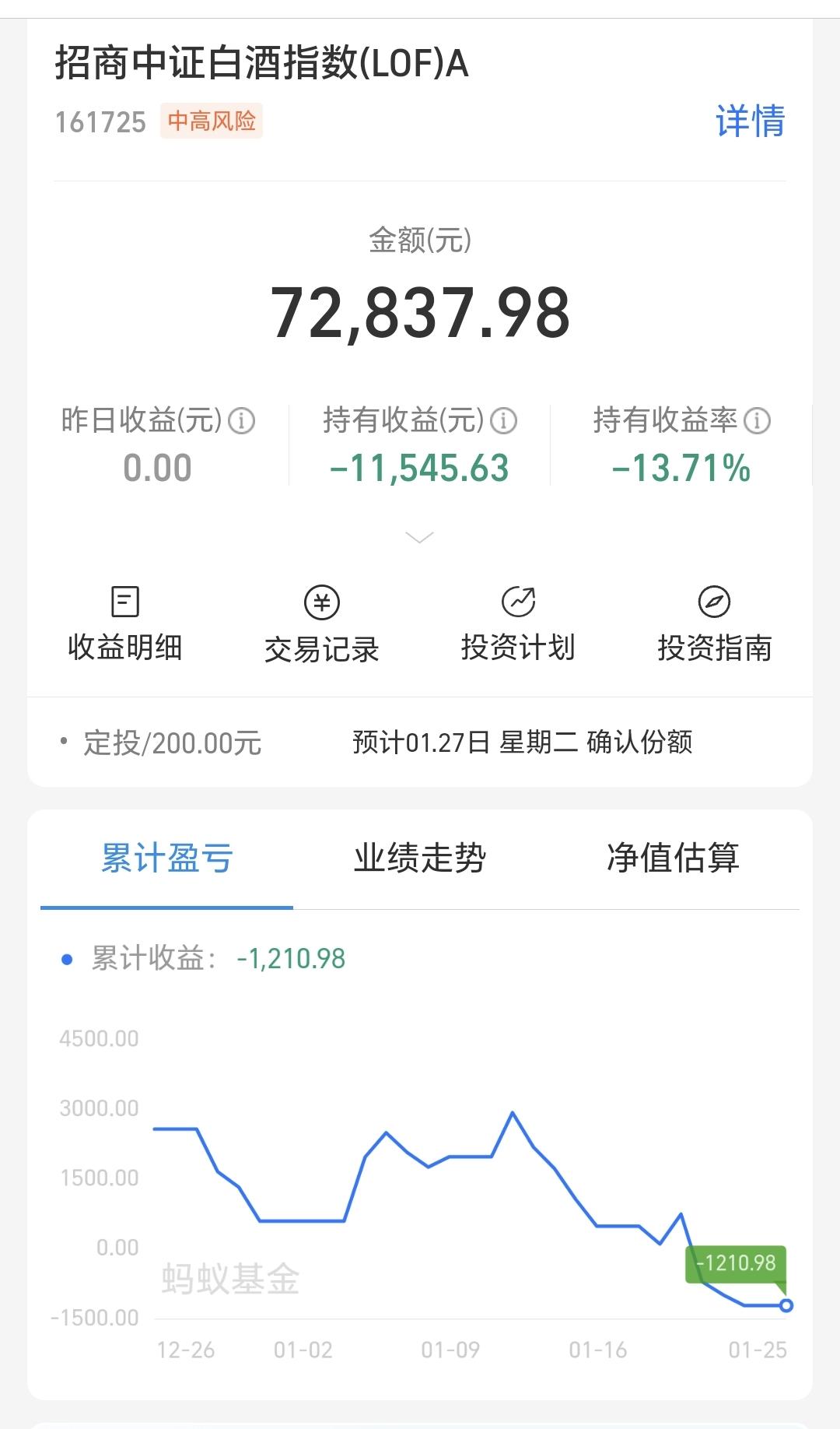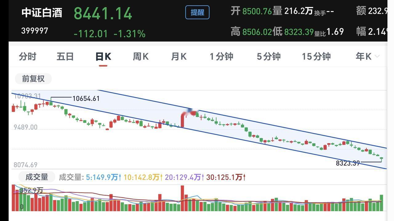 基金:白酒板块续下跌,什么时候可以考虑进场 白酒板块今天继续下跌,收盘的时候,中证白酒下跌了1.31%,日K线图上收了一个带有下影线的阴线,许多人说这是收了一个大长腿,可以大手笔进场了。 我认为: 1:今天的长下影线不符合进场的要求,因为,今天有一个向下的跳空缺口,盘中没有被回补,今天收的日K线为阴线,并不是红线。 2:今天的成交量是放大的,今天是有下影线的,如果今天收一个放量的,带有长下影线的红日K线,就可以考虑要不要进场,如果明天收一个放量的中大阳线,反包今天的阴线,明天就可以考虑要不要进场,如果不出现这些信号,就继续定投即可。 白酒板块基金我持有72837元,持有亏损11545元,持有亏损率13.71%,这不包括今天的下跌,晚上净值更新以后,持有亏损率会接近15%,每天定投200块钱,目标仓位10万块钱。 如果我把白酒板块基金仓位打到10万块钱,在我200万总资金里面,这个板块的基金占比只有5%,如果这个板块下跌100%,也就是把10万块钱全部跌没有了,对我整体资金的影响就是5%,如果这个板块下跌50%,也就是把10万块钱亏损成5万块钱,对我整体资金的影响就是2.5%,这个影响是很小的,这个影响是可以忽略不计的,这也是均衡配置的力量,这就是我坚持均衡配置的原因。 对于你自己持有的板块,也要注意这个方面,要坚持均衡配置,要控制持有占比高的板块,有机会的时候,就要把它的持有占比降下来,我去年对创新药板块的两次止盈,降低它的持有占比是主要的原因,那个时候,我创新药板块基金的持有金额达到了30几万,是我持有占比最高的基金,现在已经把它降低到了合理的位置。 今天商业航天板块下跌幅度比较大,我没有这个板块的基金,前段时间这个板块的上涨,我没有吃到这个板块的肉,对于我来说,它的涨跌都跟我没有关系,它上涨的时候没有我,它下跌的时候肯定也没有我,他吃肉的时候没有我,他挨打的时候也没有我,但对于有些追高的人来说,现在就是很尴尬,追高进去以后并没有吃到多少肉,但现在要回吐利润加本金,而且,对于这些高位板块来说,回吐起来的幅度不会小,上涨起来有多张扬,回吐起来就有多疯狂,但愿你不是这样的情况。 白酒板块我会继续定投,如果发现有进场信号,还会手动进场,但进场信号是可遇不可求的,只要耐心等待,肯定是有机会的。 大家帮忙评论,点赞,转发和分享,谢谢大家的支持。