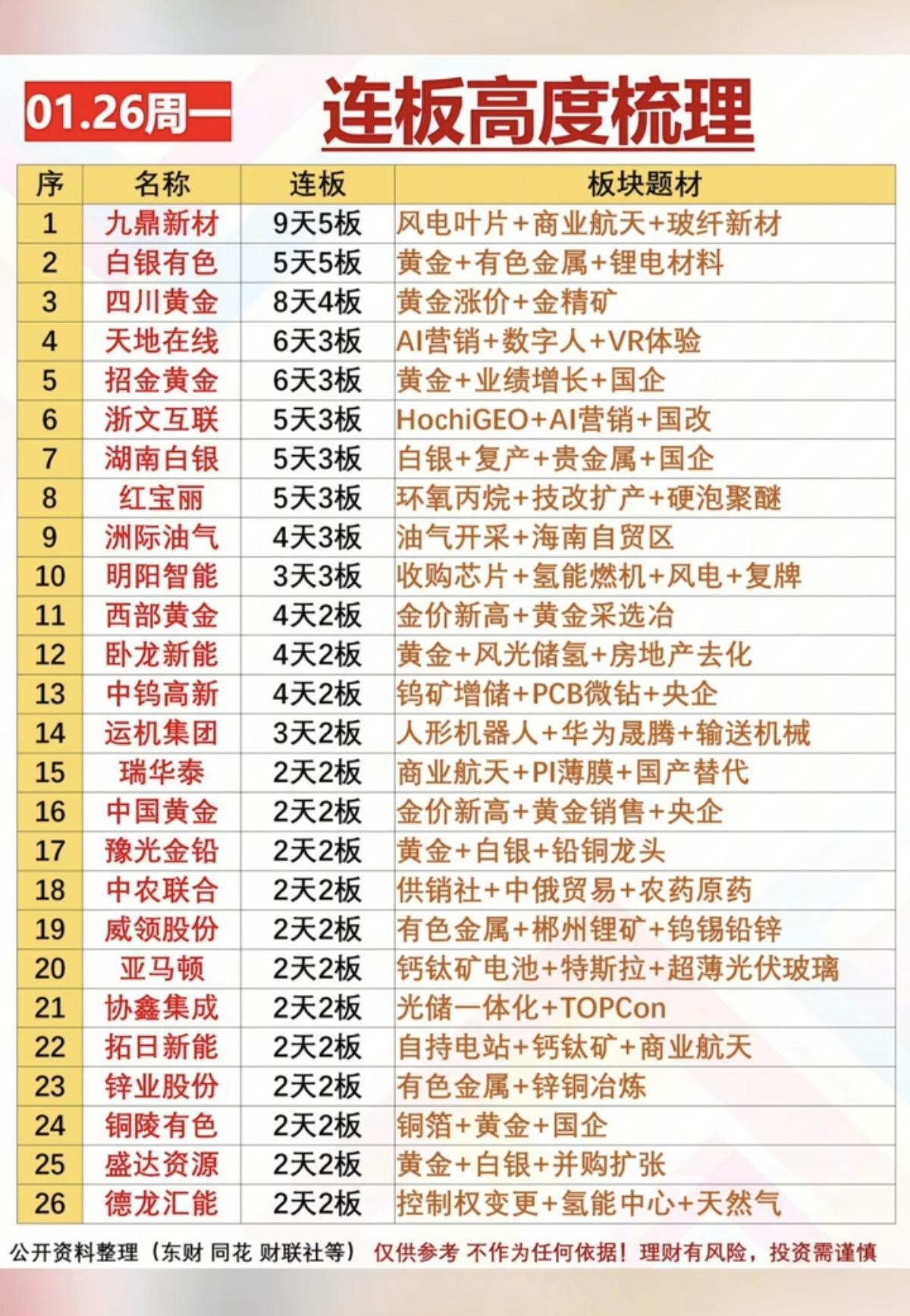 1.26周一 涨停板股票:连板高度! 九鼎新材 9天5板 白银有色 5天5板 四川黄金 8天4板 涨停板70家,跌停30家 涨跌比1604:3771