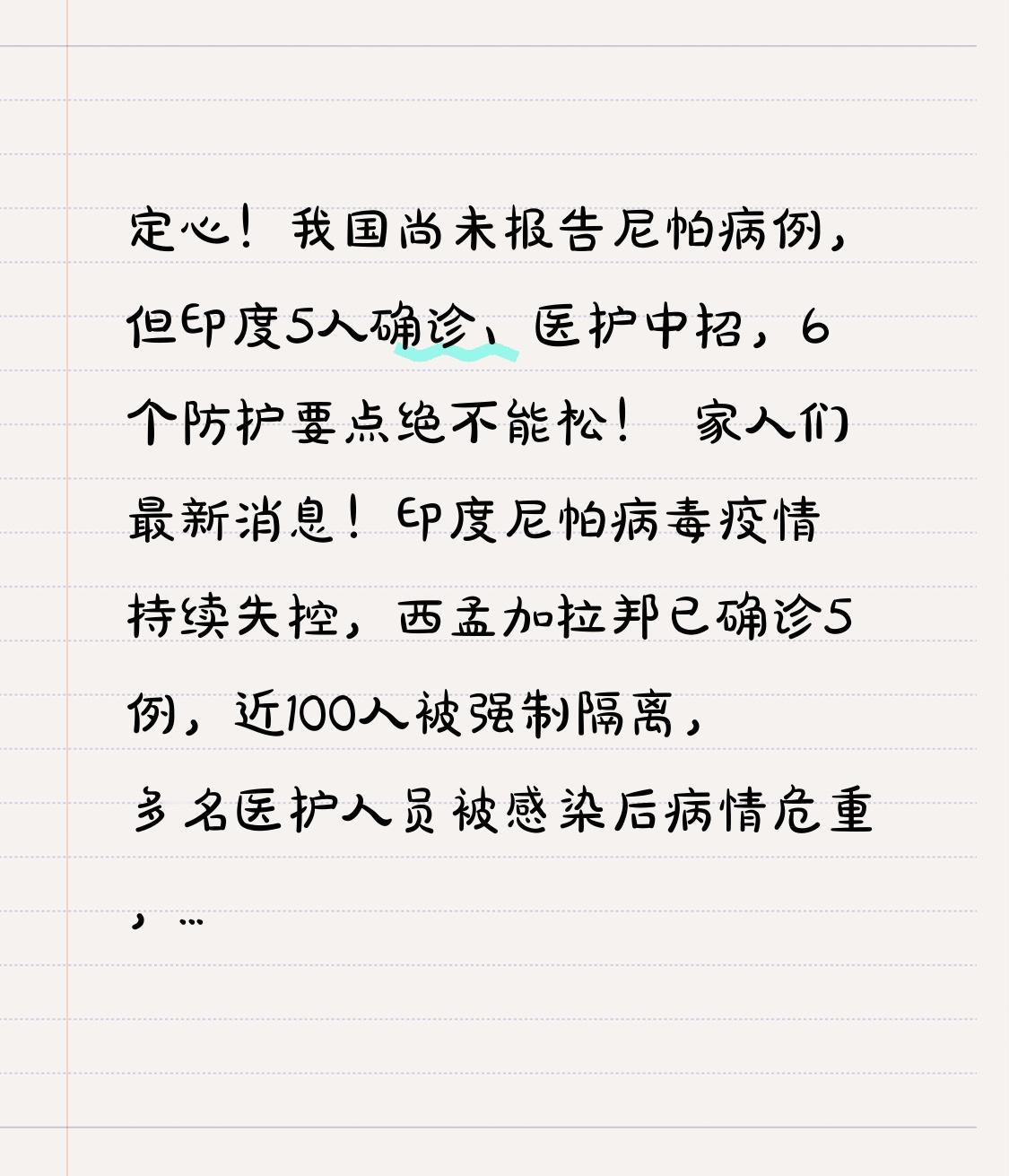 定心!我国尚未报告尼帕病例,但印度5人确诊、医护中招,6个防护要点绝不能松! 家人们最新消息!印度尼帕病毒疫情持续失控,西孟加拉邦已确诊5例,近100人被强制隔离,多名医护人员被感染后病情危重,而我国官方明确通报:目前尚未报告任何尼帕病毒相关病例!一边是致死率40%-75%的病毒突袭,一边是国内零病例的安心现状,这背后到底藏着怎样的防护底气? 可能有人会放松警惕:“既然国内没病例,那就不用怕了”,但看完病毒的凶险数据,你绝对不敢掉以轻心!尼帕病毒是世卫组织重点预警的致命病毒,孟加拉国曾出现71.7%的超高致死率,10个感染者就有7人丧命。它的传播途径还特别隐蔽,果蝠的唾液、尿液污染水果、椰枣汁,人食用后就可能感染,甚至能通过密切接触人传人,印度这次医护中招就是典型案例。更可怕的是它的“伪装性”,初期症状只是发烧、头痛,跟普通感冒没区别,可24-48小时内就可能引发脑炎、呼吸衰竭,目前全球无药可治、无疫苗可防! 但为啥我国能守住零病例防线?关键转折点就在这组硬核防控措施里!早在一年前,新修订的《国境卫生检疫法》就已将尼帕病毒纳入入境检测,全国主要机场、港口对来自印度疫区的旅客,实行体温检测、行程核查、症状筛查“三重把关”,疑似者直接隔离转运。云南、广西等边境省份的发热门诊,已专门新增尼帕病毒核酸检测项目,连生椰枣、椰枣汁这类高风险食品,都要经过P3级实验室检测才能入境,真正织密了“外防输入”的防护网。 不过零病例不代表零风险!结合世卫组织建议和国内疾控提醒,这6个防护要点一定要记牢,才能守住安全底线:第一,非必要不前往印度西孟加拉邦等疫区,有相关旅居史返程后,务必主动报备并做好14天健康监测;第二,水果必须彻底洗净削皮,掉在地上、有动物咬痕的果子直接丢弃,绝不食用;第三,坚决不喝生椰枣汁、未煮沸的生鲜果汁,饮品一定要加热消毒;第四,远离蝙蝠、病猪等野生动物,接触动物后用肥皂+流动水洗手20秒以上;第五,照顾发热患者时戴口罩、勤洗手,避免直接接触体液;第六,出现持续高烧+头痛嗜睡症状,立刻就医并主动说明旅行史。 从新冠防控到尼帕预警,我们早已明白:公共卫生安全没有“安全期”,零病例的背后,是国家提前布局的防控智慧,也是每个人自觉防护的共同努力。印度疫情的教训告诉我们,病毒传播不分国界,稍有疏忽就可能突破防线,而“早警惕、早防护”才是最有效的应对之道。 其实安心从来不是凭空而来,而是有人替我们筑牢防线,也需要我们自己守住细节。我国尚未出现病例是好事,但绝不能成为放松防护的理由。健康是自己的责任,多一份谨慎,就多一份安心。 屏幕前的你已经把防护要点告诉家人了吗?评论区聊聊你的看法,点赞转发,让更多人知道这个重要消息,一起守住来之不易的零病例成果!愿大家都能远离病毒,平安健康!