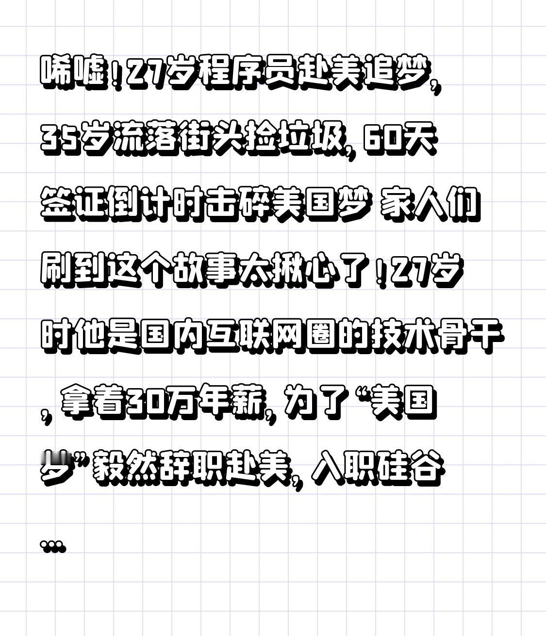 唏嘘!27岁程序员赴美追梦,35岁流落街头捡垃圾,60天签证倒计时击碎美国梦 家人们刷到这个故事太揪心了!27岁时他是国内互联网圈的技术骨干,拿着30万年薪,为了“美国梦”毅然辞职赴美,入职硅谷科技公司,一度成为亲戚朋友眼中的人生赢家。可谁能想到,8年后刚满35岁的他,竟然流落纽约街头,靠捡别人丢弃的食物为生,曾经敲代码的双手,如今只能翻垃圾桶,这到底是怎么回事? 故事的主角叫张明(化名),2018年,27岁的他凭借扎实的编程技能,拿到硅谷一家初创公司的offer,年薪折合人民币近百万,还能申请H1B签证,全家人都为他骄傲。那时候的他意气风发,在社交平台分享硅谷的工作日常,说“美国的技术环境更先进,35岁不会被淘汰”,让不少同行羡慕不已。 可光鲜背后,危机早已潜伏。这就是最关键的转折点:美国的职场竞争远比想象中残酷,尤其是对华人程序员。2023年,硅谷遭遇大规模裁员潮,张明所在的公司资金链断裂,他成了被裁名单中的一员。更致命的是,他持有的H1B签证有严格规定,失业后必须在60天内找到新工作,否则就得立刻离境。 他疯狂投递简历,可35岁的年龄成了硬伤。美国科技公司看似没有年龄限制,实则暗藏“潜规则”,更愿意招聘年轻、薪资要求低的新人,加上他的英文沟通能力不如本土员工,两个月里面试了30多家公司,全都石沉大海。签证到期后,他失去了合法居留身份,只能被迫黑在美国,存款很快花光,从月租3000美元的公寓搬到桥洞,最后彻底流落街头。 有人在纽约街头拍到他:头发凌乱,穿着破旧的外套,手里拎着装满废品的袋子,曾经的技术精英,如今连一顿热饭都成了奢望。更让人唏嘘的是,类似的案例并非个例:复旦博士在美国流浪16年,华尔街程序员失业半年就无家可归,美媒数据显示,67%的美国人收入仅能维持生计,59%的人拿不出1000美元应急资金,一旦遭遇失业、生病等变故,很容易陷入绝境。 很多人不解,他为啥不回国?其实不是不想回,而是多年在美国的打拼让他与国内职场脱节,35岁的年龄在国内互联网圈也面临“中年危机”,加上自尊心作祟,他迟迟不愿低头。可他忘了,所谓的“美国梦”,从来不是靠光环支撑,而是需要抗风险能力。他把所有希望寄托在一份工作上,没有存款储备,没有人脉积累,一旦失业,就成了无依无靠的孤家寡人。 这个故事戳中了多少打工人的痛点?我们总以为“远方才有更好的机会”,却忽略了生活的本质是安稳与底气。不管是留在国内还是出国打拼,职业规划、存款储备、抗风险能力才是最重要的。35岁不是人生的“淘汰线”,但盲目跟风、缺乏规划,再光鲜的起点也可能跌落谷底。 屏幕前的你,怎么看待“美国梦”与中年危机?如果是你,会选择坚守还是及时止损?评论区聊聊你的看法,点赞转发,让更多人知道:追梦没有错,但一定要留好退路,生活的安全感,从来都是自己给的!愿每个打拼的人,都能守住初心,也能拥有抵御风险的底气!