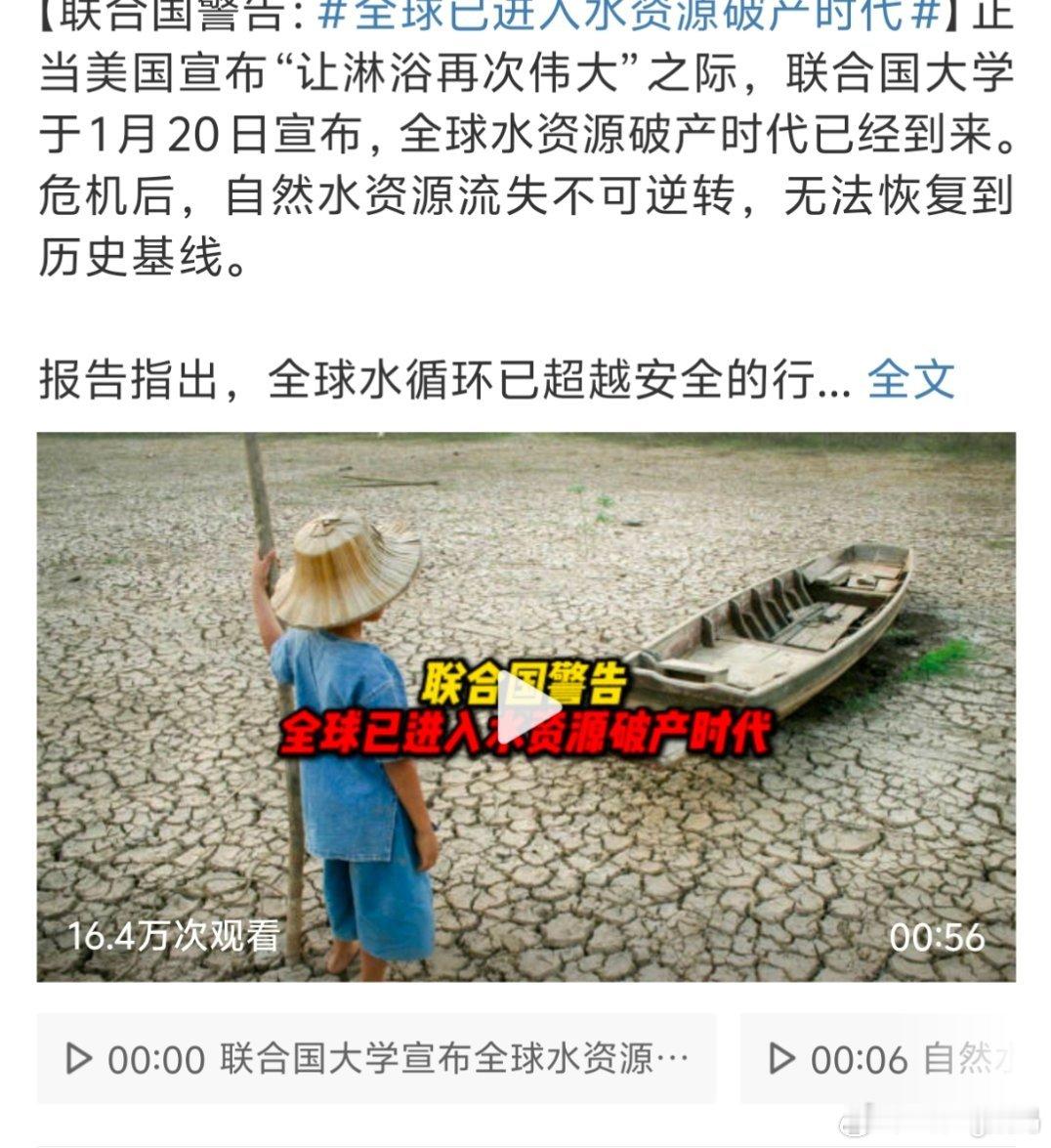 全球已进入水资源破产时代很多地方都没有干净的纯净水喝我们还是被保护的太好了