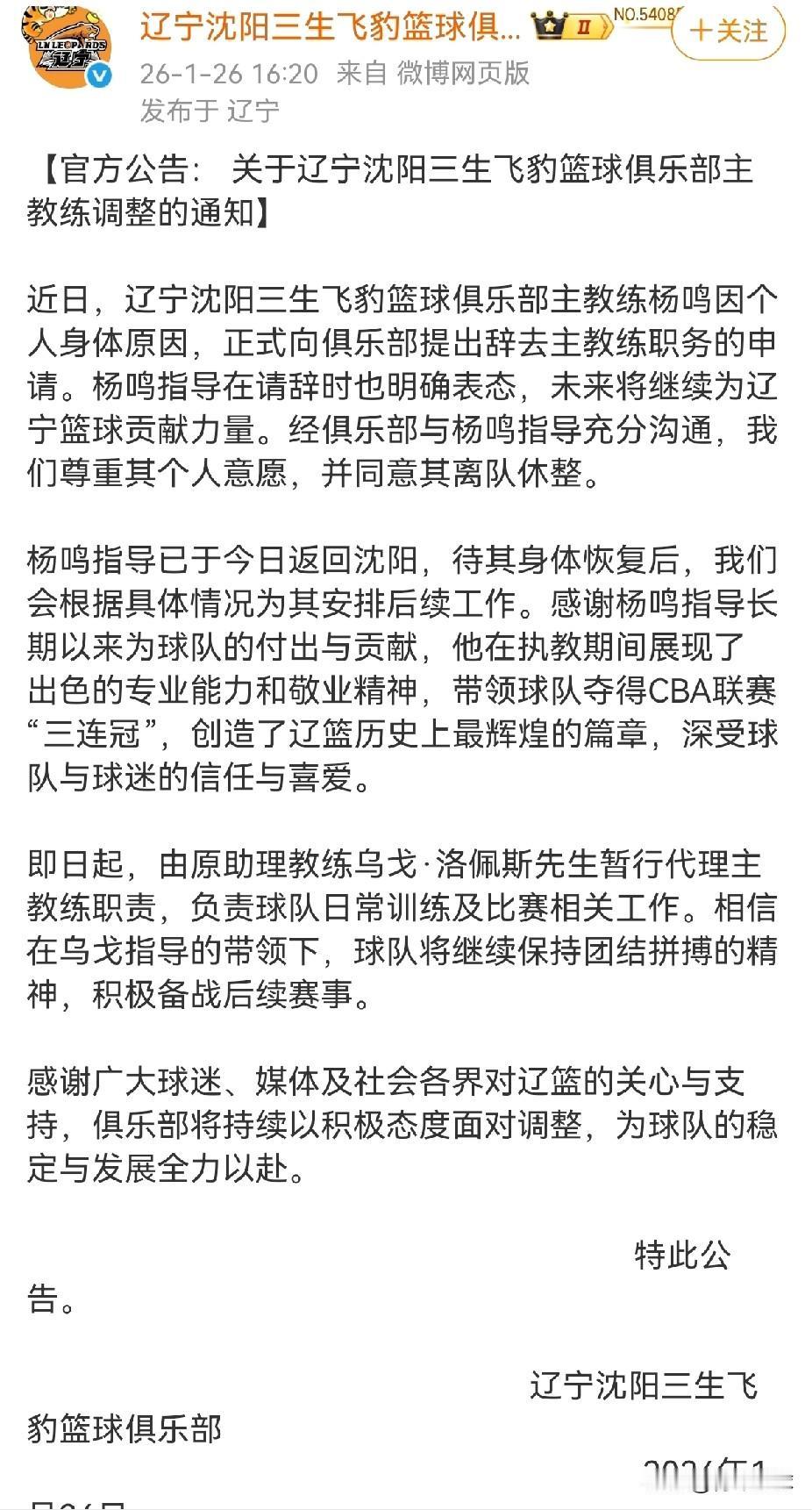 辽宁男篮终于官宣了! 2026年1月26日下午16点20分,辽宁男篮官方发布了公告,对球队主教练做出了调整,杨鸣因个人身体原因辞职,助理教练乌戈接任。 辽宁男篮终于官宣了,杨鸣指导最终还是离职了。回顾过去,杨鸣在辽宁男篮历史上留下了浓墨重彩的一笔。15年的球员生涯,获得了一个总冠军及球衣退役荣誉;2020年临危受命转型出任球队主教练,带领球队走出泥潭拿下三连冠建立王朝。无论是球员还是主教练时期,杨鸣都功勋卓著,足够精彩!