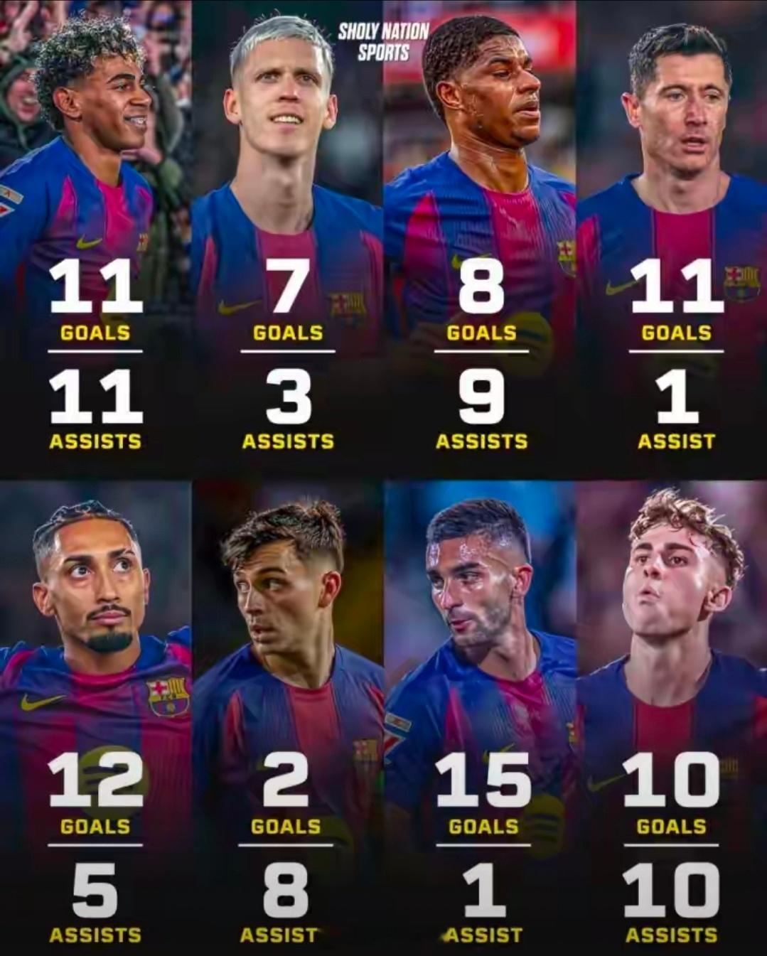 西甲争冠为啥看好1分领跑的巴萨?因为多点开花 8人参与进球上双西甲第21轮战罢,巴萨和皇马都赢球了,这样巴萨依然是1分力压皇马领跑西甲积分榜。为什么有更多的媒体和球迷看好巴萨可以夺得本赛季的西甲冠军?虽然皇萨两队的防守都不怎么样,但巴萨的进攻比皇马更犀利,主要体现在多点开花上。巴萨本赛季多达8人参与进球上双:亚马尔:参与22球,11球11助。费尔明:参与20球,10球10助。拉菲尼亚:参与17球,12球5助。拉什福德:参与17球,8球9助。费兰-托雷斯:参与16球,15球1助。莱万:参与12球,11球1助。佩德里:参与10球,2球8助。奥尔莫:参与10球,7球3助。不得不说巴萨进攻真核是拉菲尼亚,因伤缺席了这么久,复出之后火力全开,已经参与17球,追平了拉什福德,曼联太子要想留在巴萨,本赛季剩余赛程仍需努力,再帮助巴萨夺上几冠。足球