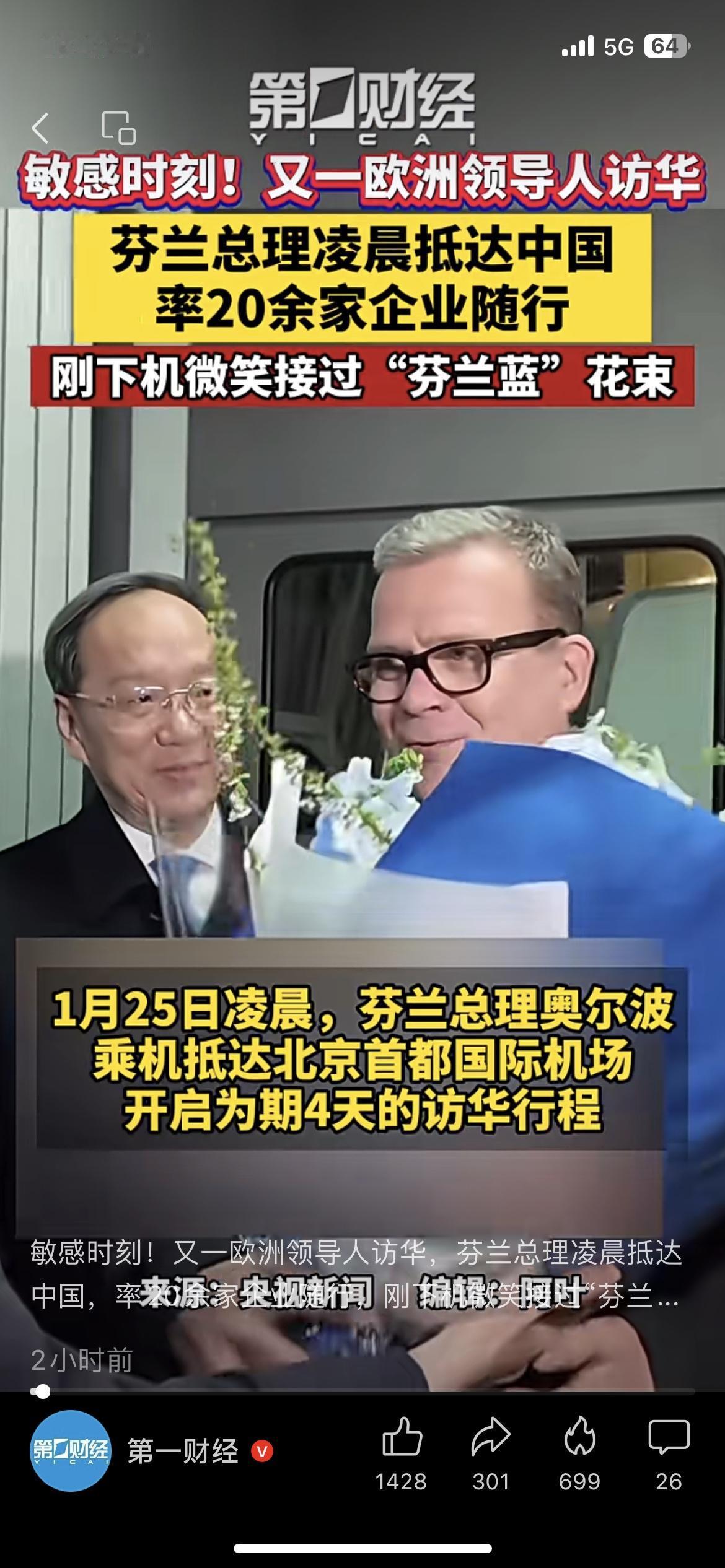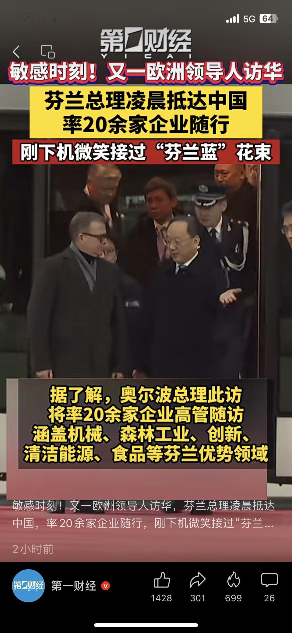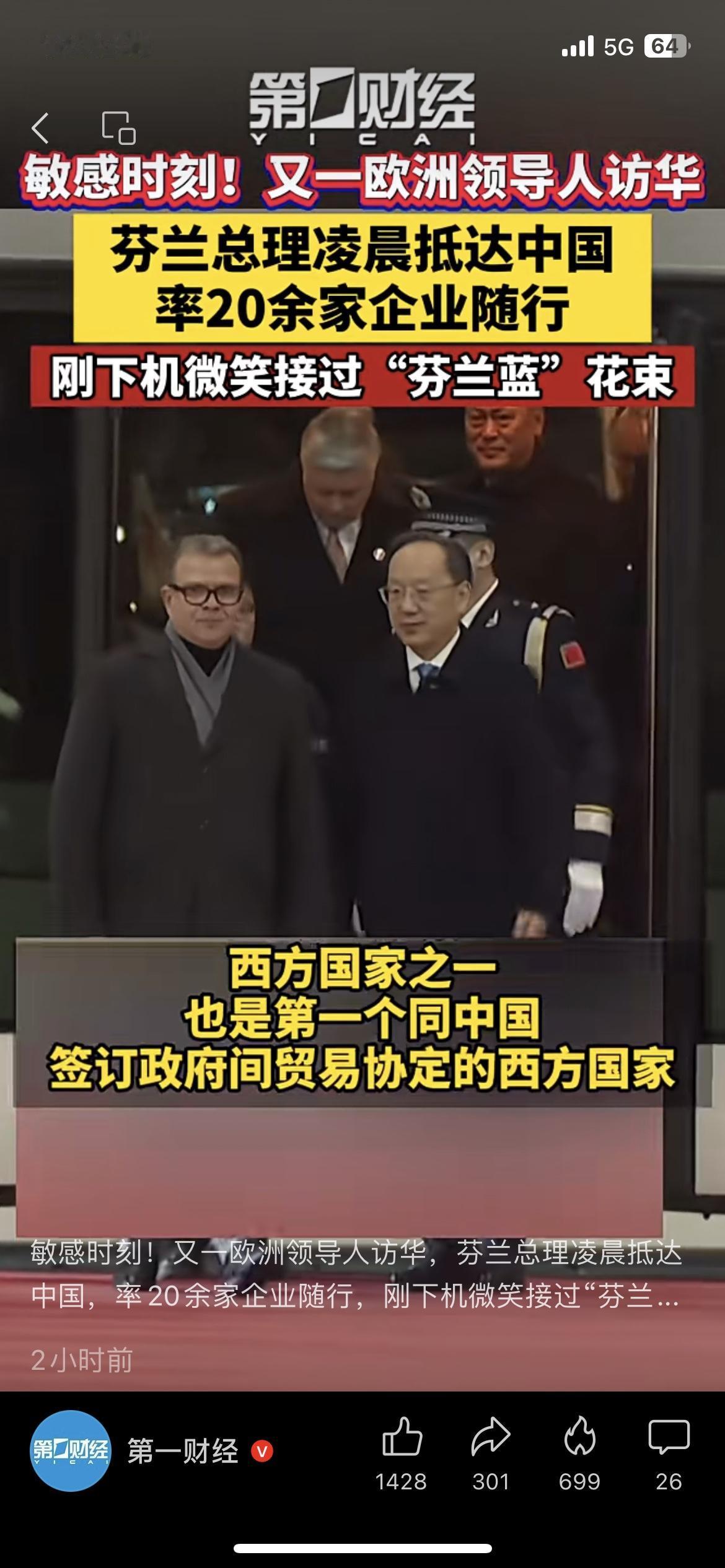 ✈️芬兰总理凌晨抵华访华! 亲自率20余家企业随行,刚下机就收到专属“芬兰蓝”花束,芬兰也是首个和中国签政府间贸易协定的西方国家,这波合作信号拉满了! 你觉得这会带动更多欧洲国家来华谈合作吗? 芬兰总理访华 中欧经贸