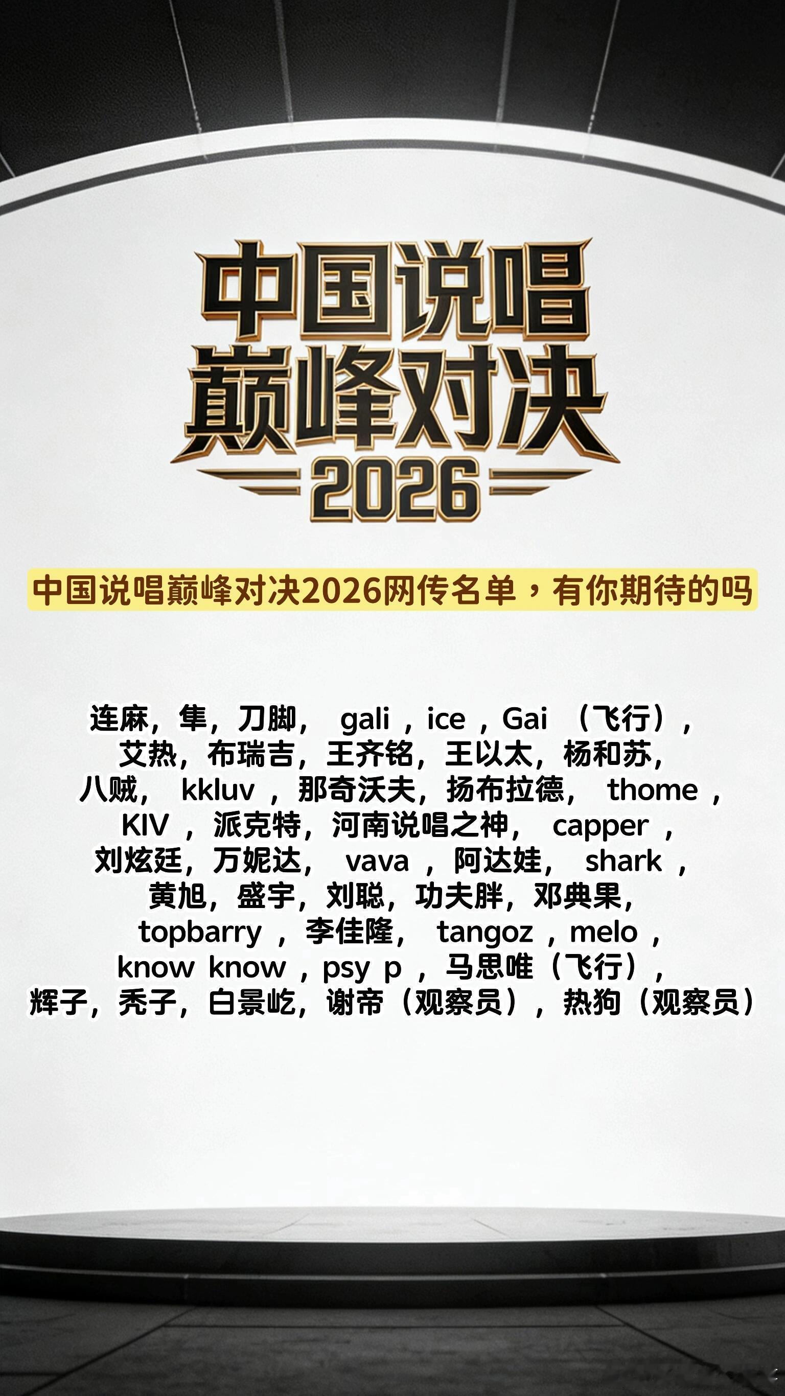 中国说唱巅峰对决2026网传名单,你期待吗音综:中国说唱巅峰对决2026开拍时间:2026年4月录制地点:上海拟邀参赛 :连麻,隼,刀脚, gali , ice , Gai (飞行),艾热,布瑞吉,王齐铭,王以太,杨和苏,八贼, kkluv ,那奇沃夫,扬布拉德, thome , KIV ,派克特,河南说唱之神, capper ,刘炫廷,万妮达, vava ,阿达娃, shark ,黄旭,盛宇,刘聪,功夫胖,邓典果, topbarry ,李佳隆, tangoz , melo , know know , psy p ,马思唯(飞行),辉子,秃子,白景屹,谢帝(观察员),热狗(观察员)《巅峰对决2026》拟邀名单你们期待了吗?