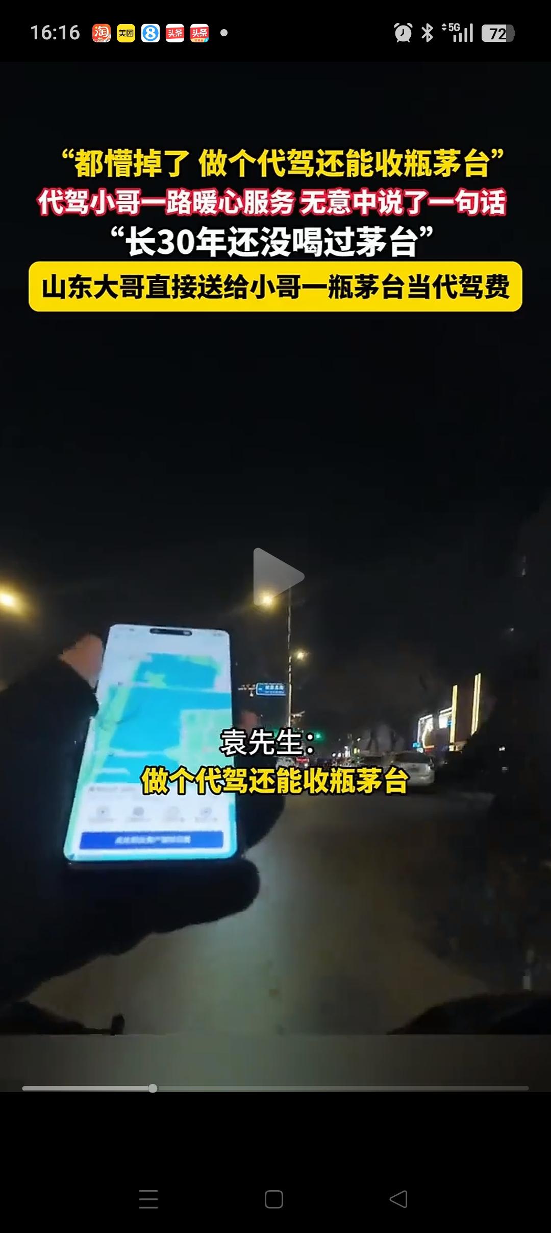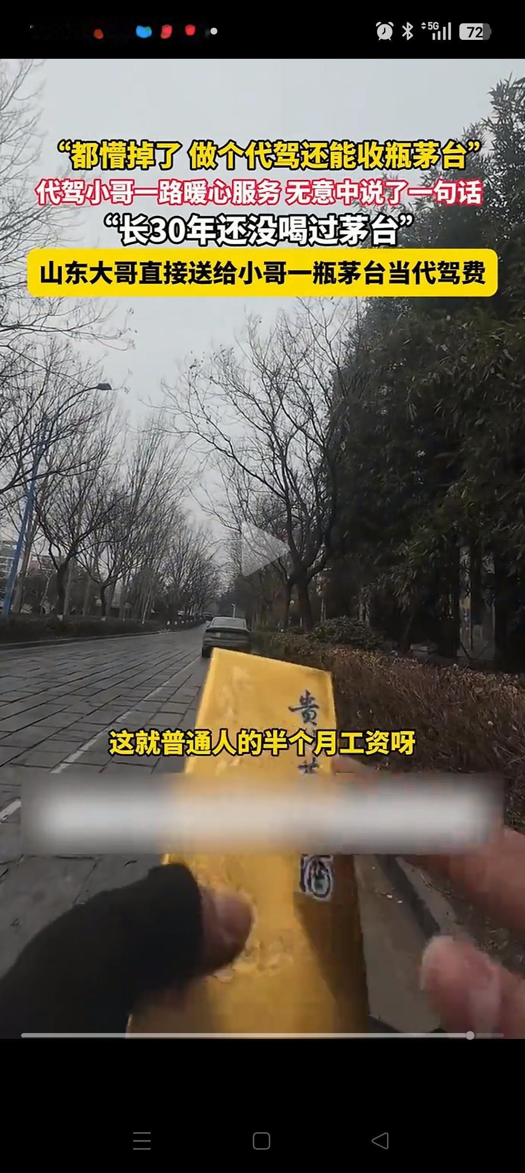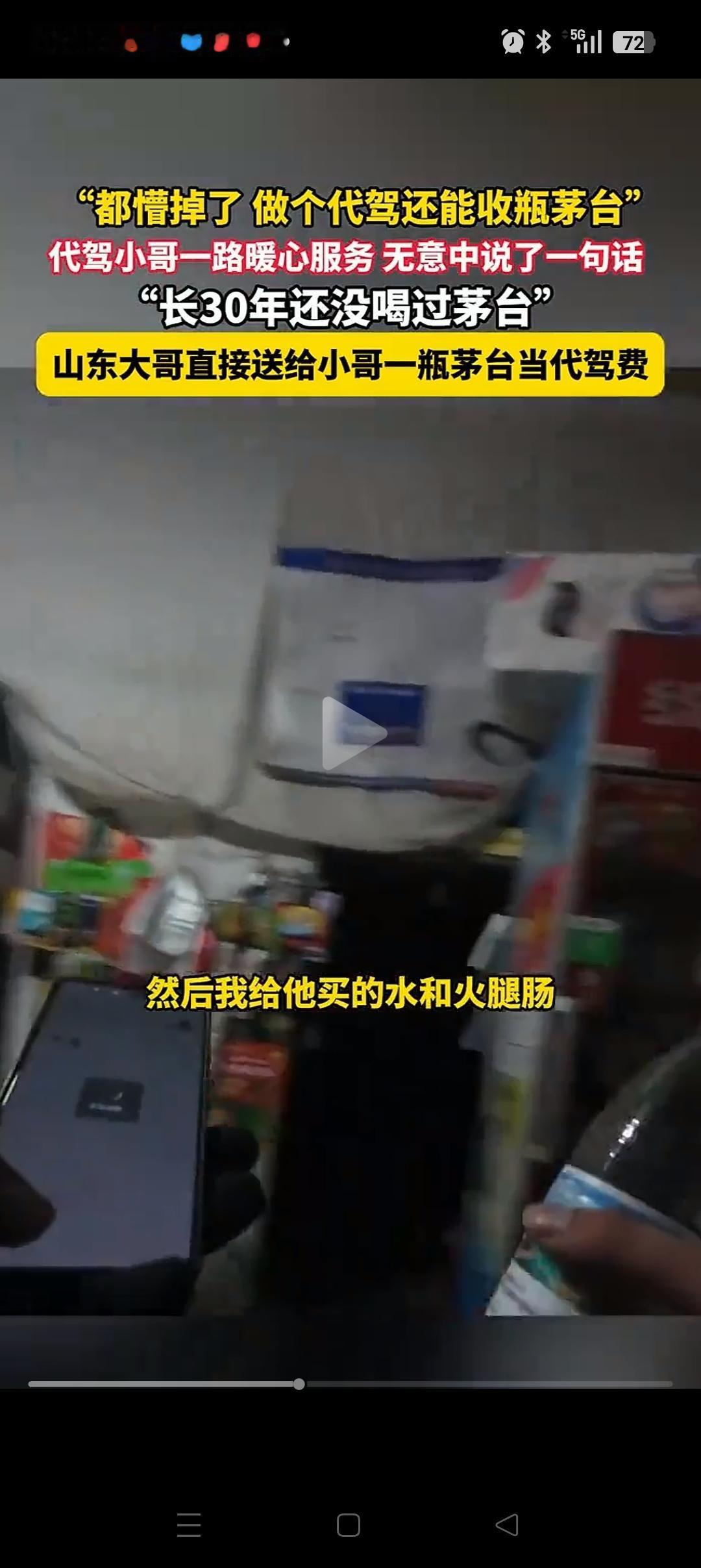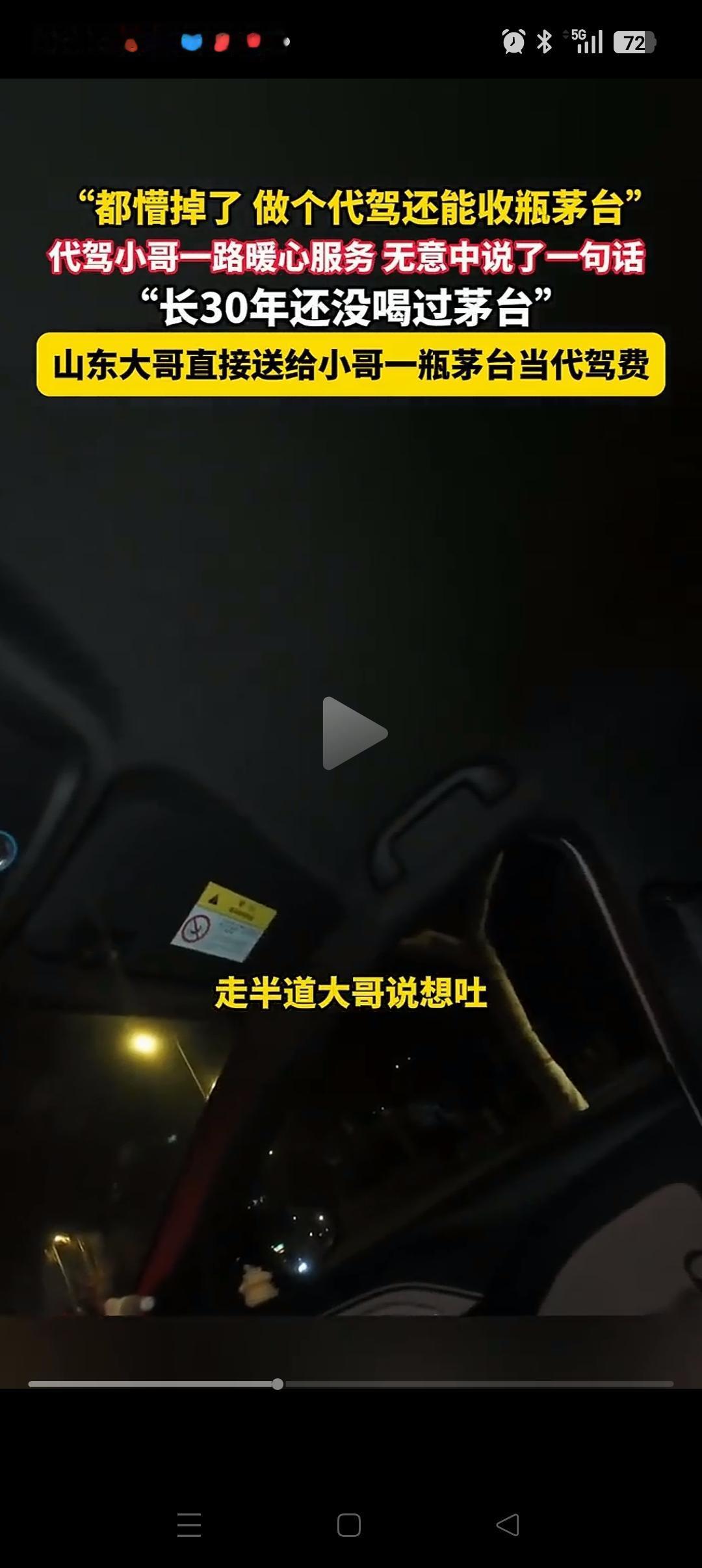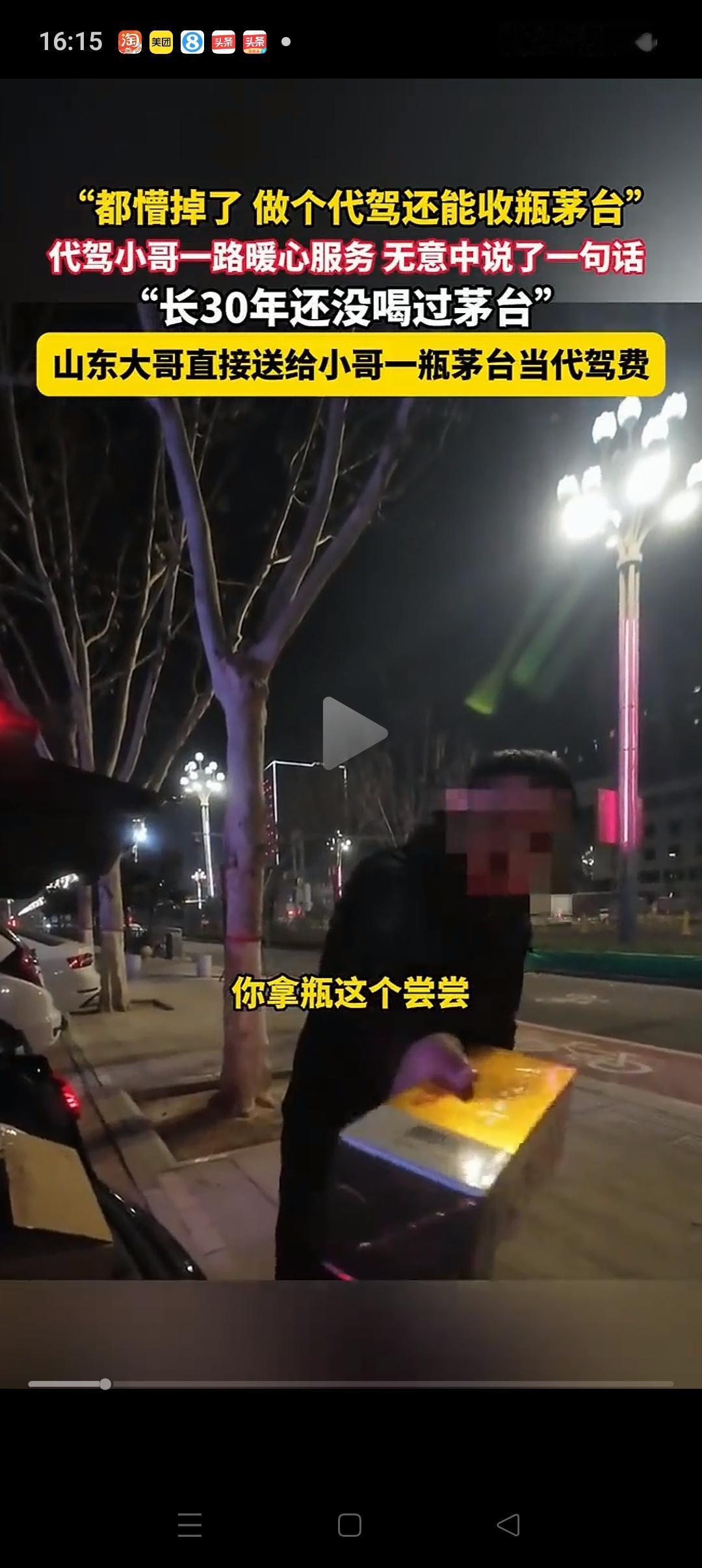 难怪人家能发财!山东,一代驾小哥把车主送到目的地,小哥刚想说代驾费的事。哪知车主一句话让他懵了!他说:这瓶茅台酒就送给你喝喝吧,代驾费我就不给了哈。 原来车主喝醉了,上车后很难受。代驾小哥就拿出一瓶酸奶给他喝,半路上还给他买水和火腿肠。两个人也聊了一会,聊到那瓶酒时,代驾小哥很羡慕,表示自己30多年从来没喝过。 哪曾想就因为这不经意的一句话,大哥居然就要把这瓶酒送给他。 其实这种事也不能尽信,前段时间就有一个小女孩从地摊上换回茅台酒的事,最后也被证实是摆拍,假的。 这件事也还有待证实。但如果是真的,只能说大哥是个敞亮人,也可能是真的喝醉了[捂脸][捂脸]