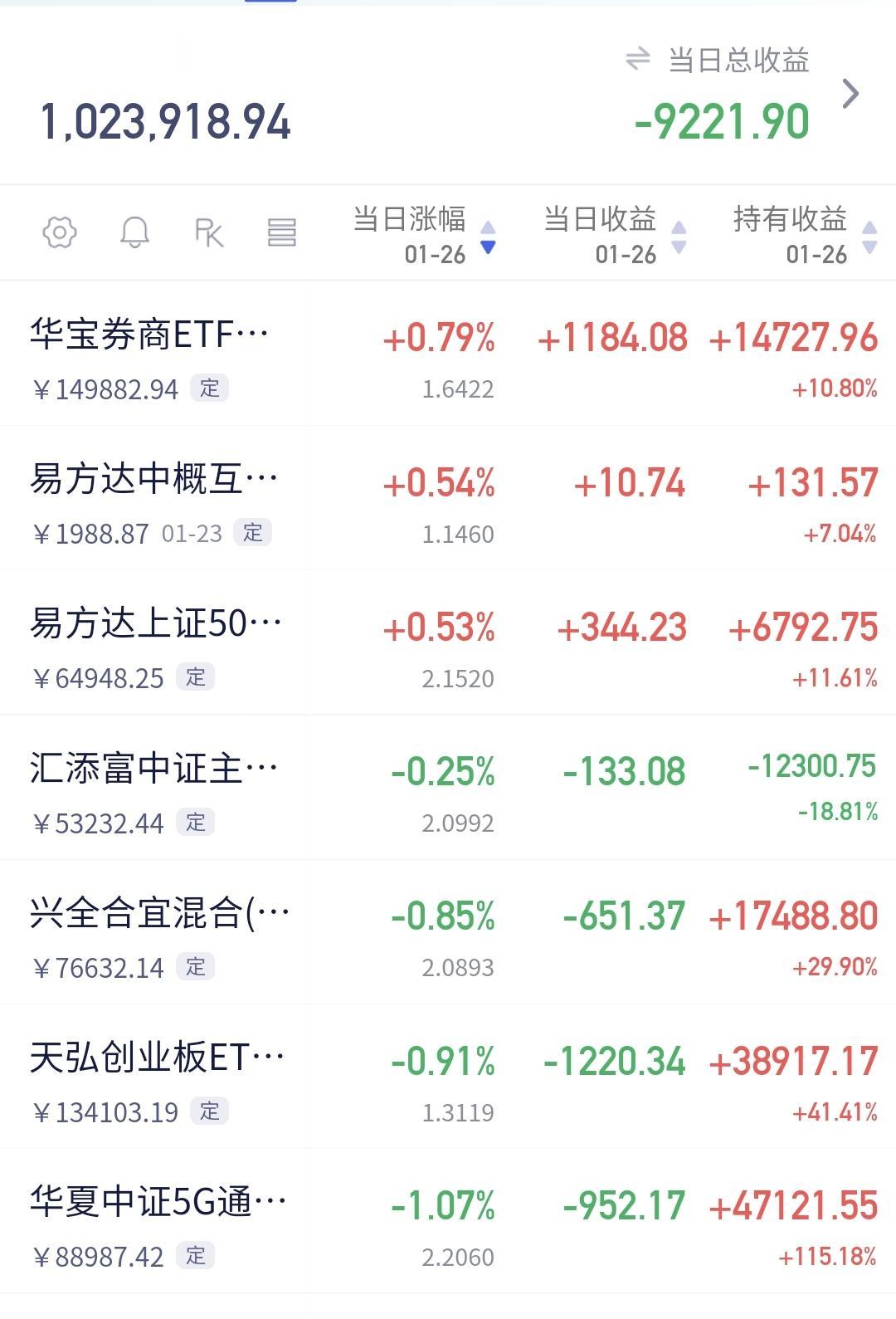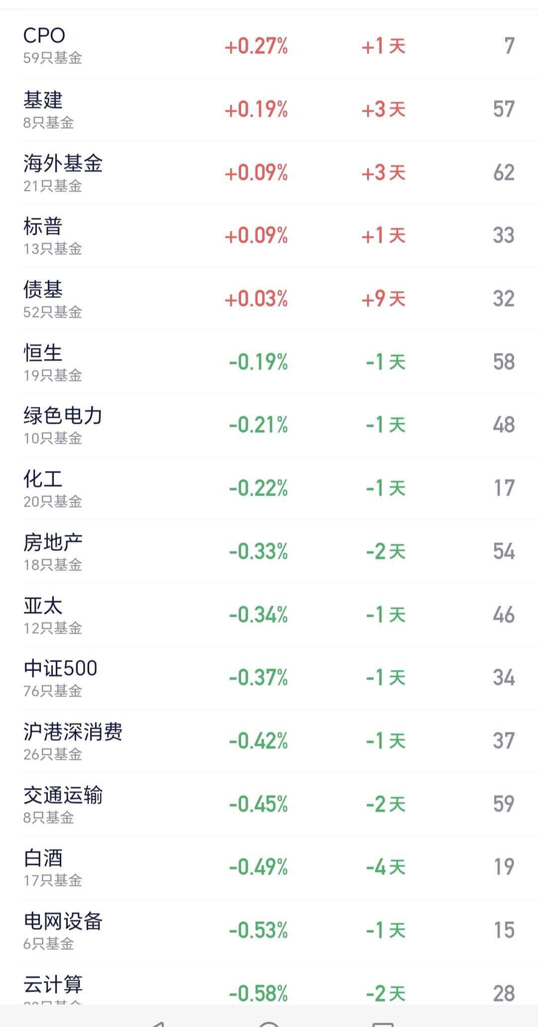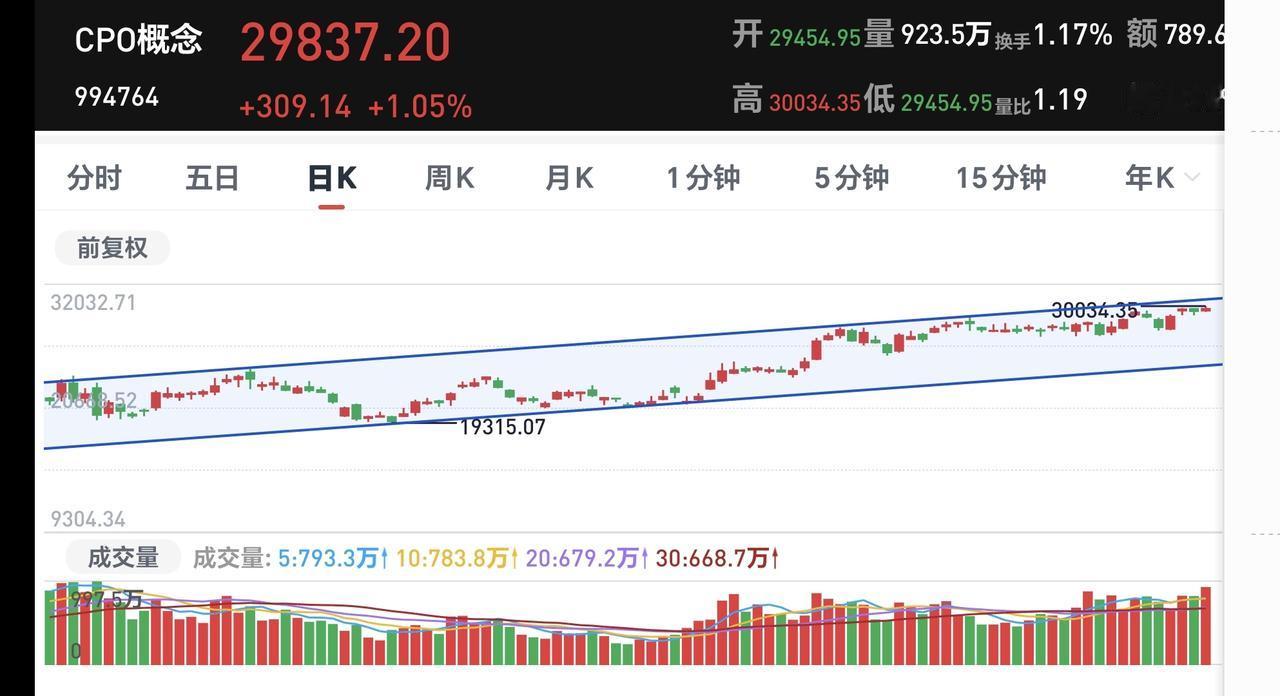 基金:最近的操作策略是什么 今天市场高开以后小幅度震荡走低,收盘的时候三大指数都是下跌,创业板指下跌了0.91%,收于3319点,上证指数下跌了0.09%,收于4132点。 整个股票市场,上涨1607家,下跌3776家,涨停80家,跌停43家,上涨家数少于下跌家数。 今天两市累计成交32482亿,相比于上周五放量了5%,内资净流出1539亿。 持有的基金中,下午收盘的时候,估值上涨幅度最大的三个板块是:证券板块,海外互联网板块,上证50板块,估值下跌幅度最大的三个板块是:军工板块,可控核聚变板块,新能源汽车板块,估值整体亏损了9221元。 整个基金市场,上涨10414家,下跌9007家,上涨幅度超过5%的87家,下跌幅度超过5%的89家。 图9是今天基金的上涨排行榜,图10是今天基金的下跌排行榜,图11是ETF上涨幅度排行榜,图12是今天基金的加仓榜,图13是今天基金的减仓榜。 1:今天收盘的时候,五天线位置是4124点,收盘点位4132点,收在五天线之上,只要不跌破五天线,就不能确定市场已经走坏。 2:今天主力资金净流出超过了1000亿,看下面的截图14,盘中指数有震荡的时候,主力资金不管指数是上涨还是下跌,都是在坚定不移的净流出,这说明了主力资金的一种态度。 3:Cpo板块今天是上涨的,见下面的截图15,收盘的时候估值上涨了0.27%,这个板块的持有人数在所有板块当中排名第7位,这个板块里面的散户人数也是比较多。 看下面的截图16,这是CPO板块日K线图,最近是在上涨通道上轨线下方震荡,这个地方可以继续持有,进场需要谨慎,毕竟它距离上涨通道的上轨线比较近。 看下面的地图17,这是CPO板块周K线图,现在的位置也是处于上涨通道内,距离上涨通道的下轨线更近一些,想进场的人,可以耐心等待震荡回落到上涨通道下轨线附近的时候,如果不跌破这条下轨线,就可以考虑要不要进场。 近期的策略比较简单,持有的人可以继续持有,如果向上,可以考虑再一次止盈,如果向下,可以考虑捞回前期止盈的筹码,在这过程当中就是观望。 大家帮忙评论,点赞,转发和分享,谢谢大家的支持。