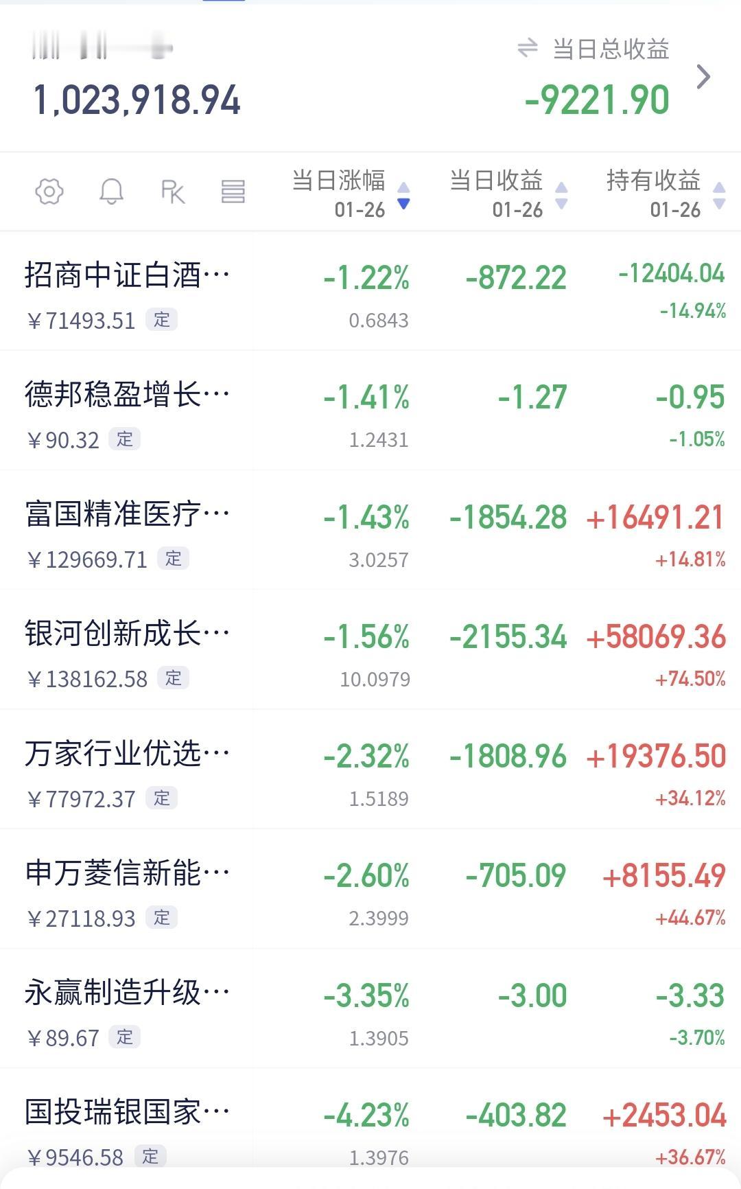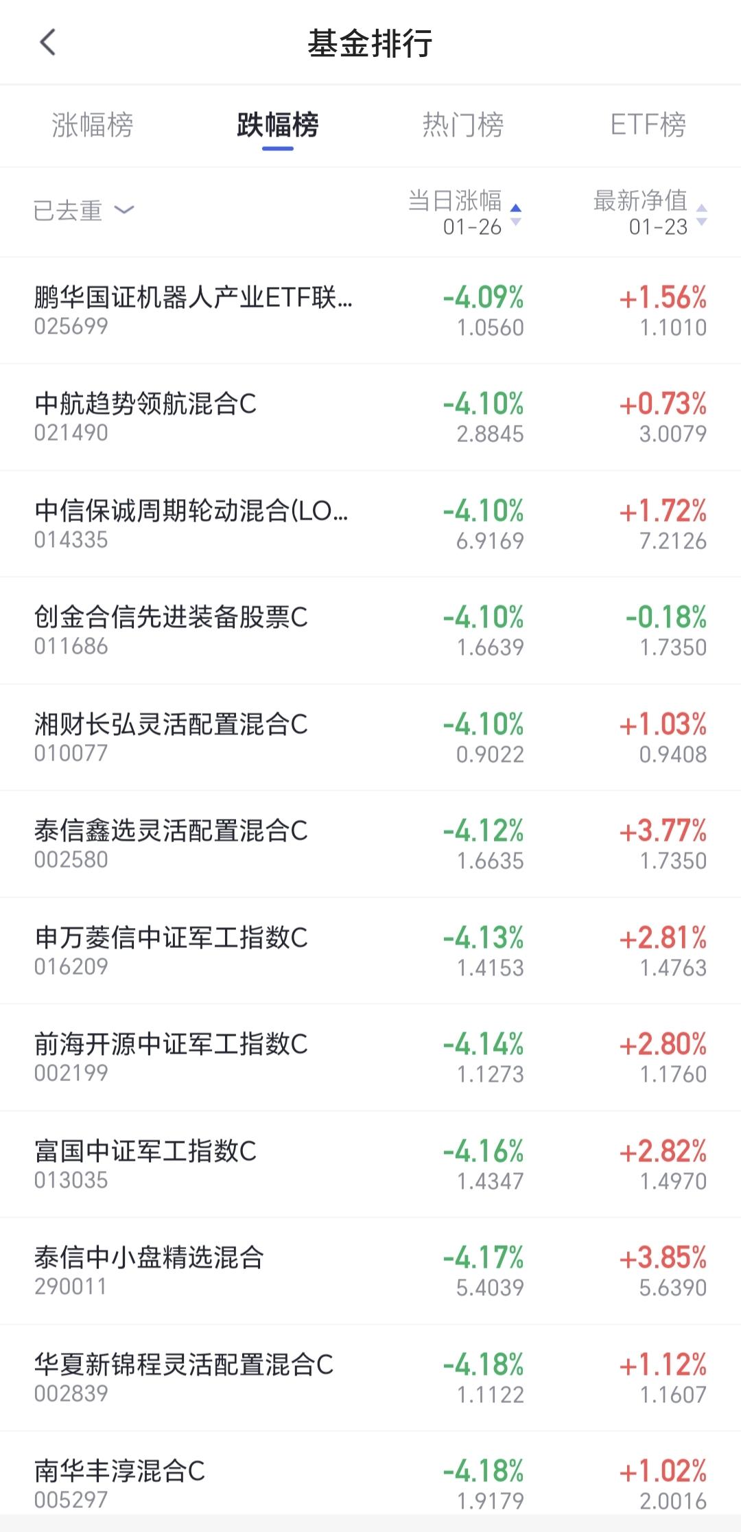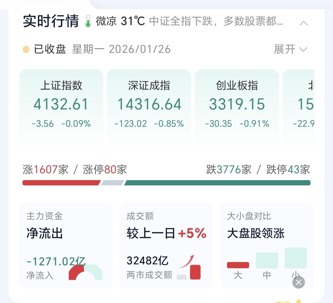 基金:最近的操作策略是什么 今天市场高开以后小幅度震荡走低,收盘的时候三大指数都是下跌,创业板指下跌了0.91%,收于3319点,上证指数下跌了0.09%,收于4132点。 整个股票市场,上涨1607家,下跌3776家,涨停80家,跌停43家,上涨家数少于下跌家数。 今天两市累计成交32482亿,相比于上周五放量了5%,内资净流出1539亿。 持有的基金中,下午收盘的时候,估值上涨幅度最大的三个板块是:证券板块,海外互联网板块,上证50板块,估值下跌幅度最大的三个板块是:军工板块,可控核聚变板块,新能源汽车板块,估值整体亏损了9221元。 整个基金市场,上涨10414家,下跌9007家,上涨幅度超过5%的87家,下跌幅度超过5%的89家。 图9是今天基金的上涨排行榜,图10是今天基金的下跌排行榜,图11是ETF上涨幅度排行榜,图12是今天基金的加仓榜,图13是今天基金的减仓榜。 1:今天收盘的时候,五天线位置是4124点,收盘点位4132点,收在五天线之上,只要不跌破五天线,就不能确定市场已经走坏。 2:今天主力资金净流出超过了1000亿,看下面的截图14,盘中指数有震荡的时候,主力资金不管指数是上涨还是下跌,都是在坚定不移的净流出,这说明了主力资金的一种态度。 3:Cpo板块今天是上涨的,见下面的截图15,收盘的时候估值上涨了0.27%,这个板块的持有人数在所有板块当中排名第7位,这个板块里面的散户人数也是比较多。 看下面的截图16,这是CPO板块日K线图,最近是在上涨通道上轨线下方震荡,这个地方可以继续持有,进场需要谨慎,毕竟它距离上涨通道的上轨线比较近。 看下面的地图17,这是CPO板块周K线图,现在的位置也是处于上涨通道内,距离上涨通道的下轨线更近一些,想进场的人,可以耐心等待震荡回落到上涨通道下轨线附近的时候,如果不跌破这条下轨线,就可以考虑要不要进场。 近期的策略比较简单,持有的人可以继续持有,如果向上,可以考虑再一次止盈,如果向下,可以考虑捞回前期止盈的筹码,在这过程当中就是观望。 大家帮忙评论,点赞,转发和分享,谢谢大家的支持。