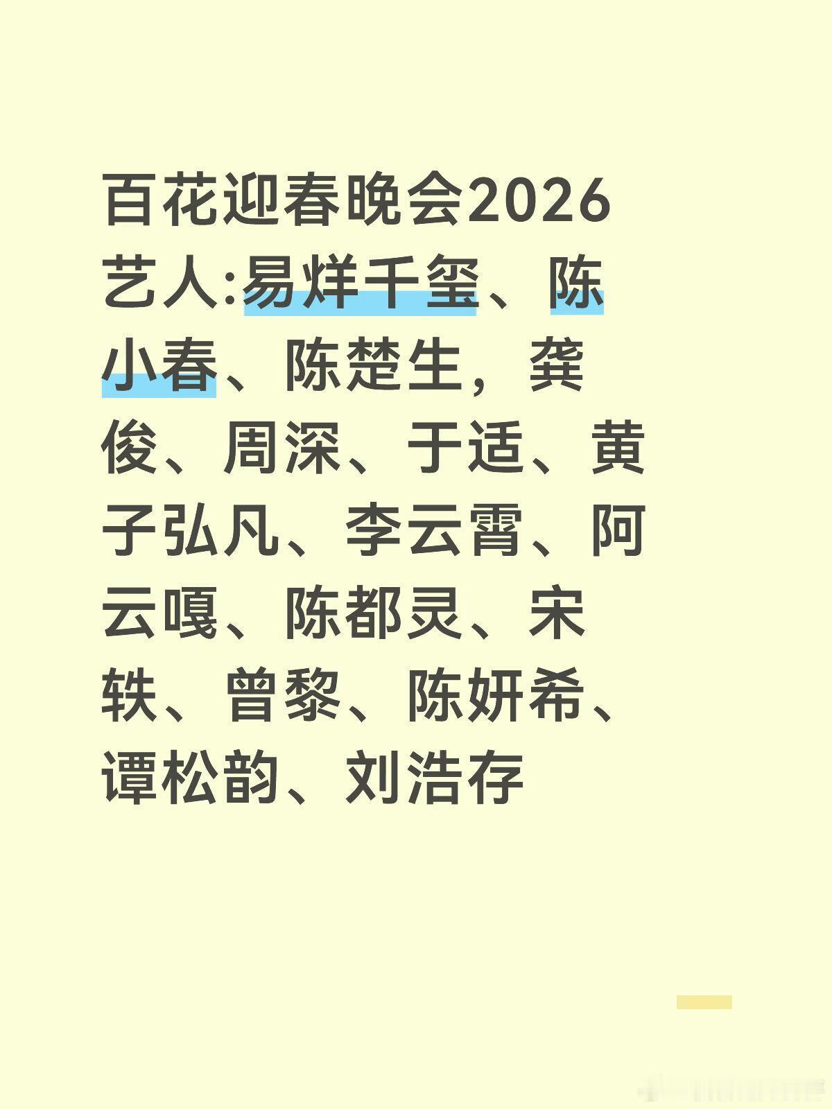 百花迎春晚会2026艺人:易烊千玺、陈小春、陈楚生,龚俊、周深、于适、黄子弘凡、李云霄、阿云嘎、陈都灵、宋轶、曾黎、陈妍希、谭松韵、刘浩存百花迎春晚会|