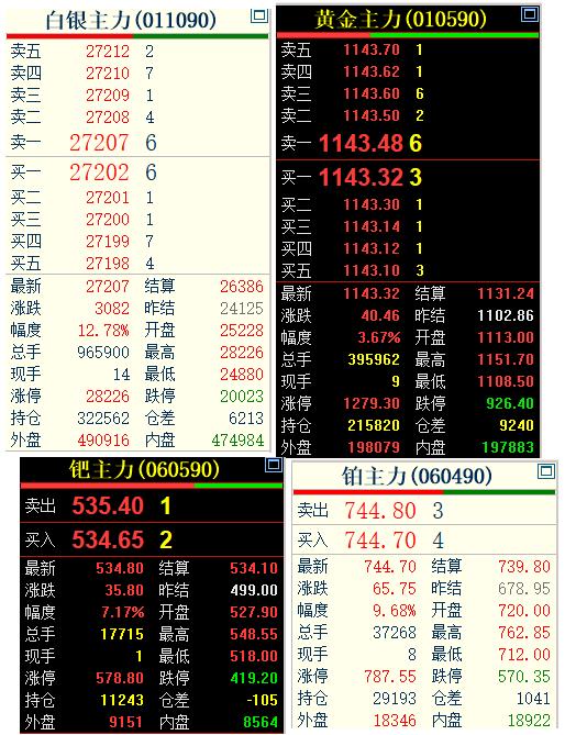 星期一, 随着外盘的价格的上涨, 国内贵金属四大品种 齐刷刷上涨,集体飙升。 黄金和白银再度历史新高。 1月26日, 国内黄金期货主力合约 收盘于1143.62元,涨幅3.67%; 广期所的钯金主力涨7.17%, 铂金主力上涨9.68%; 白银期货主力合约 收盘于27207手,涨幅12.78%。 虽然黄金和白银,新高不断, 但是谨慎参与,注意风险!