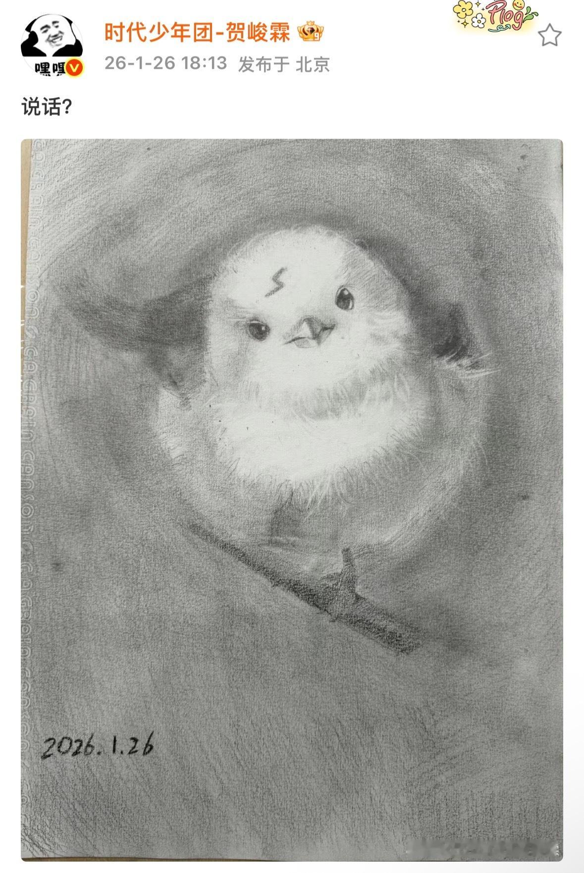 坏了我们全能贺老师真没短板了啥时候给富贵来一张!贺峻霖画的素描小鸟贺峻霖画的闪电疤小鸟
