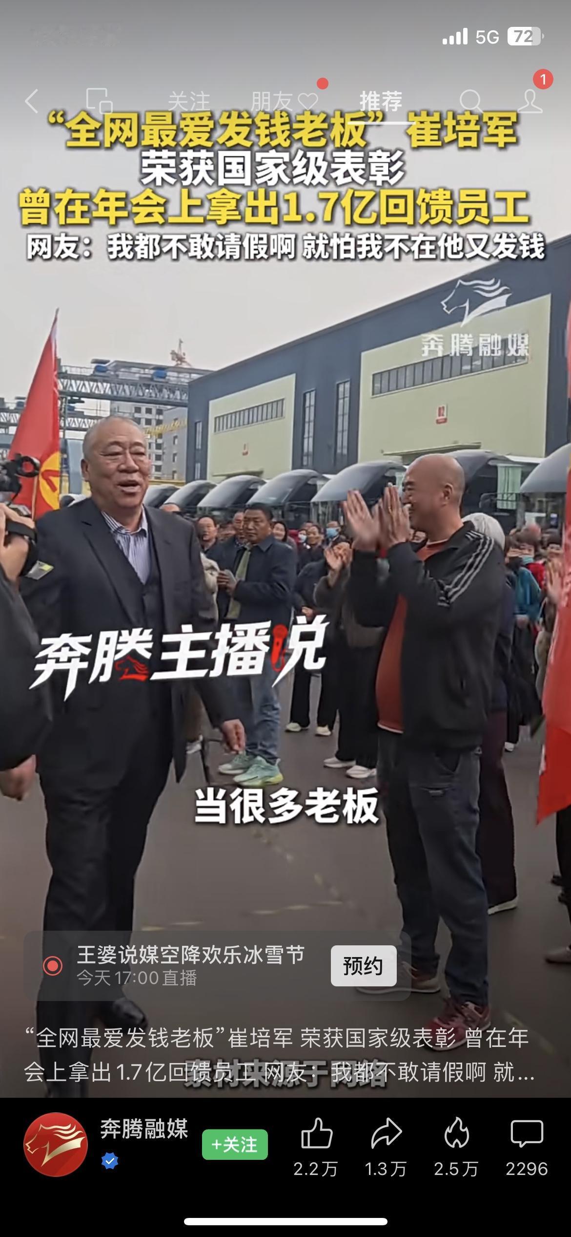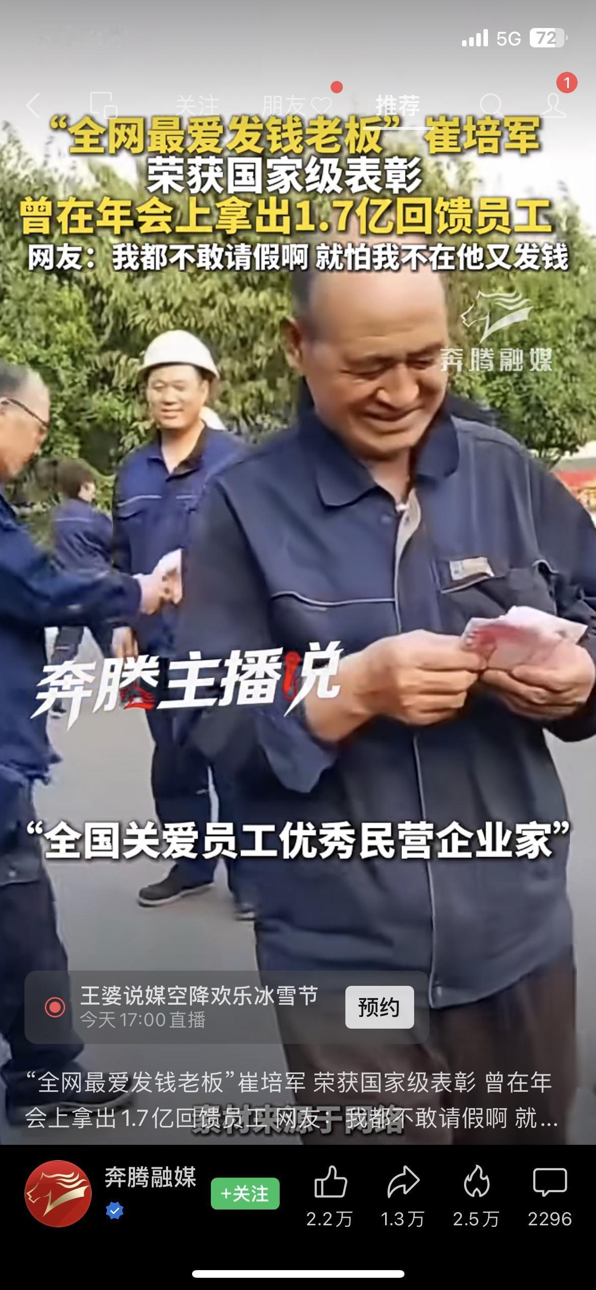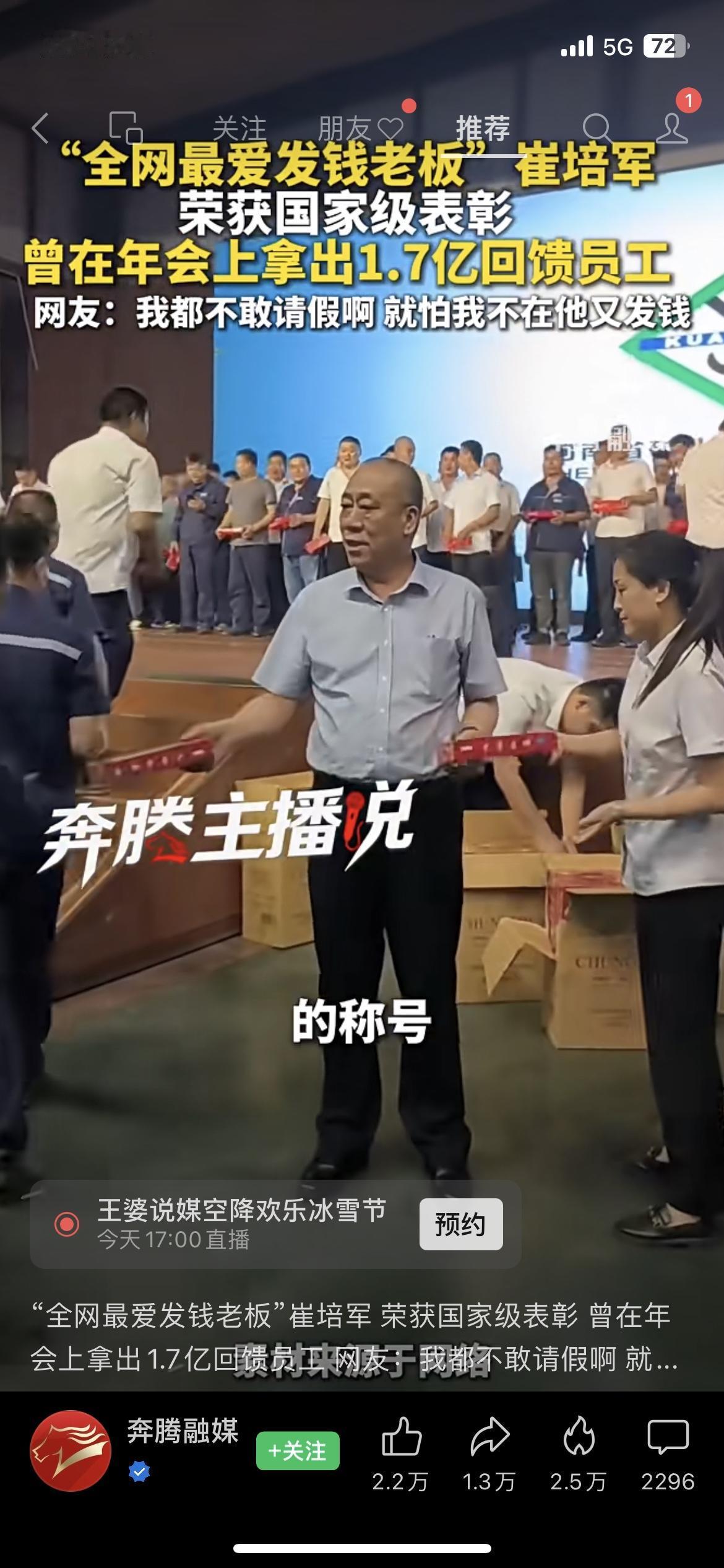 全网最爱发钱的老板崔培军,拿下国家级表彰了! 曾豪掷1.7亿现金给员工发奖金,还送豪车、给员工父母发孝亲奖,员工都说“不敢请假怕错过发钱”,如今凭关爱员工拿下官方认可,直接成了打工人心中的神仙老板!对比画饼的老板,这才是真正的留人之道!你愿意去这种真金白银发福利的公司上班吗? 崔培军 老板发钱 打工人心声