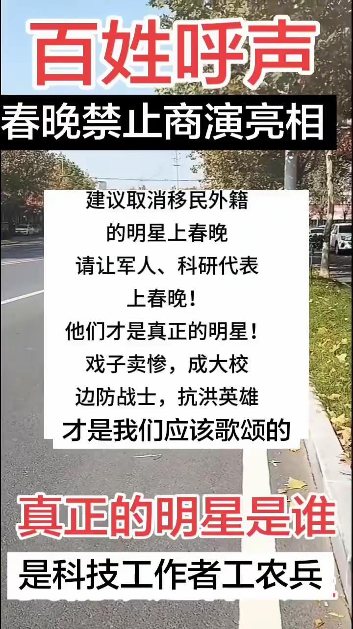 百姓呼声:春晚禁止商演亮相,建议取消移民外籍的明星上春晚。 请让军人、科研代表上春晚,他们才是真正的明星。戏子卖惨,成大校。边防战士,抗洪英雄才是我们应该歌颂的。真正的明星是谁?是科技工作者工农兵。 春晚是全国人除夕夜的精神大餐,看的就是个团圆味儿、正能量,不是给明星当带货舞台的。现在倒好,有些春晚节目里插广告跟玩似的,明星唱首歌还得提一嘴赞助商,好好的节目被割得七零八落,看着都膈应。老百姓守着电视想图个清净,结果满屏都是商业套路,这哪是春晚,分明是披着晚会外衣的推销会,完全没了过年的纯粹劲儿。 更让人不舒服的是那些换了外籍的明星,拿着外国护照还回来占春晚的坑。咱们过年团圆,他们早就不是中国国籍了,心里未必真装着这片土地,凭啥占着全国最受关注的舞台?反观那些边防战士,大过年的还在冰天雪地里站岗,风吹日晒守护国门,他们连家都回不了,却没机会在春晚上露个脸。还有抗洪抢险的英雄,洪水来了冲在最前面,用身体挡着堤坝,保护老百姓的家园,这些人才该被全国人民看见、被歌颂。 再说那些所谓的明星,拍几部戏赚得盆满钵满,稍微受点累就卖惨博同情,有的甚至还能混上个莫名其妙的头衔,真是滑天下之大稽。而科研工作者们,在实验室里熬了多少个日夜,攻克一个又一个技术难关,让咱们国家在科技上不被人卡脖子,他们的付出比明星多得多,却很少有机会走到聚光灯下。还有工农兵们,农民伯伯面朝黄土背朝天,种出养活十几亿人的粮食;工人师傅们在工厂里辛苦劳作,造出各种生活用品和工业设备;军人同志们保家卫国,守护一方平安,这些人才是撑起国家的顶梁柱,才是真正该被追捧的明星。 春晚作为国家级的晚会,传递的是社会价值观,该给老百姓树立正确的榜样。让那些移民外籍的明星和满是商业味的表演退出春晚,把舞台留给真正值得尊敬的人,让孩子们从小就知道,谁才是该追的星,谁才是国家的功臣。看着科研代表讲述为国攻关的故事,看着军人展示飒爽的风采,看着工农兵代表分享朴实的生活,这样的春晚才有意义,才能凝聚人心,才能让大家在过年的时候感受到真正的正能量。 现在的春晚确实该改改了,别再让商业气息污染了过年的氛围,别再让那些名不副实的明星占着宝贵的资源。把舞台还给真正的英雄,还给那些为国家、为人民默默奉献的人,这才是老百姓真正想看的春晚。各位读者你们怎么看?欢迎在评论区讨论。