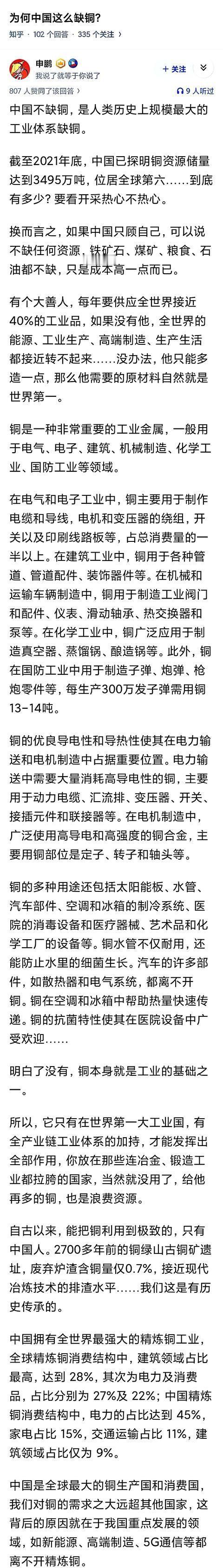 为何中国这么缺铜? 洋人以为我们依赖进口原材料,可是他们不知道他们更依赖我们的工业品。 中国铜消费量占全球一半,主要因为工业体量巨大。国内铜矿资源总量全球第四,但分布零散,主要集中在江西、云南、安徽等地。小型矿床占比超八成,开采地质条件复杂,地下水干扰多,成本居高不下。平均矿石品位低于国际水平,炼制杂质处理耗时,产量难以快速提升。相比之下,智利矿区品位高,采掘效率强,中国铜精矿自给率仅一成左右。 工业扩张拉动铜需求激增。电器制造领域,电线、变压器、马达大量使用铜材。每年数亿台家电电子产品出厂,铜消耗规模庞大。一辆混动车电机铜量8.9公斤,纯电动车12.3公斤,加上线束总计83公斤。2023年新能源车产量逾九百万辆,年铜需求增数十万吨。空调冰箱每台铜用量几公斤到十几公斤,中国出口占比全球多数。 电网建设和城市化进一步推高用量。铜电缆用于高压传输,线路扩展覆盖新区域。铜加工产量持续上升,但原料依赖进口,从智利、秘鲁、澳大利亚输入铜精矿和粗铜。2024年进口铜精矿实物量2750万吨,金属量650万吨,创历史高点。精炼铜消费占全球近六成。 全球供应链紧张放大短缺问题。2022年智利产量降7.5%,直接影响中国输入。经济高速增长阶段,铜价2003至2007年因需求驱动大幅攀升。回收体系提取伴生金属如金银锌铅,但回收率低,无法弥补缺口。环保政策严格,小型矿山关停减少供给。 铜在新兴领域不可或缺。AI数据中心电力需求大,铜导电性能优异,无合适替代品。世界级工业需要全球资源分配,中国出口电缆板材管材满足多国市场。如果进口中断出口减半,其他国家产能难填补,铜价全球飙升。 国内资源禀赋限制自给率下降。供应链易受地缘因素干扰,贸易争端加剧不确定性。中国精炼铜产量占全球一半以上,但矿石进口依赖暴露漏洞。联合国警告铜短缺可能延缓能源转型和技术进步。