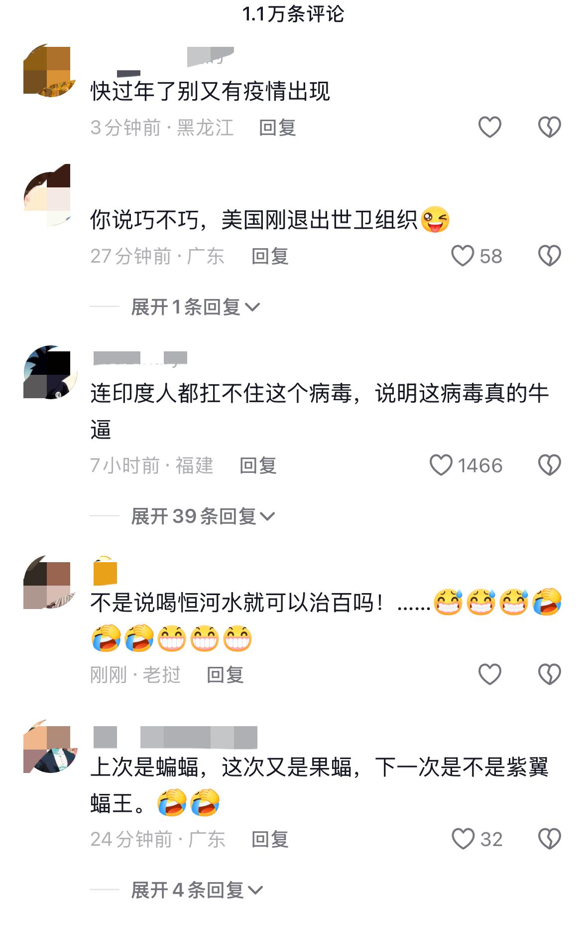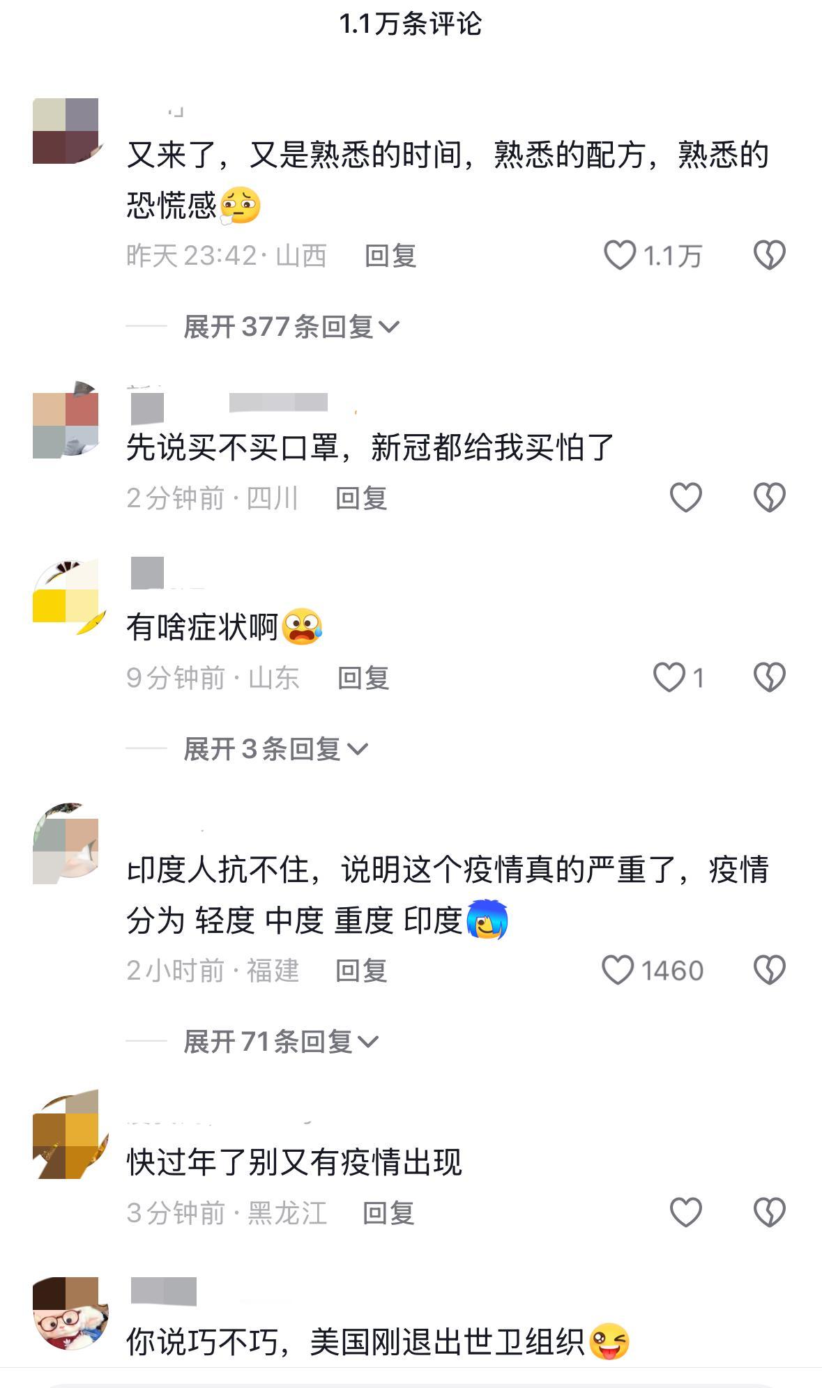 看到这个新闻, 太可怕了, 真的好绝望, 又出现一种新型的病毒, 可直接人传人, 致死率高达70%, 回想起上次的疫情, 被封在家里、不让外出,无法工作, 不能出门买菜, 甚至连解决温饱问题都是个事, 不想再经历一次疫情了, 经历一次绝望一次, 网友说:熟悉的配方, 熟悉的套路,熟悉的时间。 难道这次…… 哎,不敢想象,马上就要过年了,历史不要再重演了……