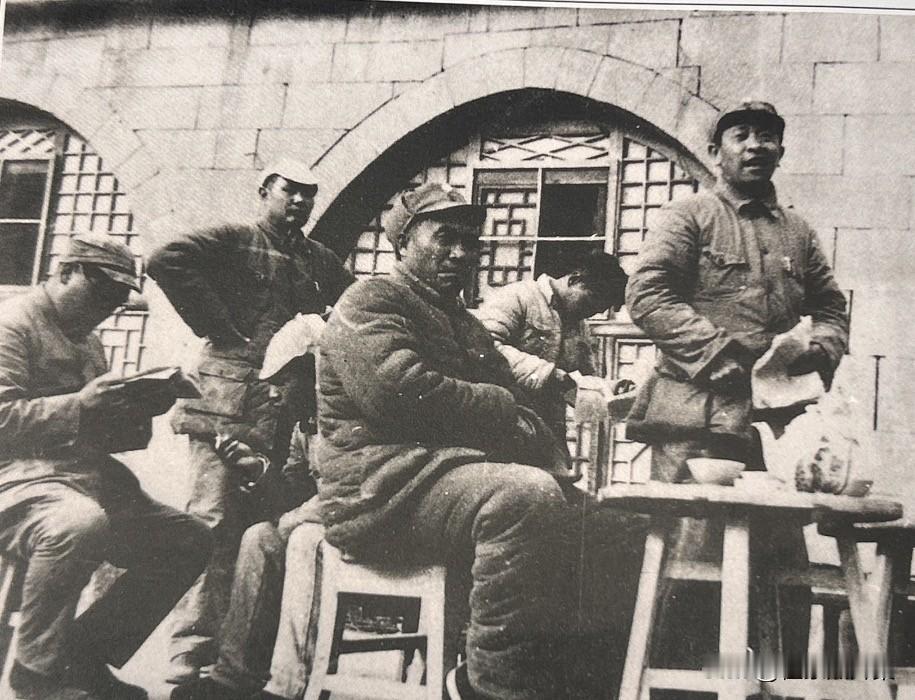 1940年10月,延安王家坪,我军高层为“自力更生、克服封锁”召开一次关键会议——军工生产会议。照片中自左至右分别是:李涛(八路军后勤部经济建设部部长)、叶剑英(八路军总参谋长)、朱德(八路军总指挥)、叶季壮(八路军后勤部部长)、李强(八路军军工局局长)。
