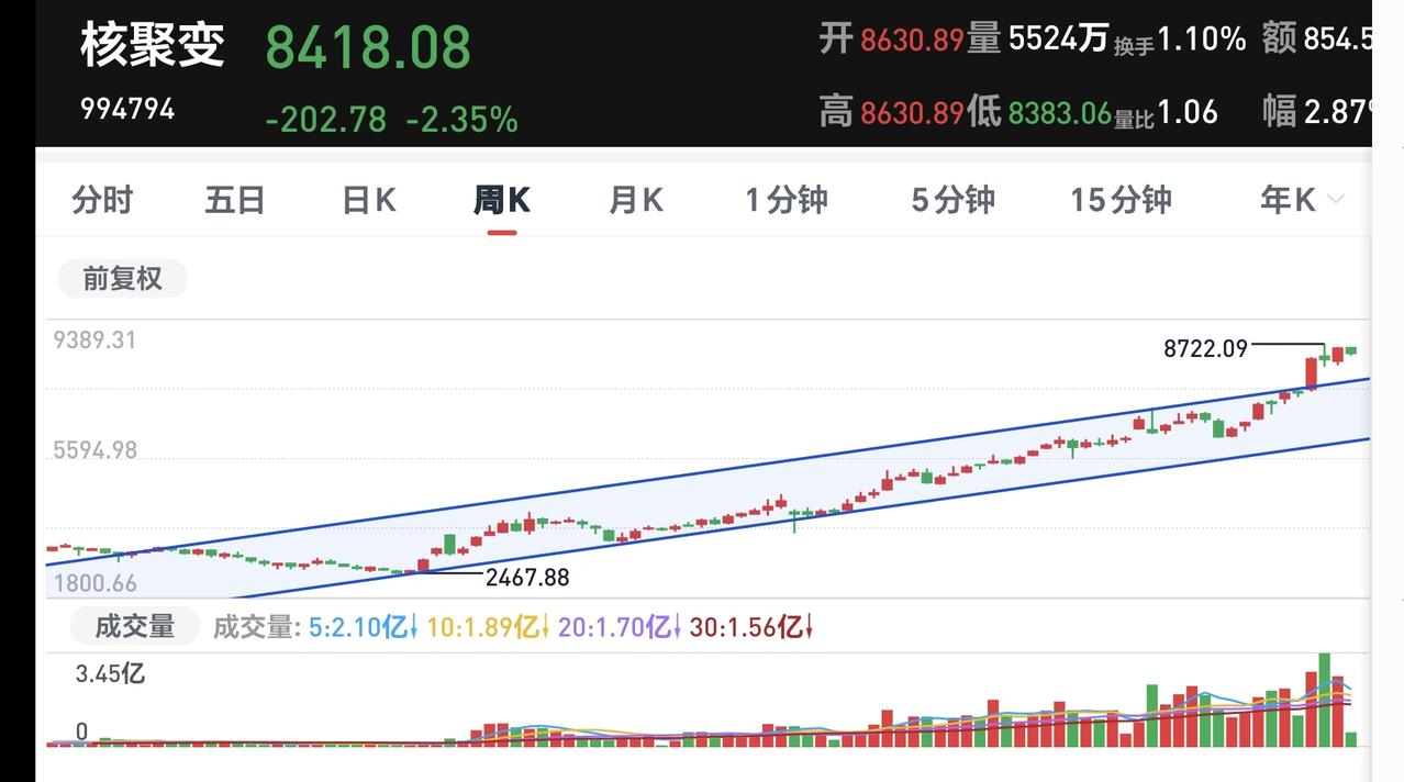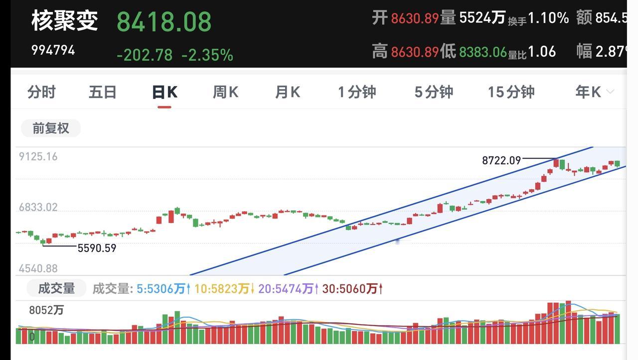 基金:热门板块现在就是一个烫手的山芋 欧洲市场现在是涨跌不一,英国上涨了0.07%,德国下跌了0.19%,法国下跌了0.33%,涨跌幅度都很小。 香港市场今天也是涨跌不一,恒生指数上涨了0.06%,国企指数下跌了0.15%,恒生科技指数下跌了1.24%。 图3是今天基金的加仓排行榜,图4是今天基金的减仓排行榜,图5是今天基金的持有人数飙升榜,图6是今天基金的加仓人数和减仓人数,今天加仓99706035人,今天减仓26023764人,今天加仓人数超过了减仓人数。 我们来看一下下面的截图7,这是上证指数日K线图,我把这幅图进行了放大,只看最近一段时间以来的K线,也就是4190点以来的K线,看每一个交易日的K线所对应的成交量,你发现没有,除了上周五的上涨是放量的,其他的阳K线都是缩量,阴K线都是放量,这说明上涨的时候,资金不愿意进场,下跌的时候,有资金在离场,今天主力资金的净流出就达到了1000亿以上,见下面的截图8,从这个角度看,近期需要谨慎。 持有的基金净值大部分已经更新,上涨幅度最大的三个板块是:中证50板块,证券板块,海外互联网板块,下跌幅度最大的三个板块是:可控核聚变板块,军工板块,先进制造板块,净值暂时亏损了9277元。 看下面的截图11,这是可控核聚变板块日K线图,现在的位置处于这个上涨通道中,距离上涨通道的下轨线比较近,短线持有的人,观察会不会跌破这个上涨通道的下轨线,如果破位,就需要考虑要不要止盈出来观望。 看下面的截图12,这是可控核聚变板块周K线图,现在的位置处于这个上涨通道的上方,长线持有的人可以继续持有,但现在不建议追涨进场。 现在最安心的就是半仓持有的人,还有那些手上没有热门板块的人,热门板块现在就是一个烫手的山芋,扔了舍不得,拿在手上又实在有点烫手,这个时候最需要注意的是,原来手上没有烫手山芋的时候,不应该在这个时候来接手烫手山芋。 大家帮忙评论,点赞,转发和分享,谢谢大家的支持。