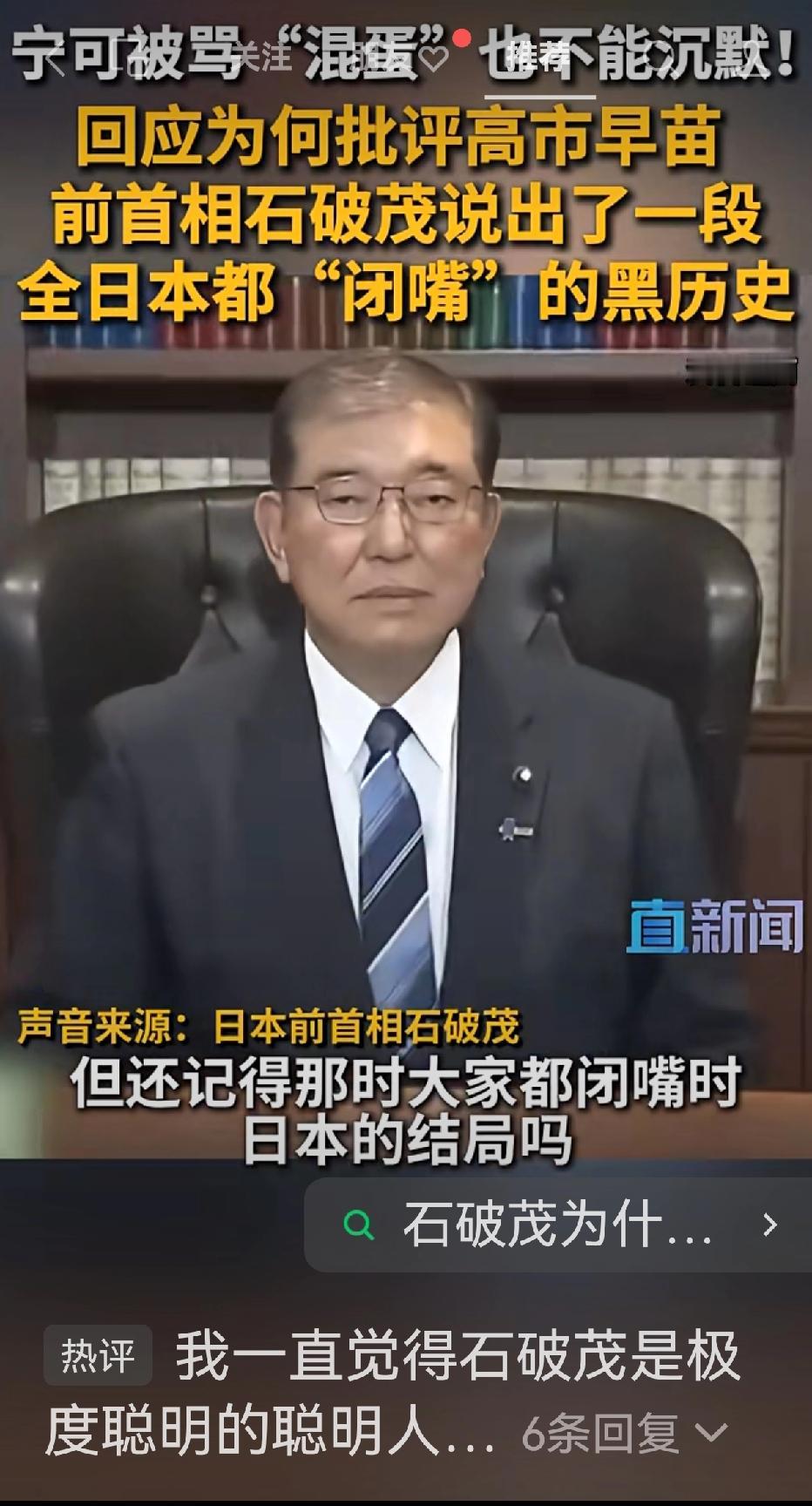 石破茂算个人物!他讲出了全日本都 “闭嘴” 的黑历史,堪比 “世人皆醉其独醒” 的良心感慨,称得上是一个日本真正的有民族良知的政治家。 石破茂是真敢说啊!全日本都不敢提的二战黑历史,就他敢站出来讲,妥妥是有民族良知的政治家,太难得啦! 二战那会儿,日本的政治被激进的领土扩张想法带偏了。 大家都觉得靠武力在东亚抢地盘是对的。 上到天皇,下到普通老百姓,都认这个理。 那些清醒的、有良知的人,也被卷在里面身不由己。 没人敢站出来说反对的话。 最后日本打了败仗,还成了世界上唯一被原子弹轰炸过的国家。 有网友表示:小石应该成为日本的大人物,是小日本有眼无珠弃用了他,日本人终究会走入平常 还有网友认为:石破茂是唯一一个讲出要在夏威夷驻军的日本首相,他说美日同盟要平等。他才是真正有骨气的日本右翼。 笔者认为,日本石破茂,才是日本看破一切,头脑最灵敏,思想觉悟最高的一代日本首相,具有高深莫测长远指向,也是日本当代重要人物,当代日本缺他会相当危险。 日本现在就缺石破茂这样敢说真话、看得长远的人。敢直面历史,才能找准方向,要是没了这样的人,日本未来的路只会更难走。