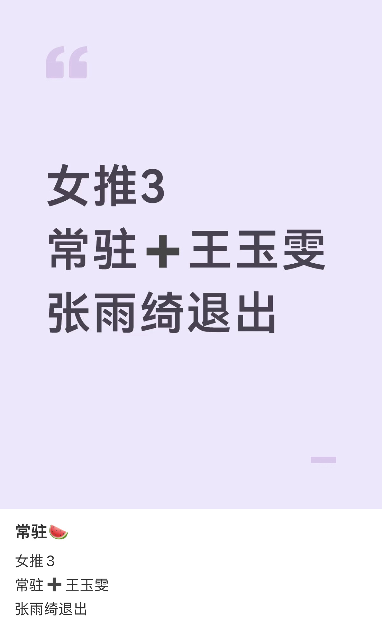 女推3 换人网传张雨绮或退出女推3 网传女推三要换成王玉雯了,真的假的?就最近的事情来看张雨绮确实是个大雷,退出去也好,王玉雯综艺感也挺强的,不过粉丝意见还挺大的。