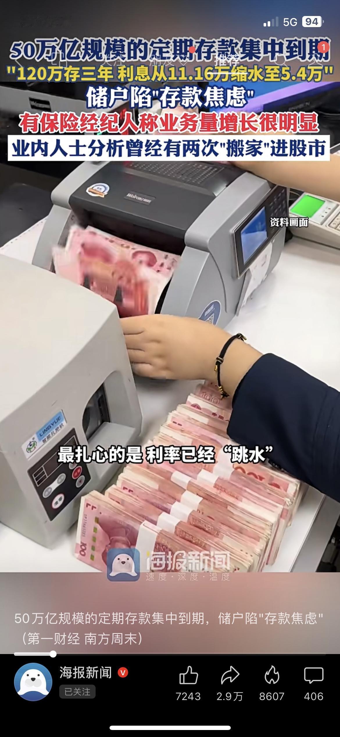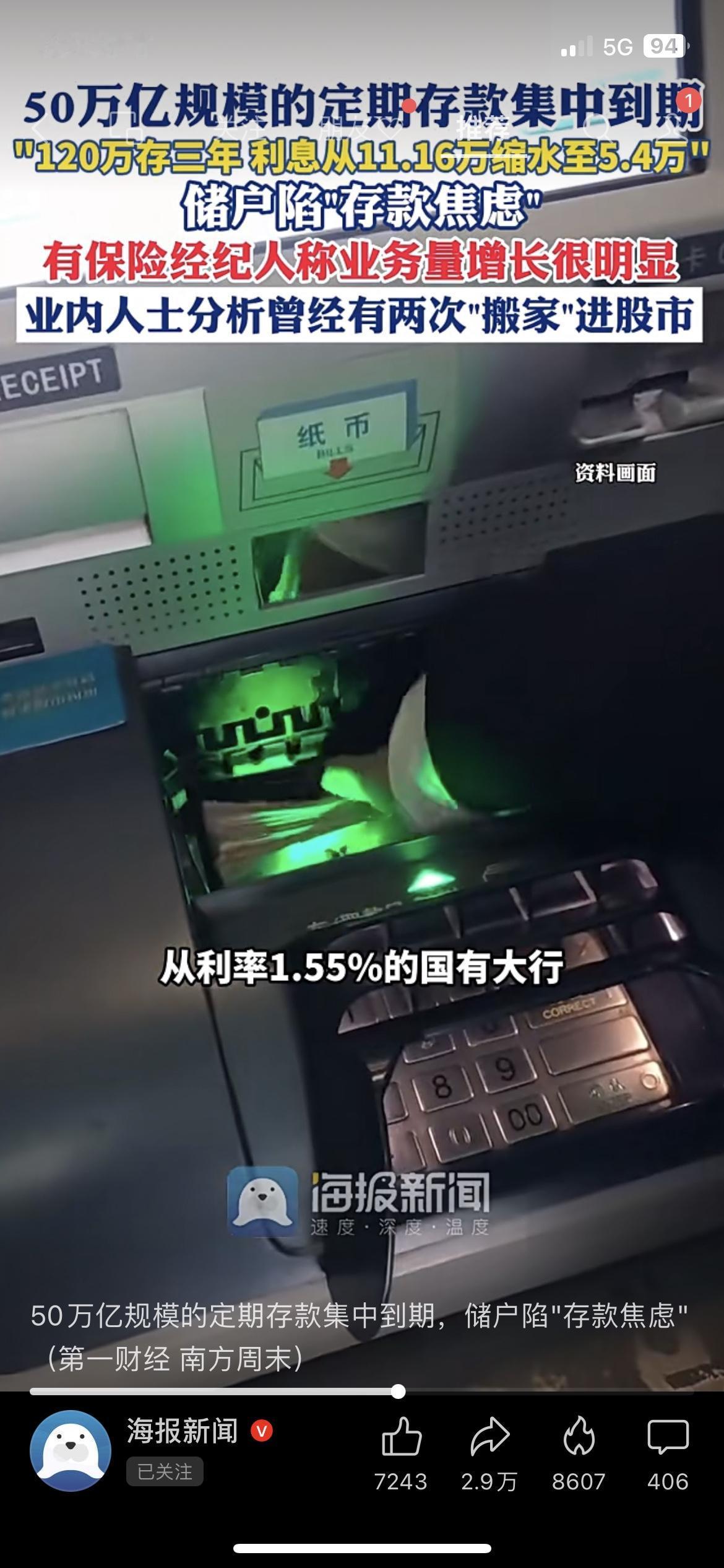 50万亿定期存款集中到期,储户陷入“存款焦虑”! 20万存三年,利息从2.07万直接缩水到9000元,利息砍半让很多人慌了神,不少储户开始转向保险或理财。这波存款到期潮,不仅考验普通人的理财选择,也影响着整个金融市场的资金流向!你会把到期的存款转投其他理财吗? 定期存款 理财焦虑 财经热点 民生经济 市场有风险,投资需谨慎