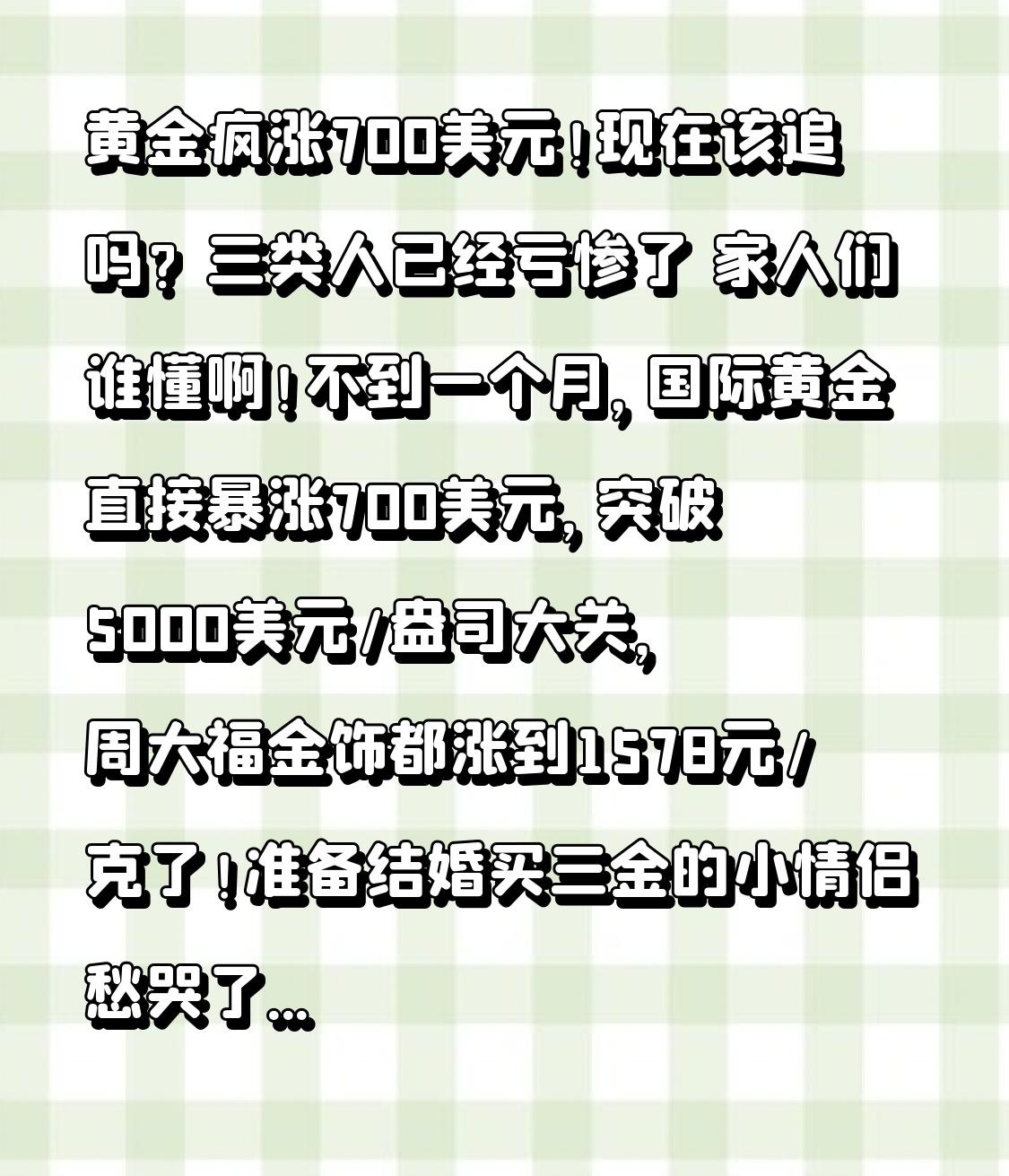 黄金疯涨700美元!现在该追吗?三类人已经亏惨了 家人们谁懂啊!不到一个月,国际黄金直接暴涨700美元,突破5000美元/盎司大关,周大福金饰都涨到1578元/克了!准备结婚买三金的小情侣愁哭了,去年同款金镯1300元/克,现在买直接多花两万块;而投资群里有人晒出10万本金赚1万的收益,评论区全在问“现在上车还来得及吗?” 先给大家算笔直观账:1月1号伦敦金才4300美元/盎司,现在已经冲到5071美元,26天暴涨16%,比不少人一年工资还高!这波涨势到底靠啥?核心就两个硬逻辑:一是全球央行疯狂扫货,中国央行连续14个月增持,波兰刚宣布再买150吨,大家都在靠黄金对冲风险;二是地缘紧张+美联储降息,美元贬值让黄金成了“硬通货避风港”。 但这里藏着个大转折!越涨越多人跟风,却有人已经亏到血本无归。河南老张加杠杆炒黄金TD,五天就把十年积蓄亏光还倒欠平台五万;上海李女士在品牌店买金镯想投资,变现时才发现工艺费全蒸发,每克亏了400多。关键坑就两个:把“饰品金”当投资品,工费溢价让你买入就亏;盲目加杠杆,金价稍微回调就爆仓。 其实现在市场已经分裂成两派:机构集体看涨,高盛预测年底能到5400美元;但普通投资者却慌了,怕追高站岗又怕踏空。给大家三个接地气的建议:刚需买三金的,别硬扛高价,选轻克重简约款,总预算能省不少;想投资的,别碰金饰和杠杆,用黄金ETF定投,门槛低还能平滑风险;纯想跟风的,记住仓位别超总资产10%,别把避险资产玩成投机赌博。 这轮黄金暴涨,本质是大家在不确定的市场里找安全感。但老话讲“盛世藏玉,乱世藏金”,咱们普通人要的不是一夜暴富,而是稳稳的幸福。与其被行情牵着鼻子走,不如根据自己的需求理性布局。最后问一句:你是准备抄底还是观望?评论区聊聊你的看法!