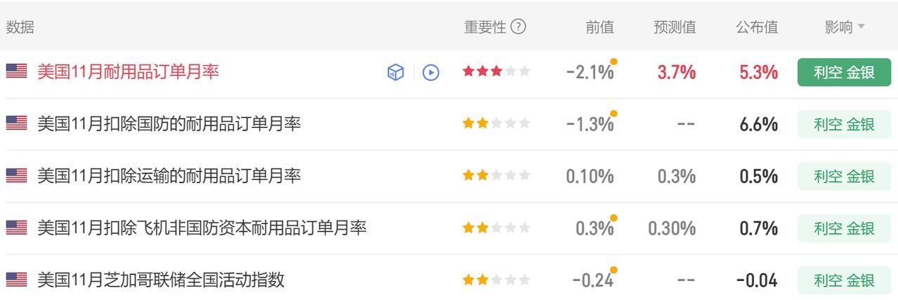 今晚多项美国经济数据公布。 首先美国11月耐用品订单月率 5.3%, 为2025年5月以来最大增幅; 市场预期3.7%,前值由-2.20%修正为-2.1%。 其次美国11月芝加哥联储全国活动指数 -0.04,前值-0.21。 最后美国11月扣除运输的耐用品订单月率 0.5%, 市场预期0.3%,前期数值0.10%。 还有美国11月扣除飞机非国防资本 耐用品订单月率 0.7%,市场预期0.30%, 前值由0.50%修正为0.3%。 这几项数据都是利空金价的, 数据公布以后,国际金价有所下滑, 但是没能大幅回撤。