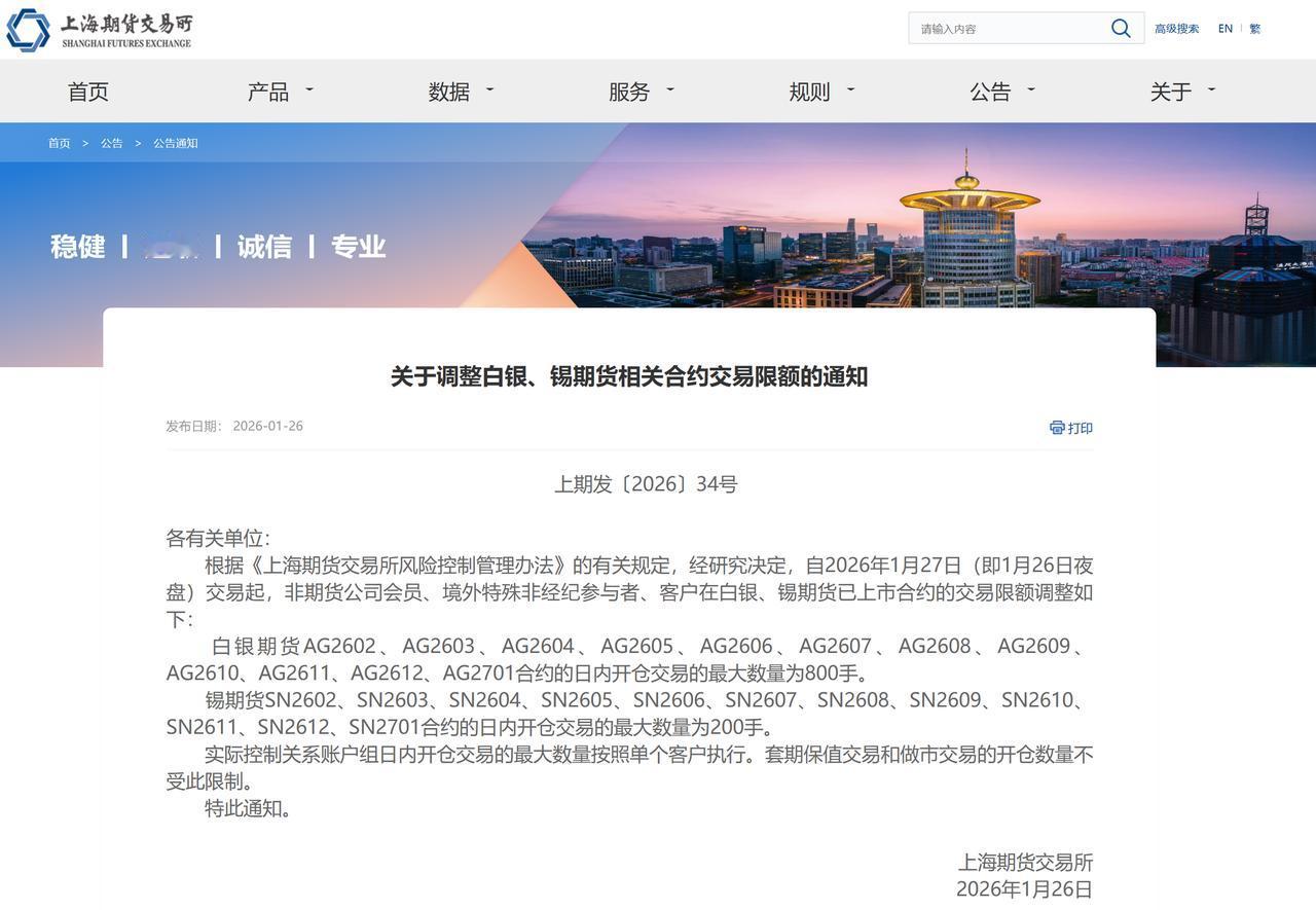 黄金和白银是否还有上涨空间呢? 随着本周白银期货价格 不但飙升,再创新高; 周一盘中涨停,让所有的投资者 目瞪口呆! 面对疯狂的贵金属, 特别是白银期货价格。 今日交易所再度出台政策, 对其交易限额进行调整: 白银期货AG2602、AG2603、AG2604、 AG2605、AG2606、AG2607、AG2608、 AG2609、AG2610、AG2611、AG2612、 AG2701合约的日内开仓交易的最大数量为800手。 能对不断飙升的银价有所压制?